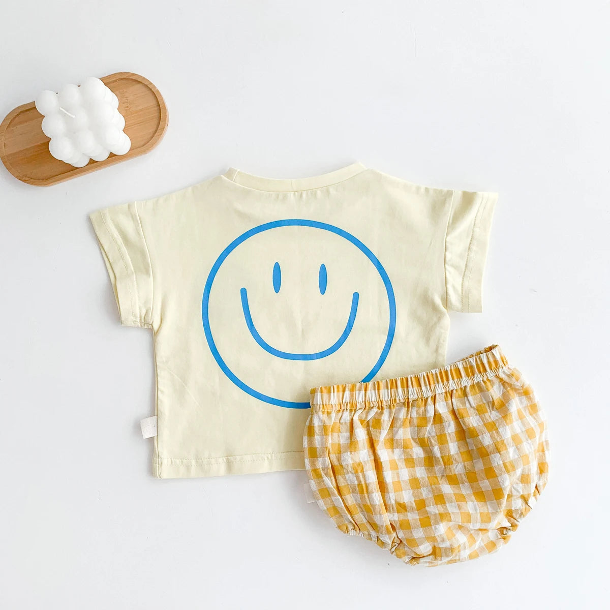 Smile Face Cotton T-shirt + Plaid Shorts Set: Summer Baby Outfit