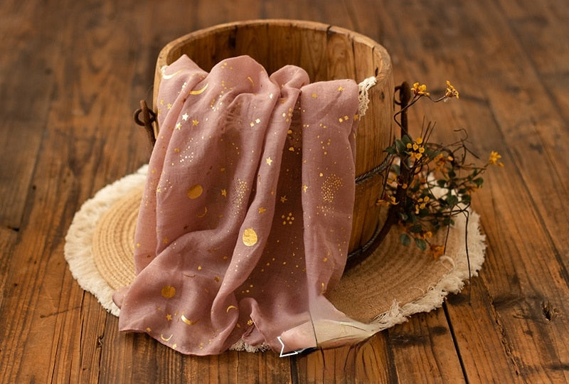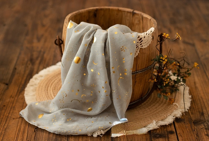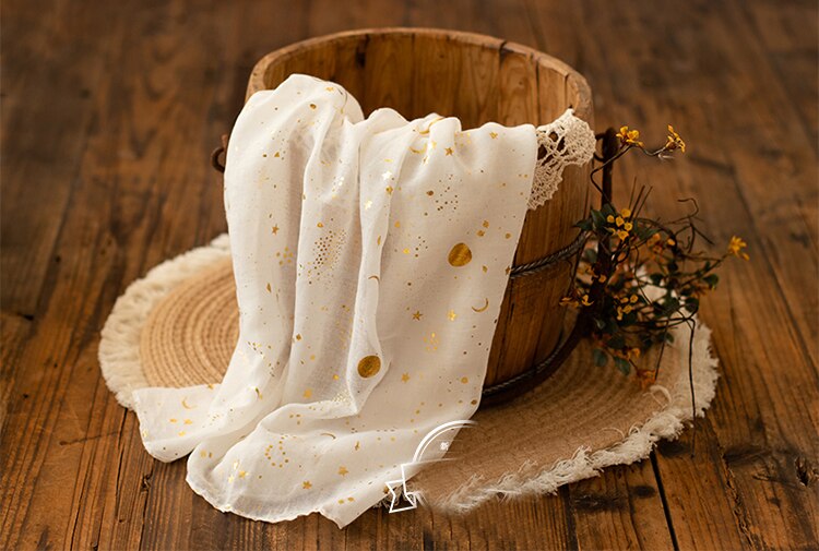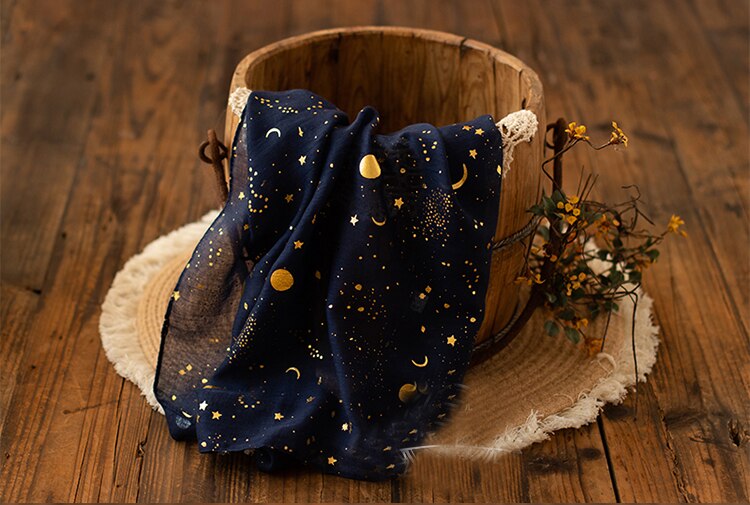 Ein weicher Stoffbezug mit Stern- und funkelndem Mondmuster setzt ein Highlight im Fotohintergrund für Ihr Baby. Dieser Stoffbezug kann als Baby-Pucktuch verwendet werden, und das Material ist sanft zur empfindlichen Babyhaut.