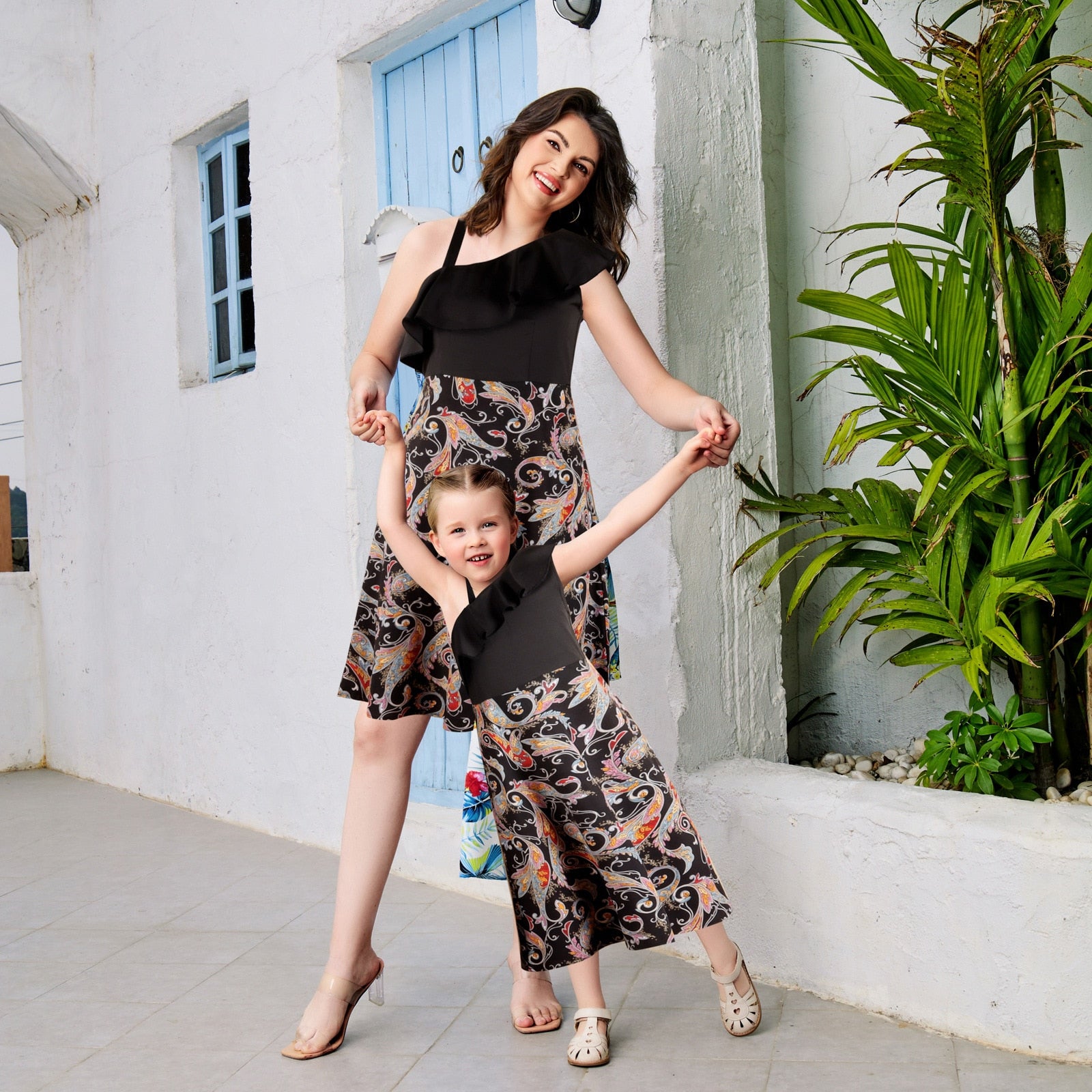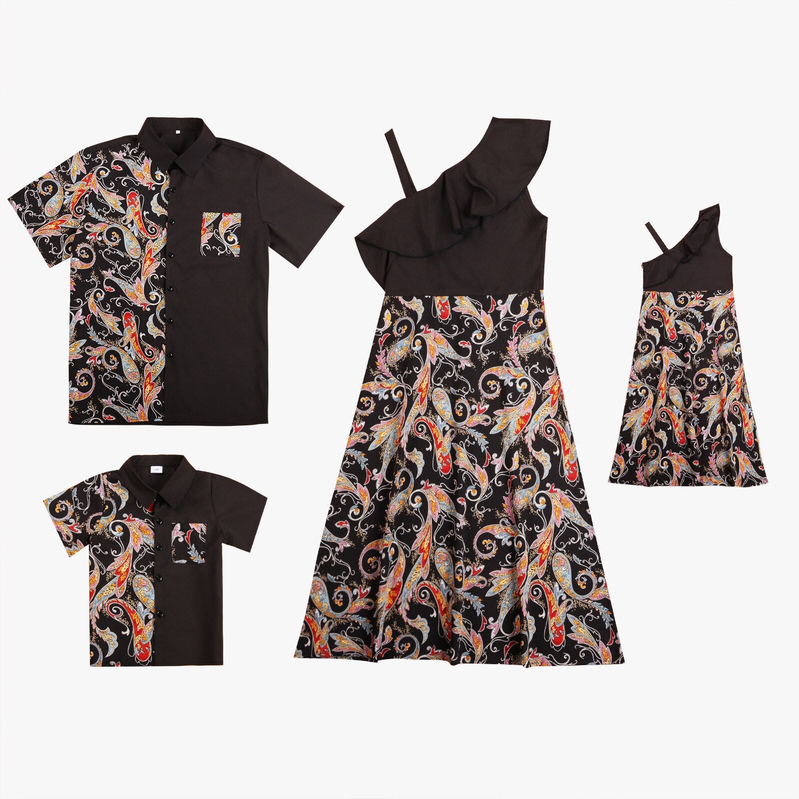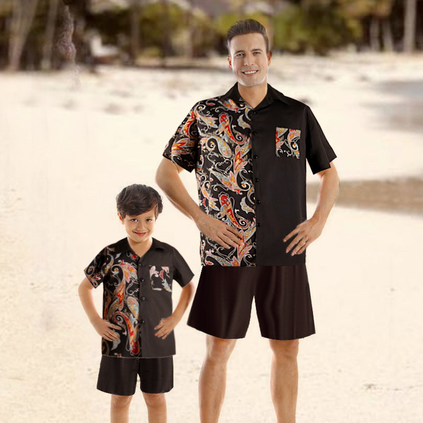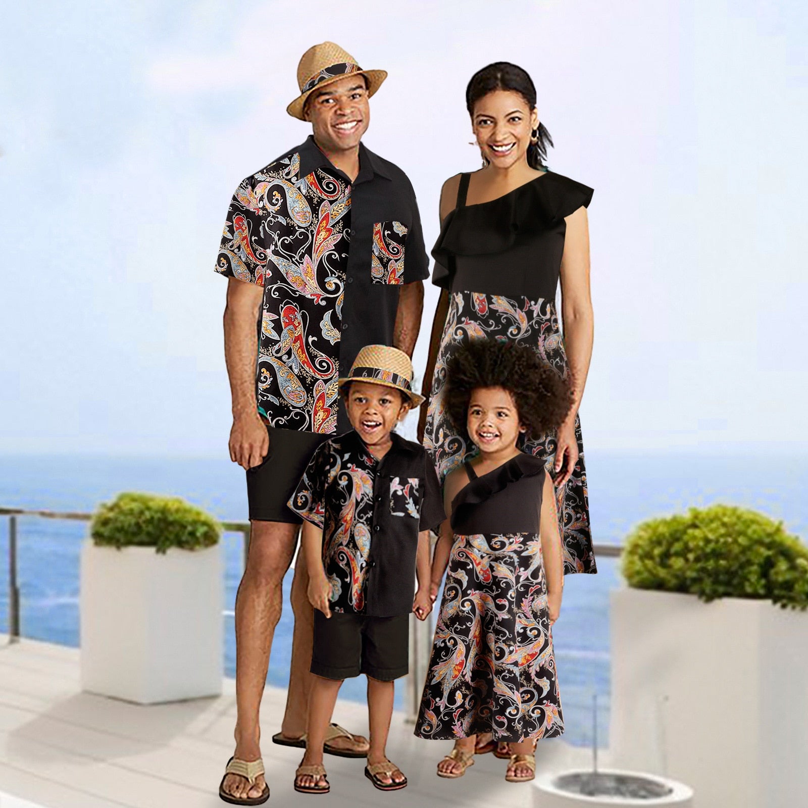 Bekleidungsset für die ganze Familie für Urlaubsreisen. Mit einzigartigen und ausgefallenen Mustern sowie modernen und trendigen Designs. Die Hauptfarbe ist geheimnisvolles Schwarz, das dem Träger einen besonderen Akzent verleiht.