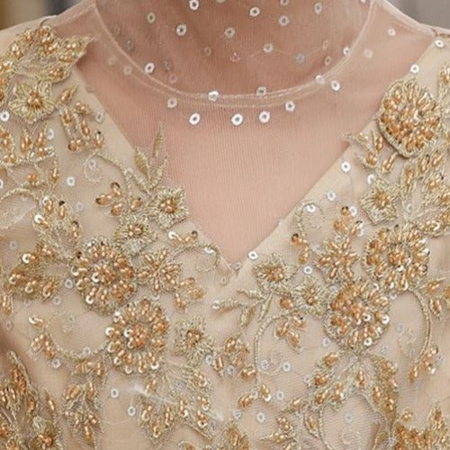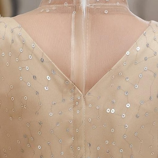 Vestido de gala línea A con mangas abullonadas y top bordado con lentejuelas