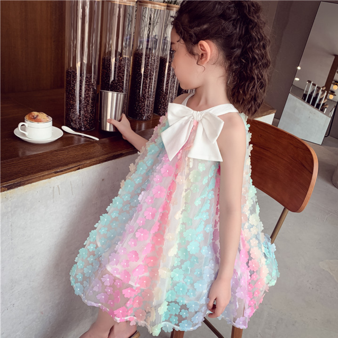 Dieses ärmellose Prinzessinnen-Sommerkleid mit Blumen und Regenbogen in knielanger Ausführung ist sehr niedlich und passt perfekt zum Modestil Ihrer kleinen Prinzessin. Es kann sowohl auf Partys als auch im Alltag getragen werden.
