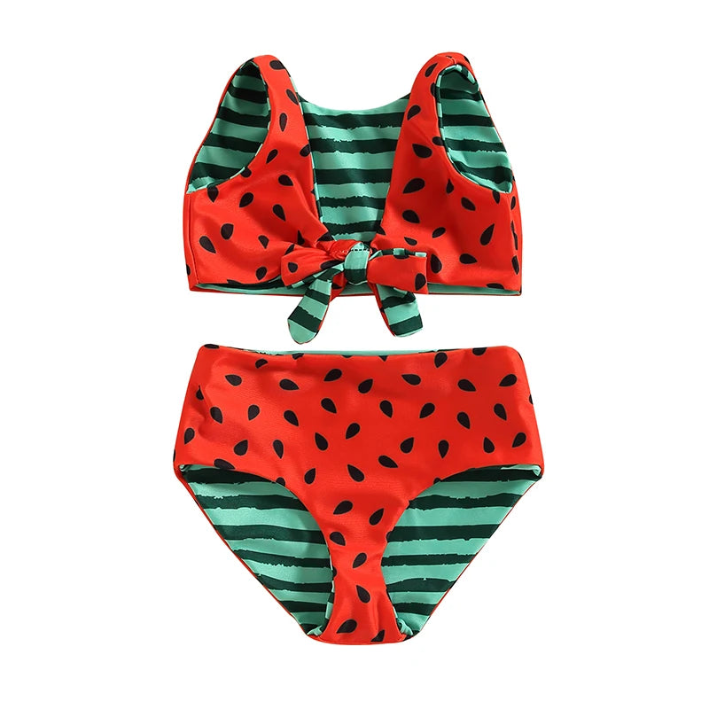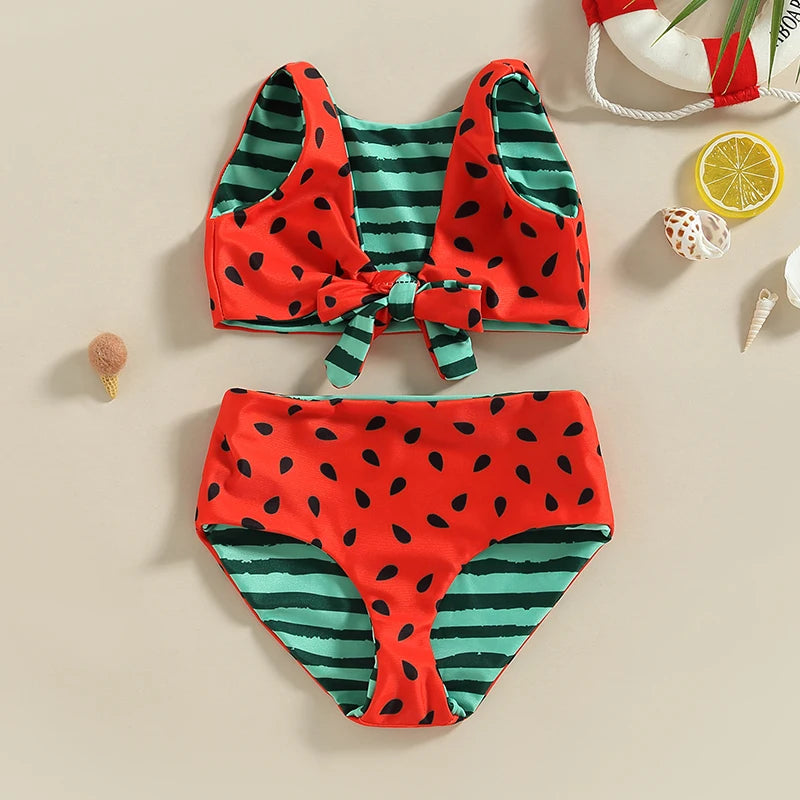 Watermelon Print Striped Swimsuit: Kid Girl's Two-Piece Beach Bathing Suit