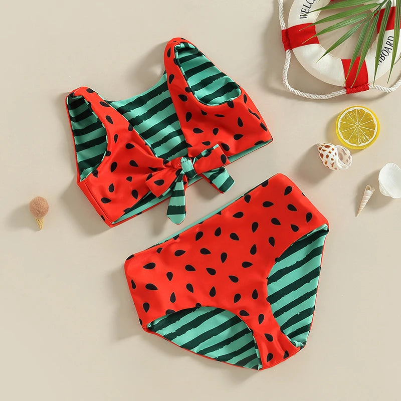 Let your little girl make a splash in style with our adorable two-piece swimsuit featuring a fun watermelon print and striped design. It's sure to stand out at the pool or beach!
