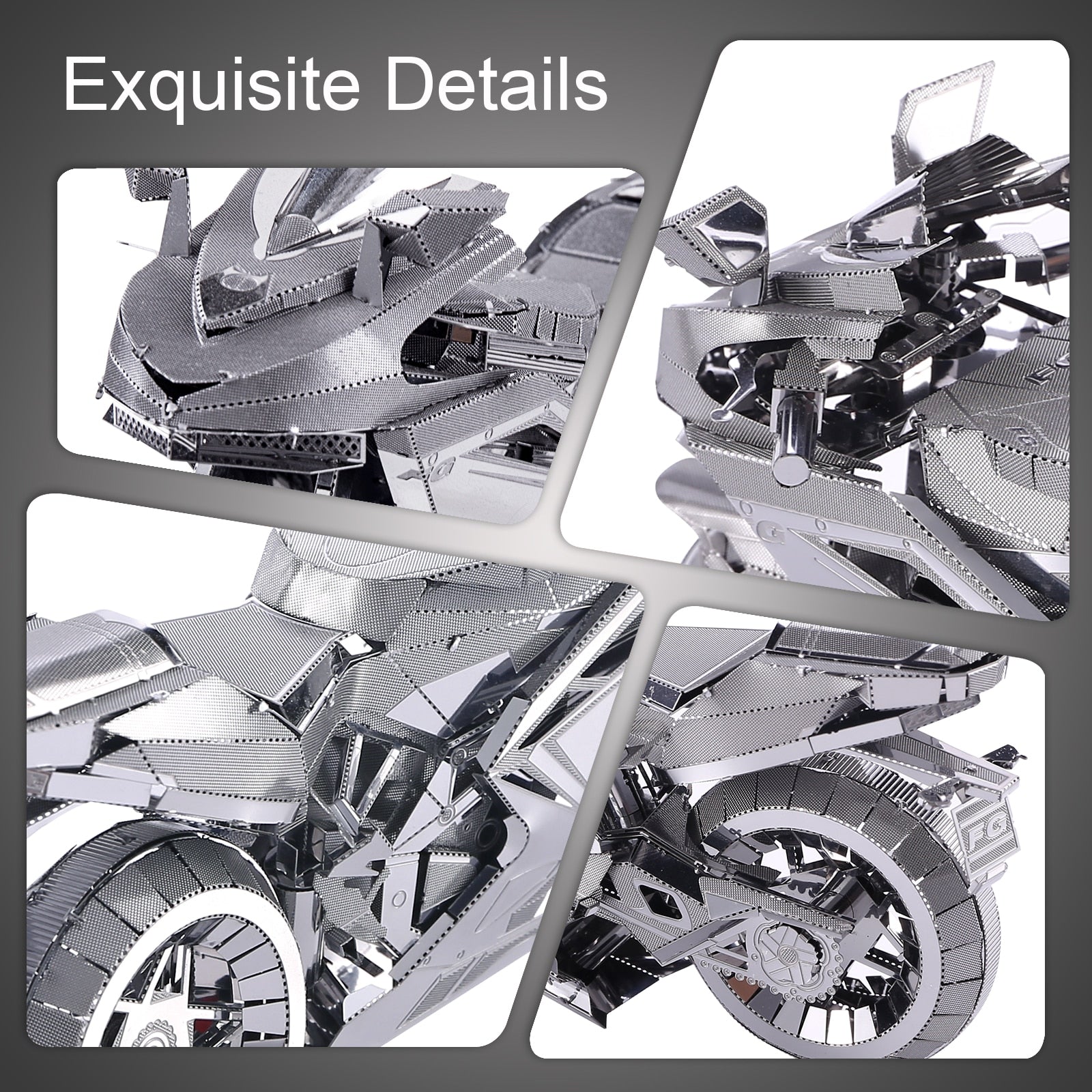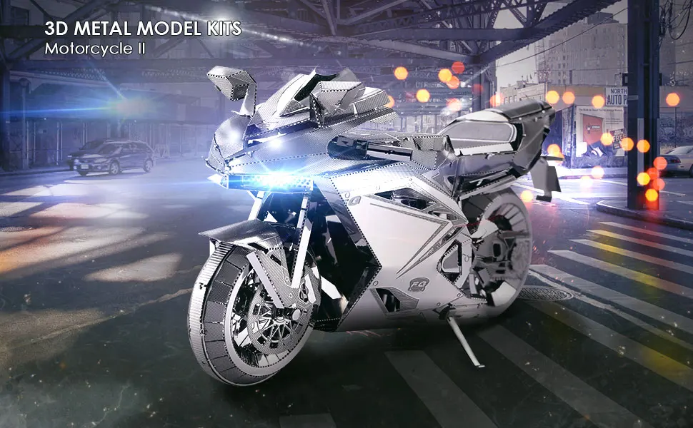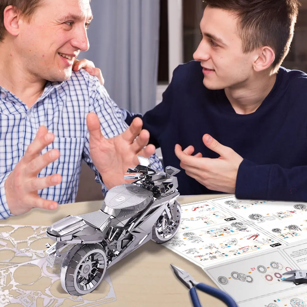 Stellen Sie sich ein atemberaubendes silbernes Rennmotorrad auf Ihrem Regal oder Schreibtisch vor – mit diesem 72-teiligen Edelstahlbausatz können Sie es bauen! Nach anspruchsvoller Bauarbeit entsteht ein fertiges Modell mit stromlinienförmiger Verkleidung, kompakter Struktur und extrem dynamischer Karosserie. Es vermittelt ein starkes Gefühl von Bewegung, selbst wenn es nur dasteht.