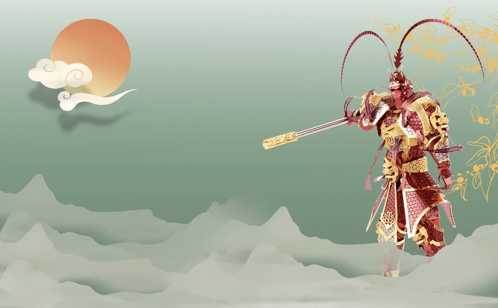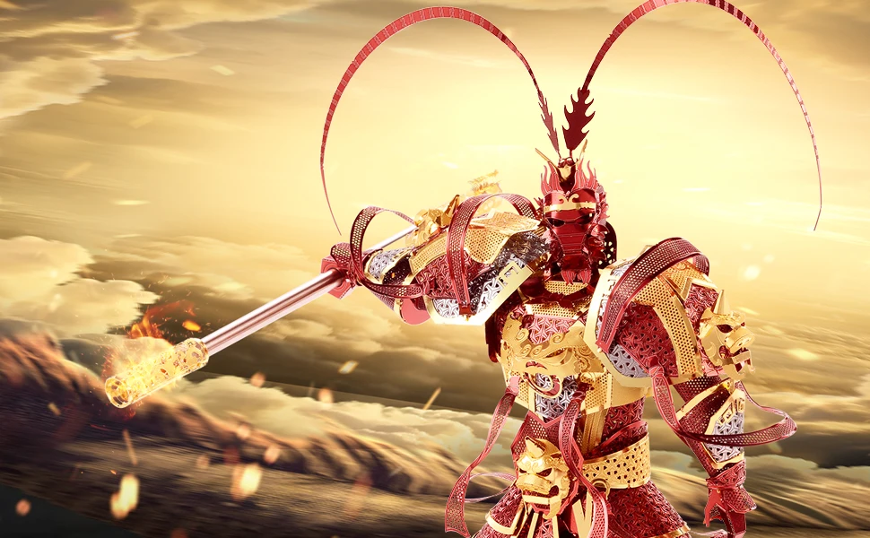 Das 3D-Metallmodell des Affenkönigs simuliert eine berühmte Figur aus der chinesischen Mythologie, die aus einem der vier Meisterwerke „Die Reise nach Westen“ stammt. Geboren aus dem unsterblichen Stein, wurde er zum König aller Affen, indem er die Affengruppe in die Wasservorhanghöhle führte und als „König der Affen“ verehrt wurde. Er ist klug, lebhaft, loyal und von Natur aus hasserfüllt. Er trägt eine goldene Kettenrüstung, Phönixflügel und eine purpurgoldene Krone auf dem Kopf, hält einen goldenen Knüppel in den Händen und läuft auf Wolkenschuhen.