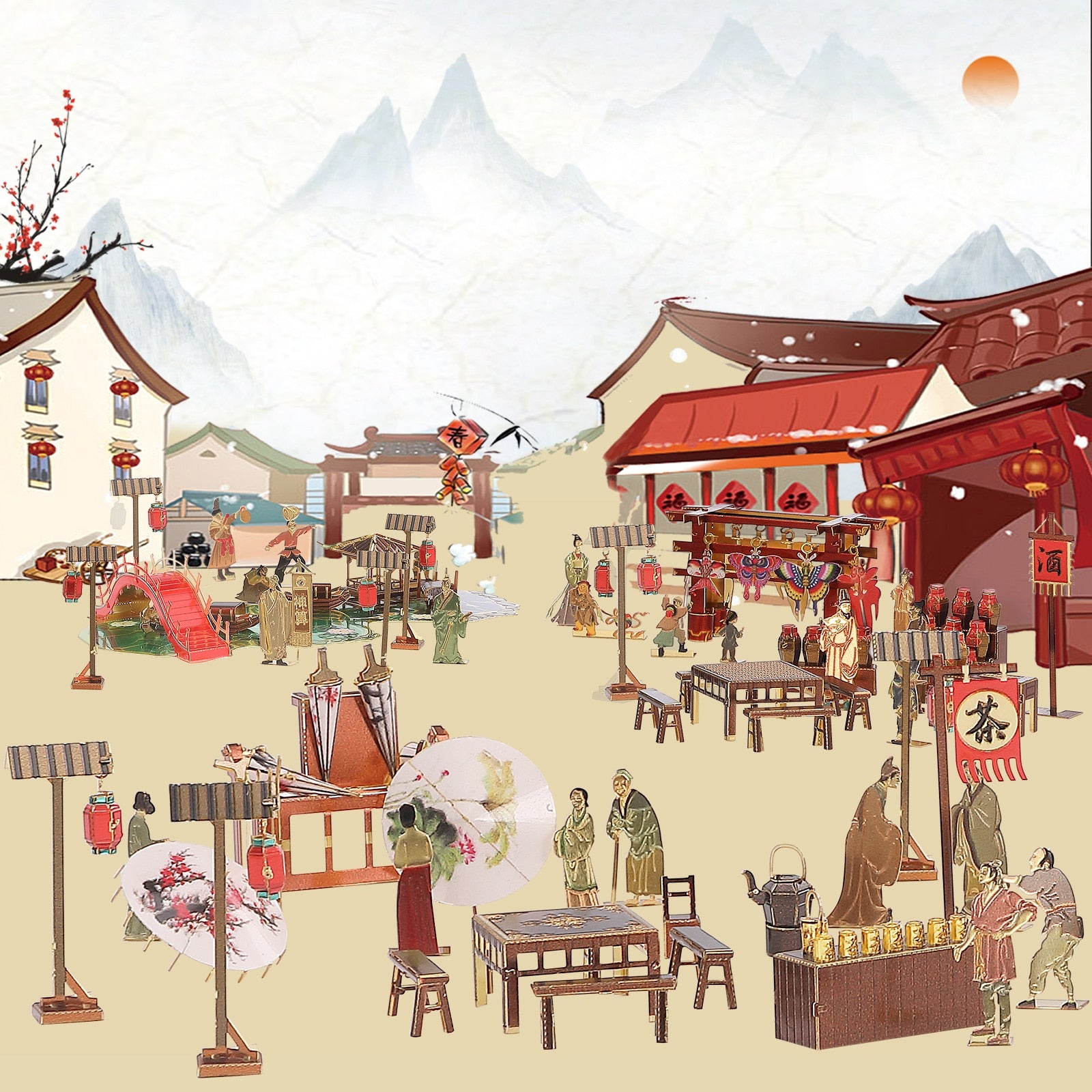 Tang Dynasty Scenery 3D metal assembly model simulates the scene of the market of people in Tang Dynasty China. Design with lots of detail and sharp and sharp colors. Have a good time installing it.