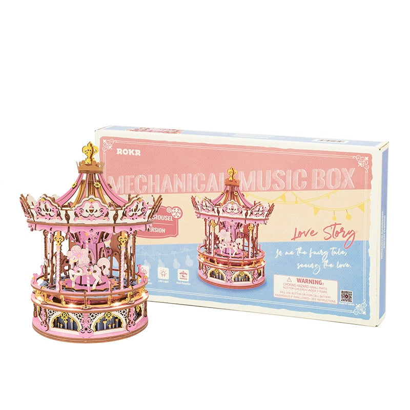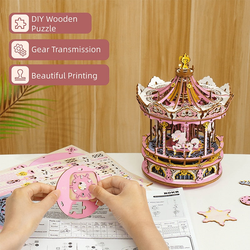 Eine perfekte Kombination aus romantischem Karussell und coolem mechanischem Holzpuzzle in einer Spieluhr. Baue es mit deinen eigenen Händen und lass dich von der schönen Musik und der traumhaften Atmosphäre umgeben!