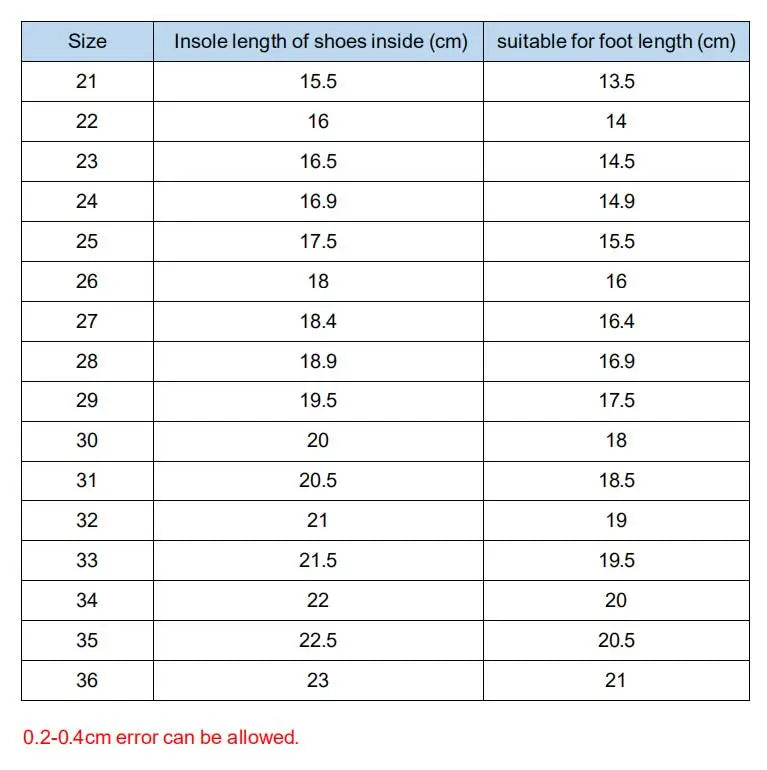 - Größenbereich: Erhältlich in den Größen 21 bis 36, mit einer Innenlänge, die ca. 2 cm länger ist als die Fußlänge.