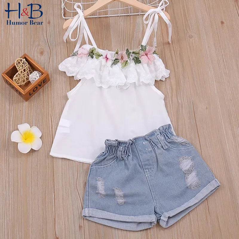 Verleihen Sie Ihrem kleinen Mädchen Stil und Spaß mit unserem modischen Outfit – Neckholder-Top mit Blumenmuster + Jeansshorts!