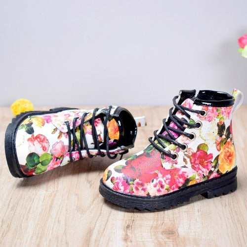 - Knöchelhohe Combat-Boots mit Blumenmuster überall.