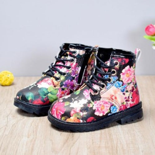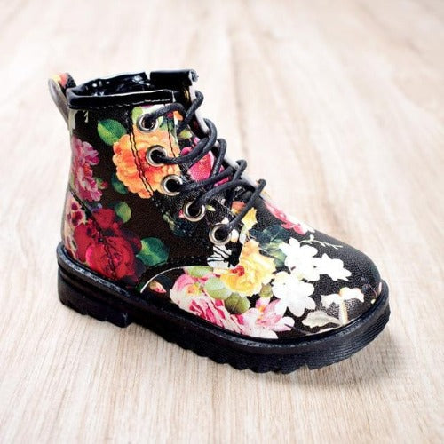 Die Verschmelzung von etwas Maskulinem und etwas Femininen bringt ein cooles Produkt hervor. Dieses Paar wasserabweisender Boots mit Blumenmuster ist eine Verbindung aus maskulinen und femininen Elementen. Die floralen Muster auf dem Stiefel mildern die starken Merkmale der geschnürten Combat-Boots ab. So ein cooler Winterschuh, der perfekt zum Outfit Ihres Babys passt!