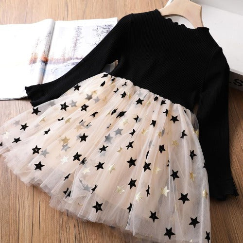 Váy Bé Gái Tay Dài Lưới Họa Tiết Ngôi Sao