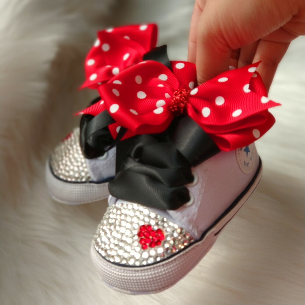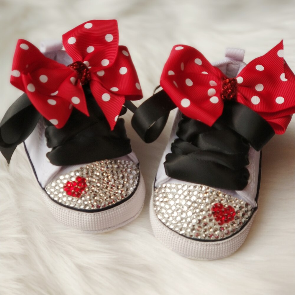 - Wunderschöne handgefertigte Babyschuhe mit niedlicher gepunkteter Schleife.