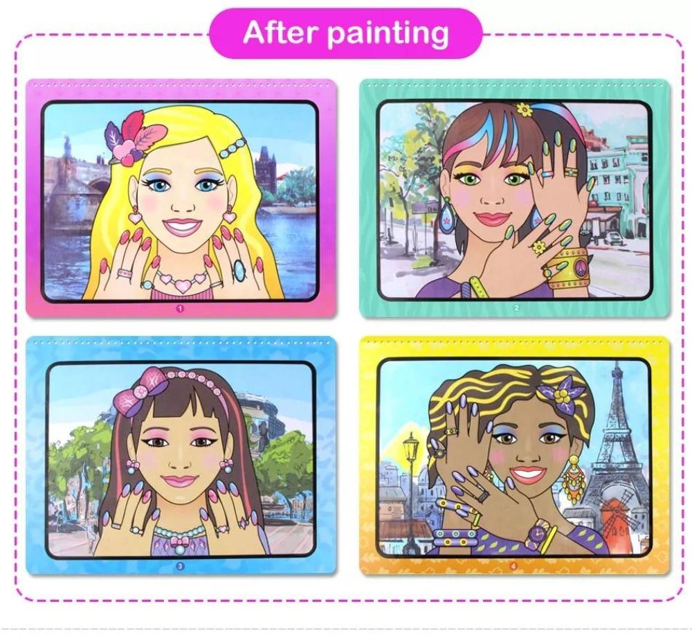 Einmal ausgemalt, sind die Bilder sehr lebendig und farbenfroh. Sobald sie trocknen, verschwinden die Farben und die Seiten können immer wieder neu bemalt werden.
