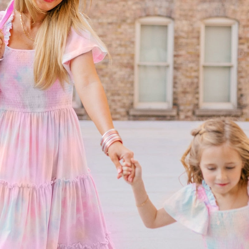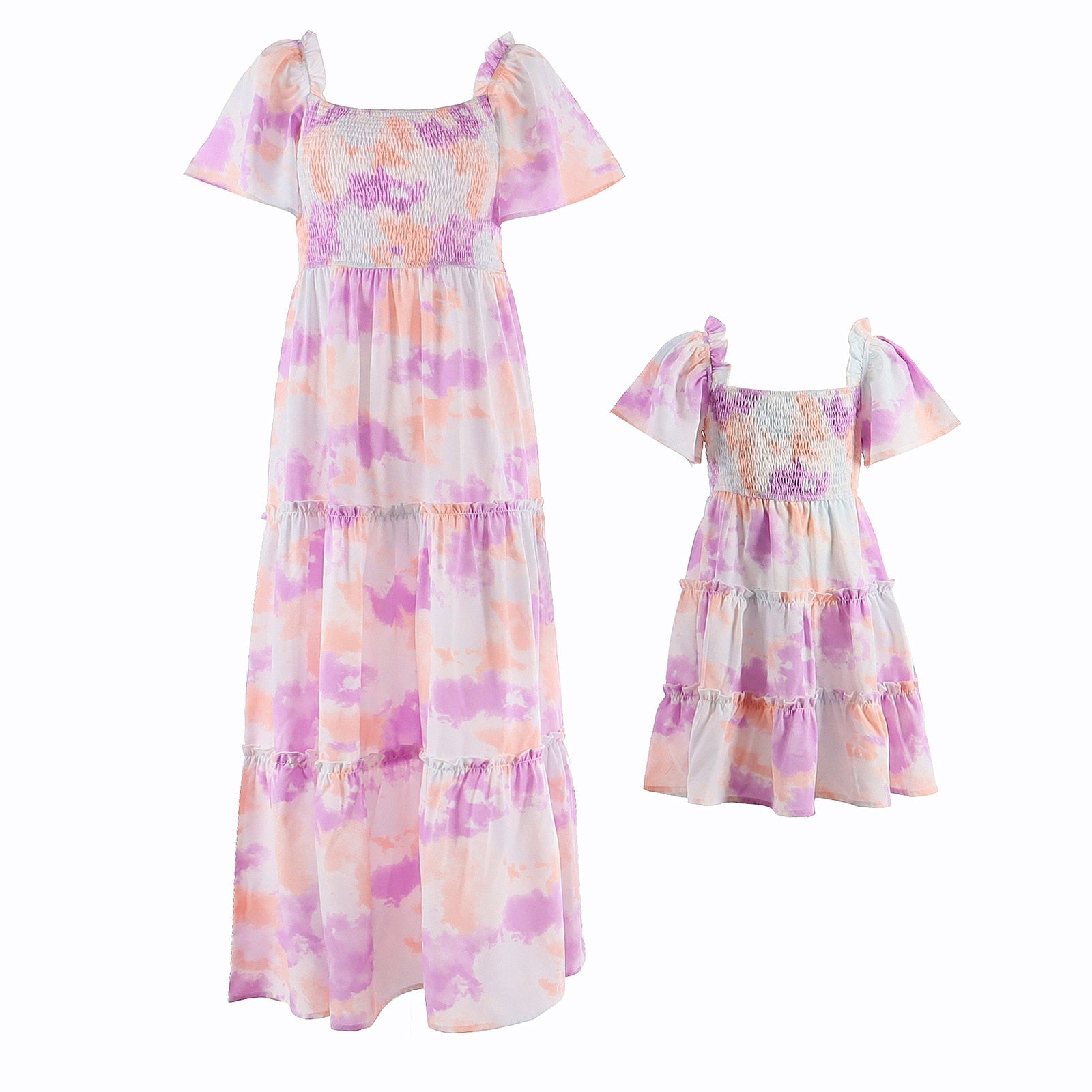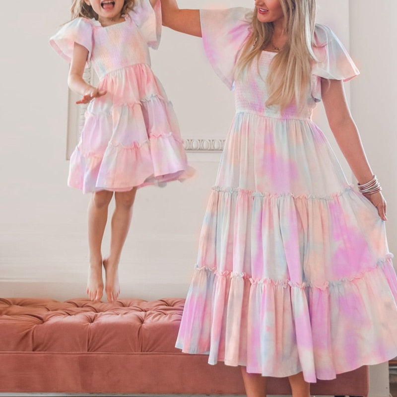 Vestido combinado madre e hija teñido anudado, manga larga abullonada