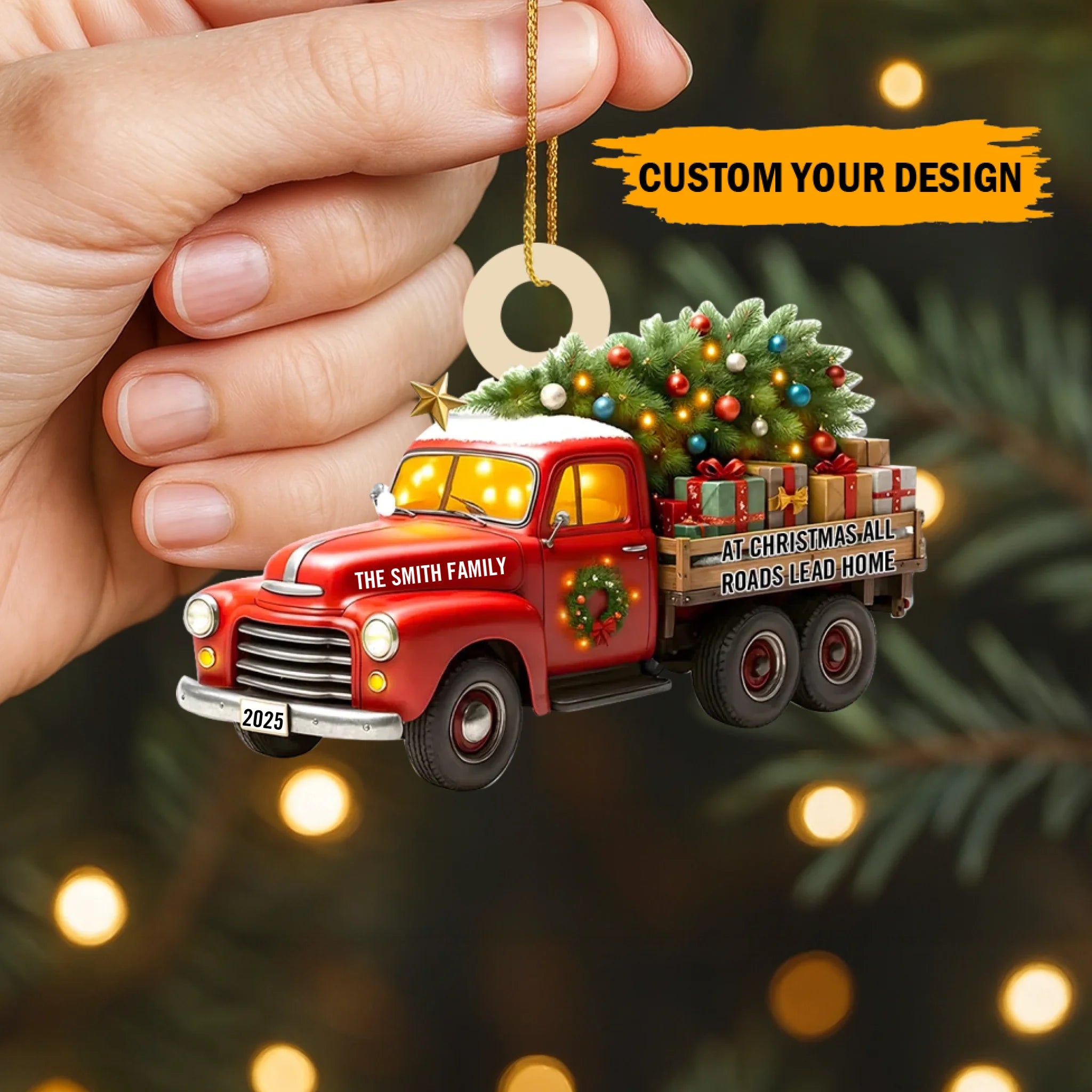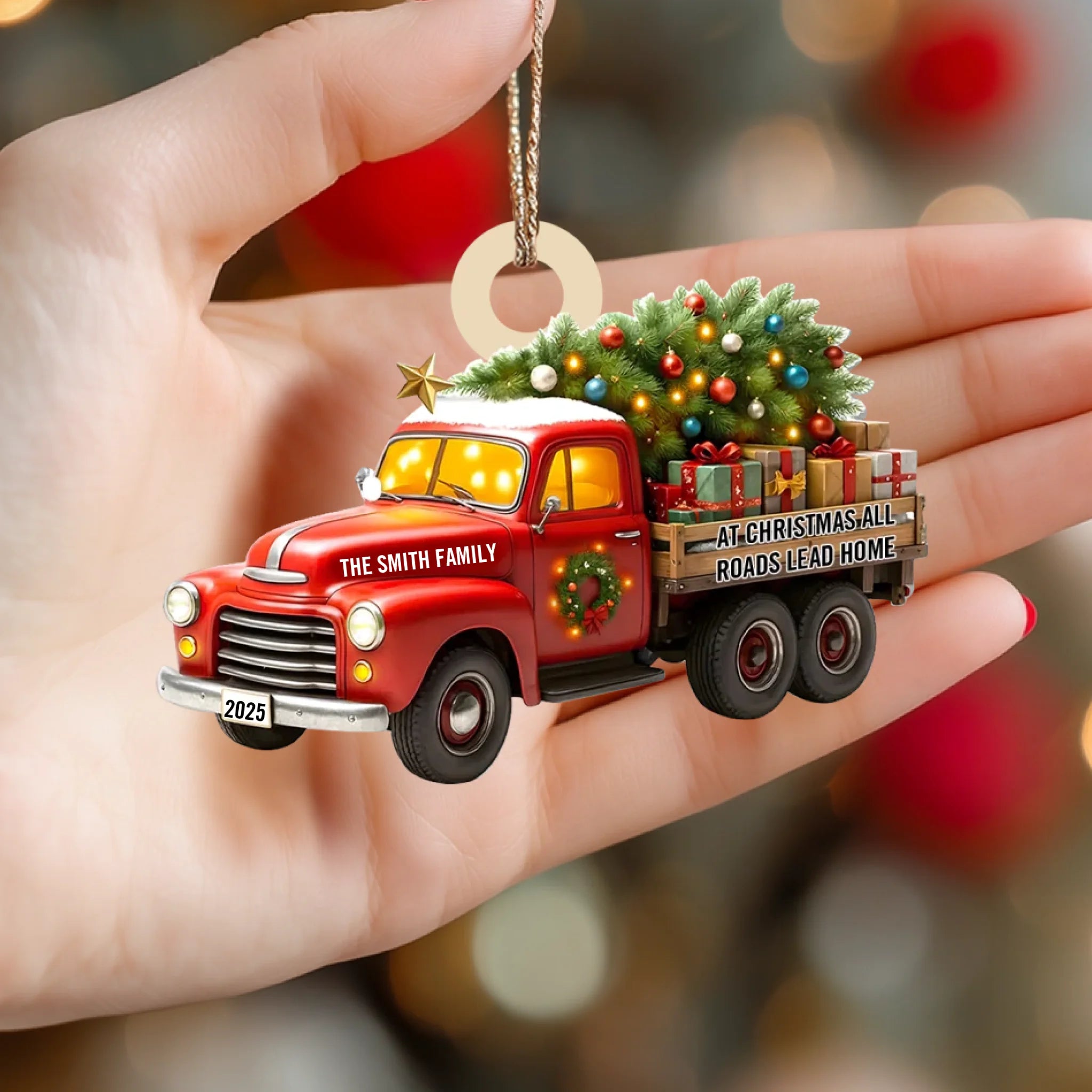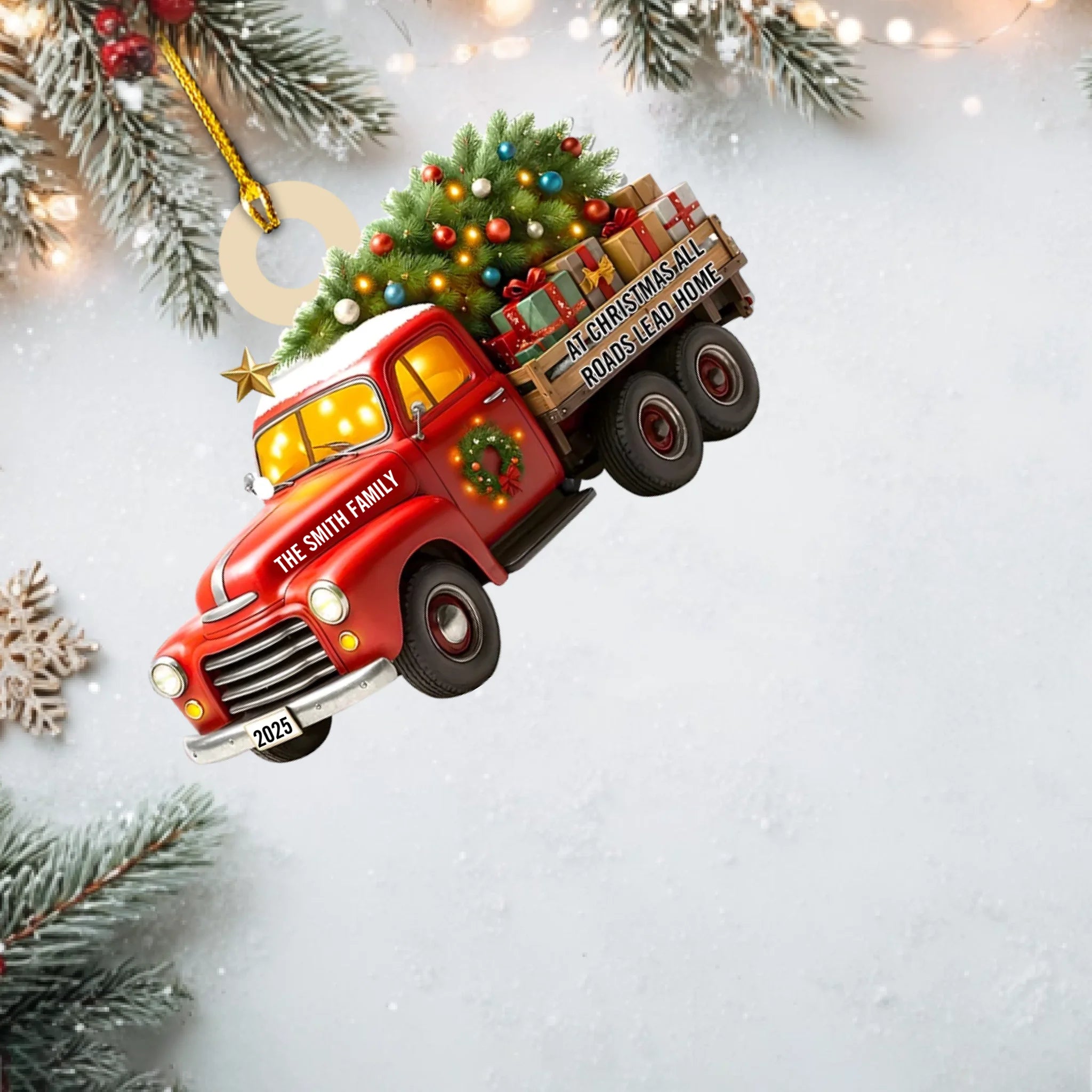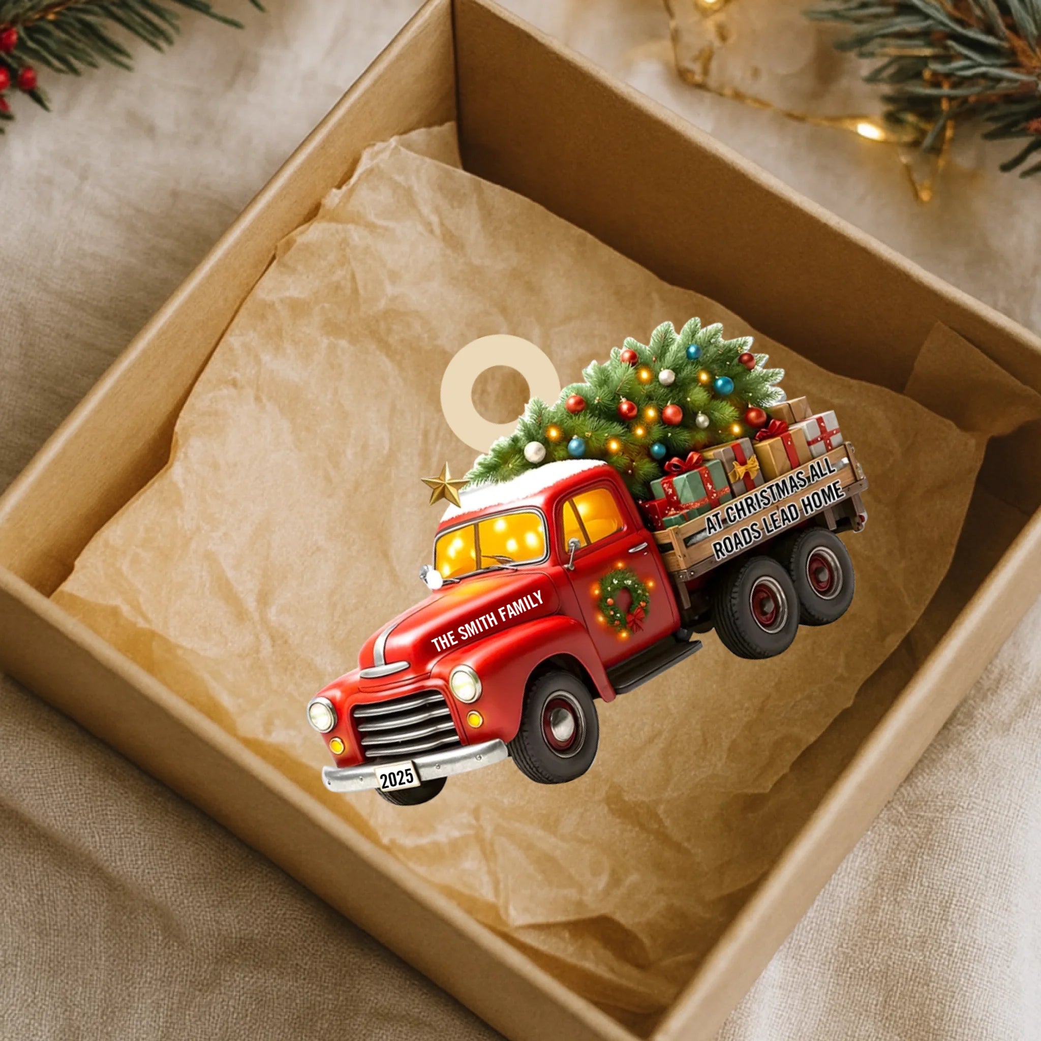 Capture the magic of coming home for the holidays with this charming Personalized “All Roads Lead Home” Christmas Ornament. Featuring a festive vintage truck carrying a glowing Christmas tree and gifts, this ornament symbolizes love, connection, and the warmth of being together. With customizable family name and year, it becomes a meaningful keepsake that celebrates your traditions, memories, and the people who make home truly special.