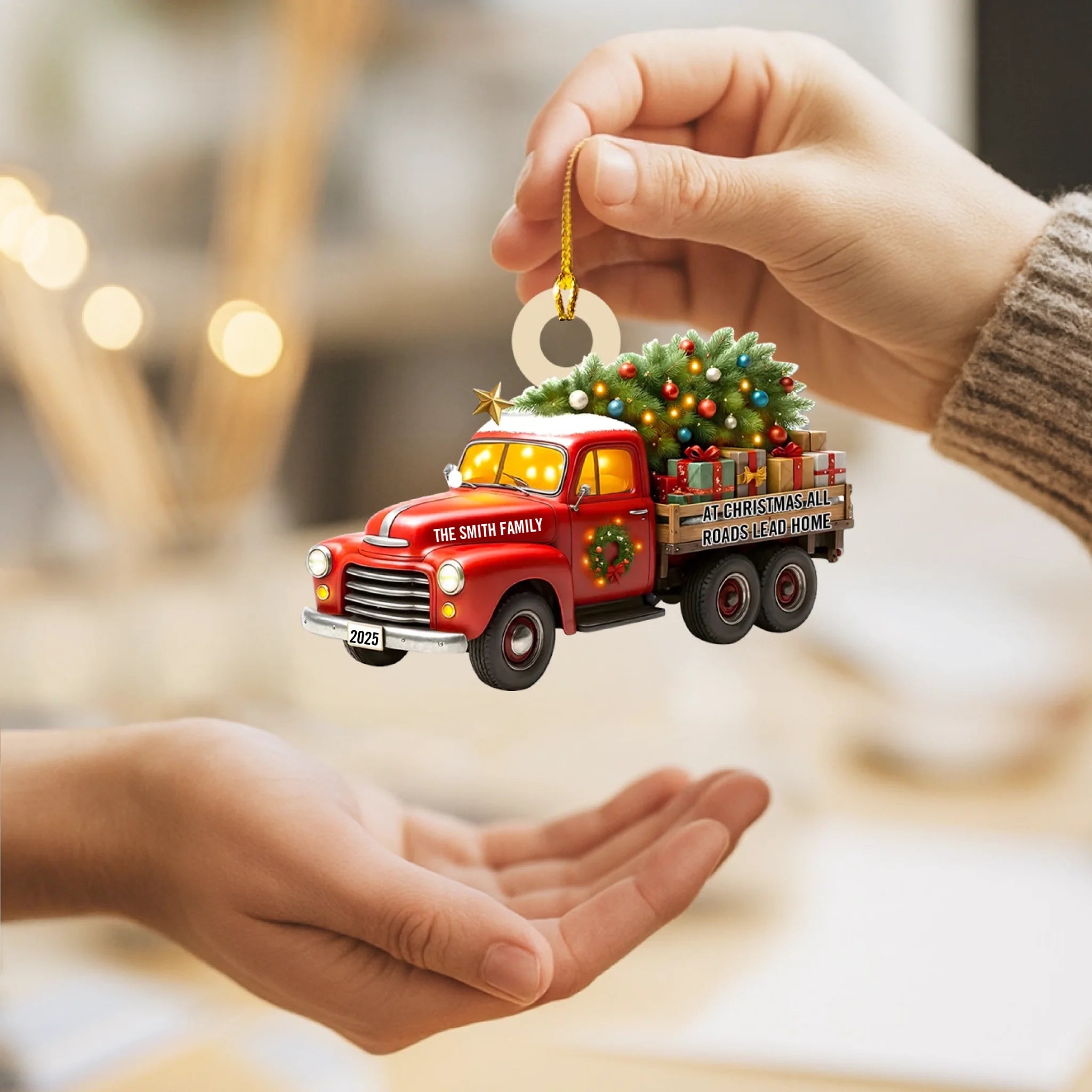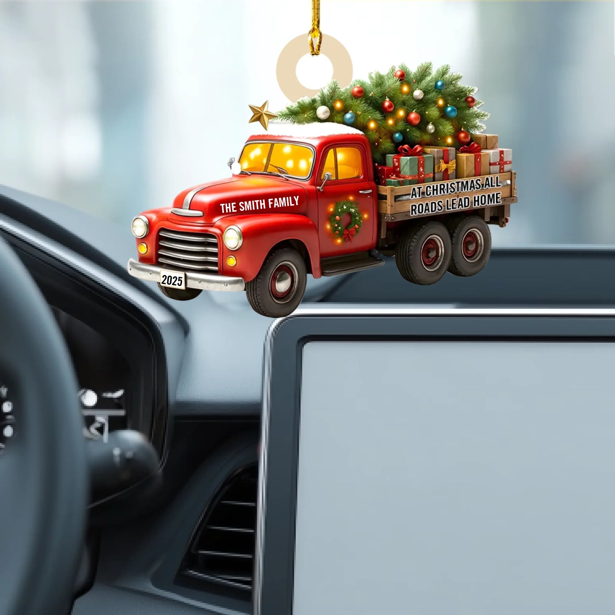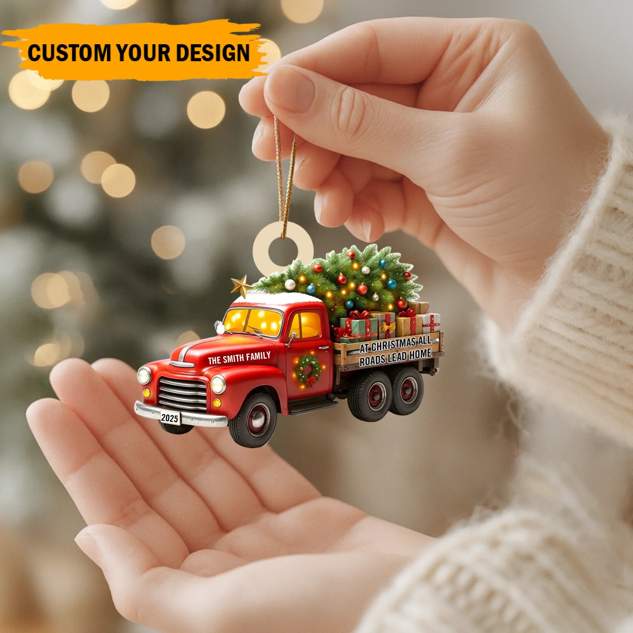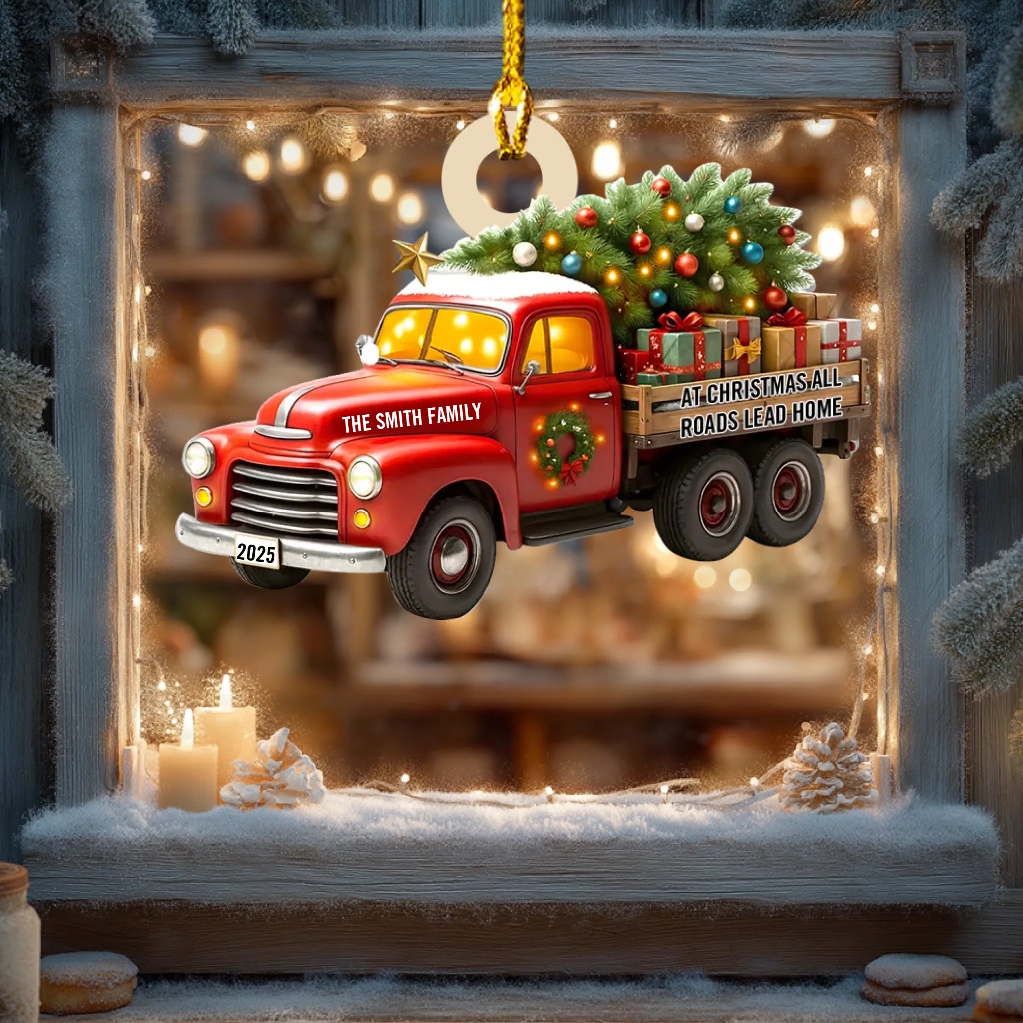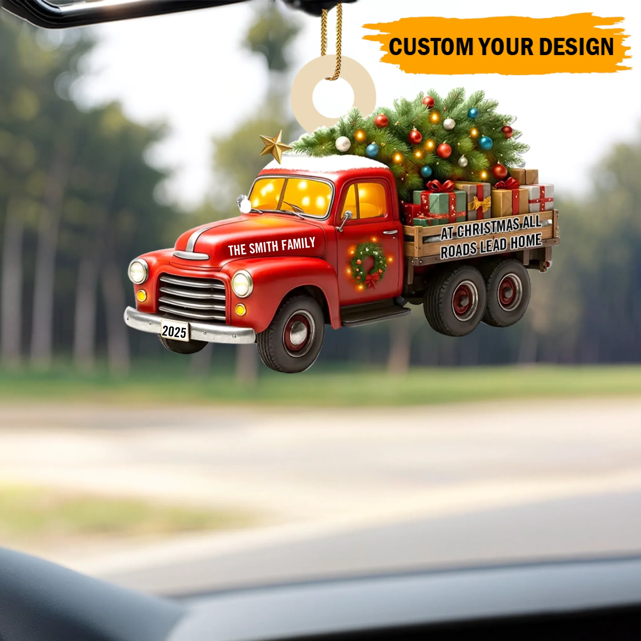 Capture the magic of coming home for the holidays with this charming Personalized “All Roads Lead Home” Christmas Ornament. Featuring a festive vintage truck carrying a glowing Christmas tree and gifts, this ornament symbolizes love, connection, and the warmth of being together. With customizable family name and year, it becomes a meaningful keepsake that celebrates your traditions, memories, and the people who make home truly special.