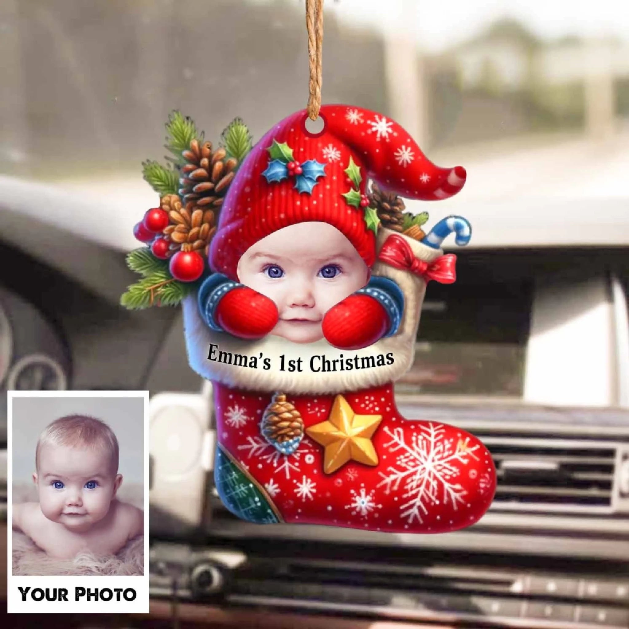 Wunderschön gestaltet als festlicher Weihnachtsstrumpf mit weihnachtlichen Details und Tannenzweigen, präsentiert dieser Anhänger das süße Foto Ihres Babys sowie personalisierbaren Text (z.B. Emmas 1. Weihnachten). Gefertigt aus hochwertigem transparentem Acryl-Plexiglas, funkelt er wunderschön im Licht des Weihnachtsbaums – perfekt zum Aufhängen am Baum, am Rückspiegel Ihres Autos oder überall in Ihrem Zuhause.