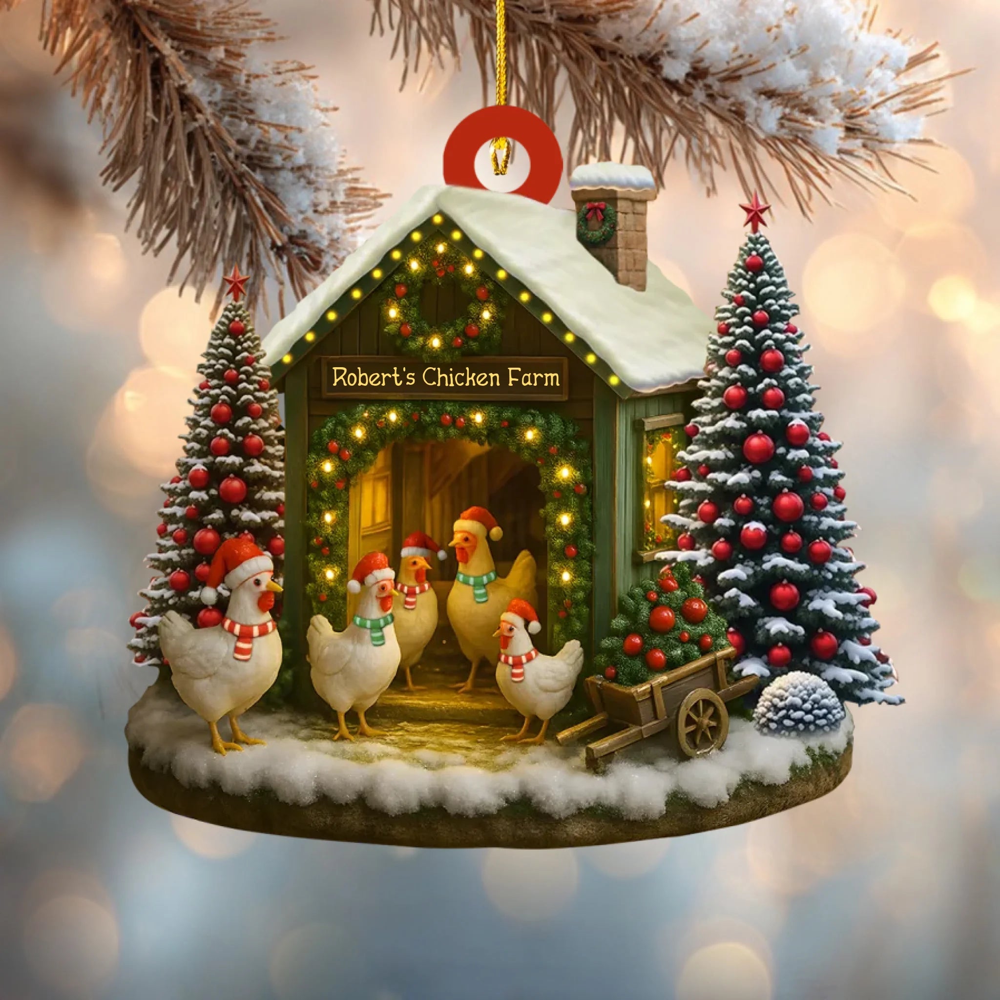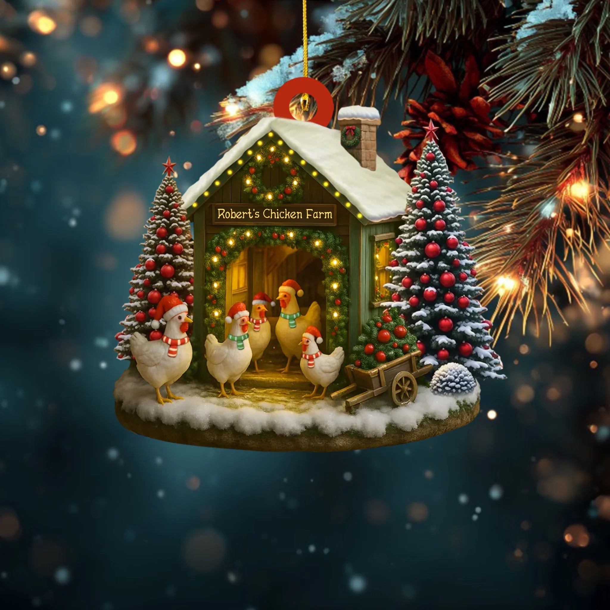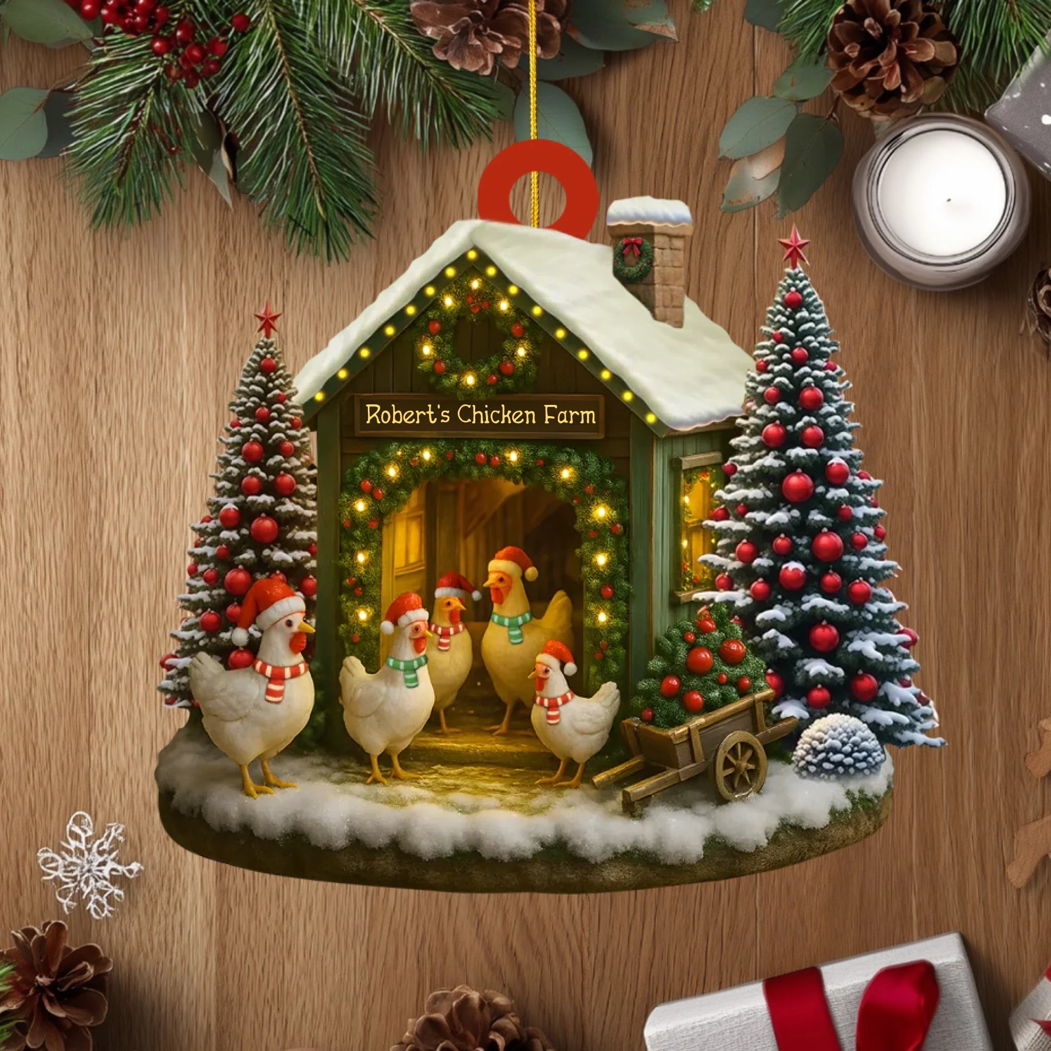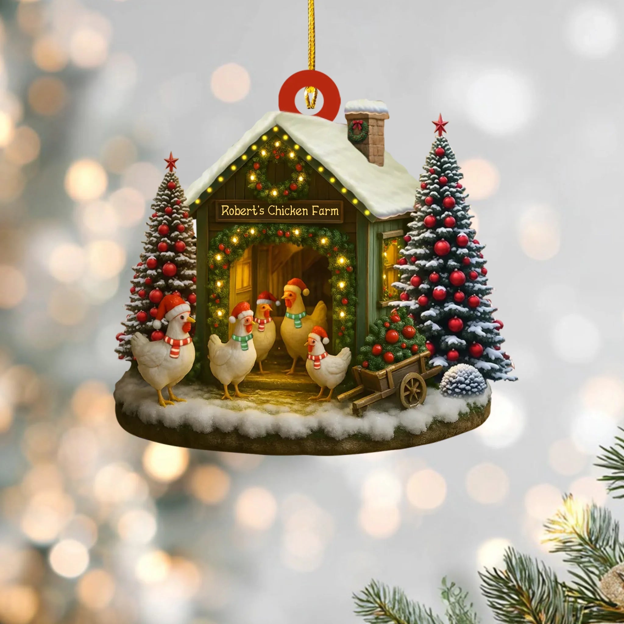 Ornamento Navideño Personalizado de Granja de Pollos – Decoración de Granero de Madera Personalizada para Granjeros, Recuerdo Navideño con Nombre de Familia
