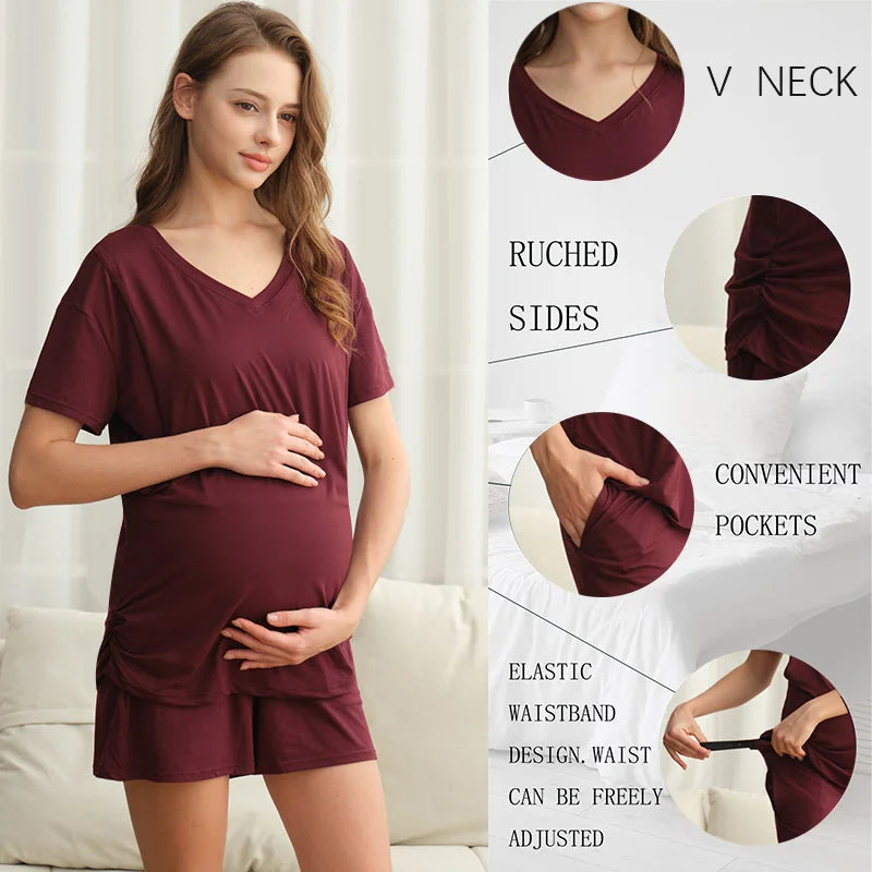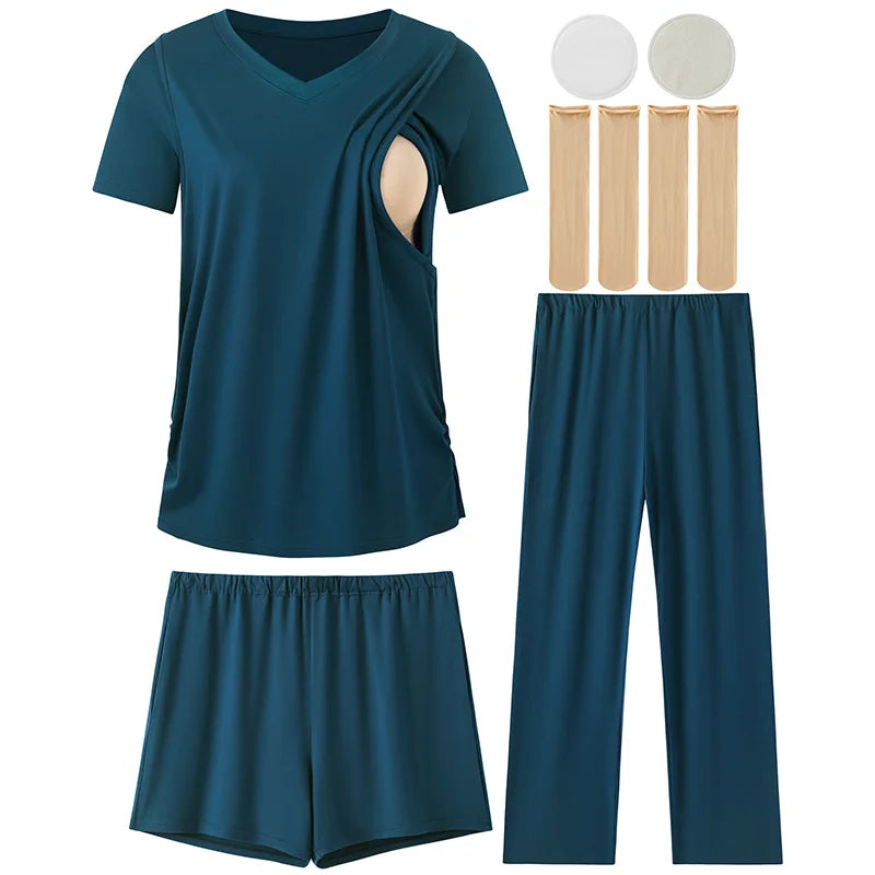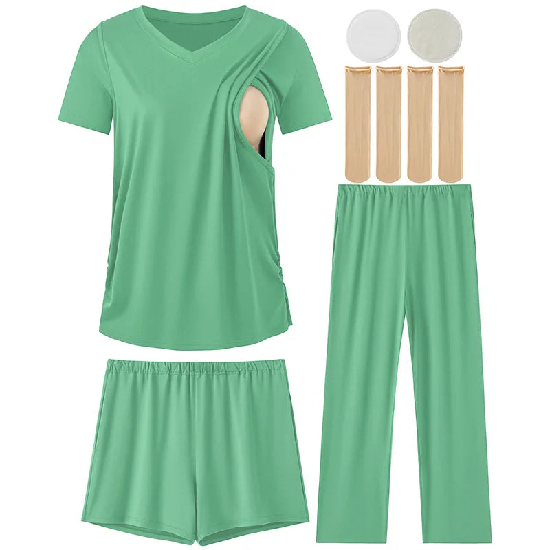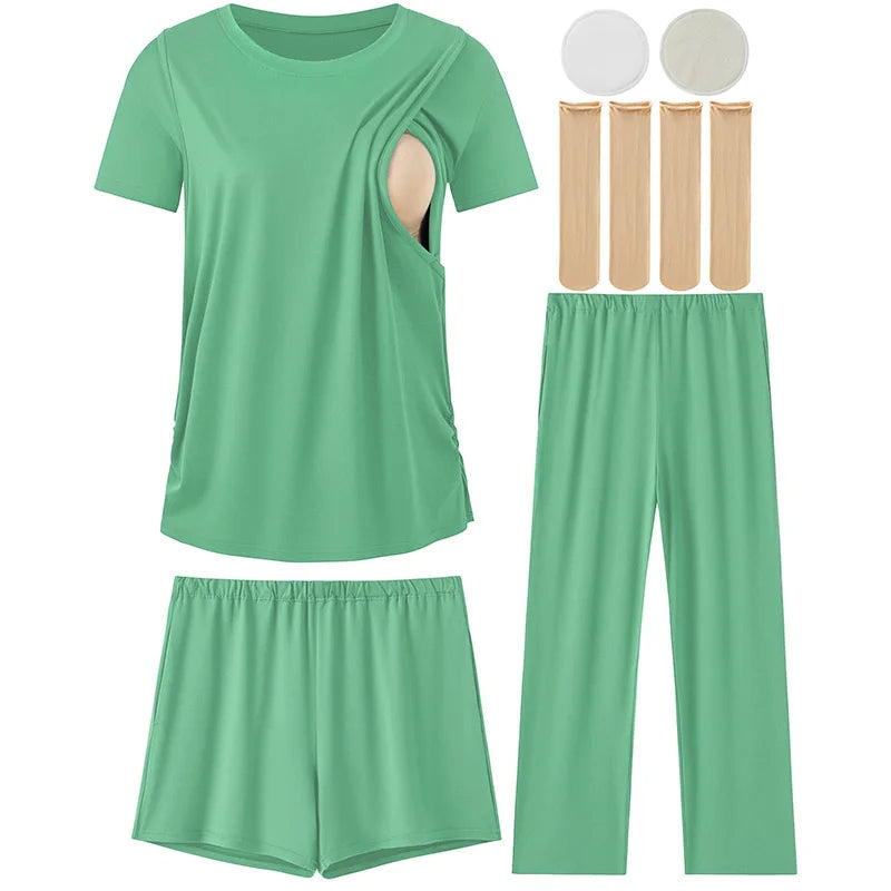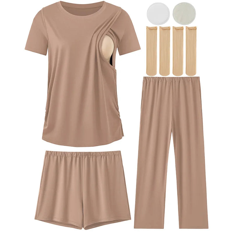 Complete Multi-Piece Set – Includes 1 short-sleeve nursing top, 1 pair nursing shorts, 1 pair long maternity pants, 2 nursing nipple pads, and 2 pairs of maternity socks.