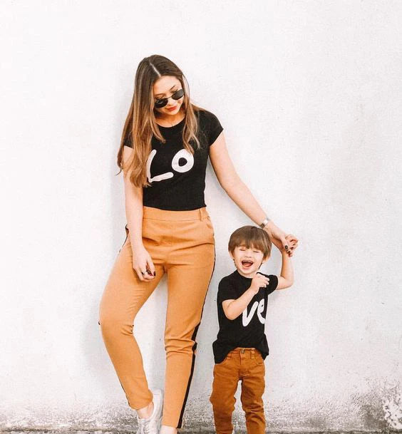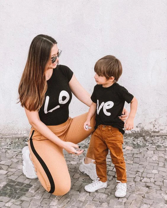 - Expressive Print: Both T-shirts feature heartwarming prints; the Mommy's T-shirt displays the word "Lo," symbolizing love, while the Kid's T-shirt showcases the word "Ve," representing the joy of being loved.