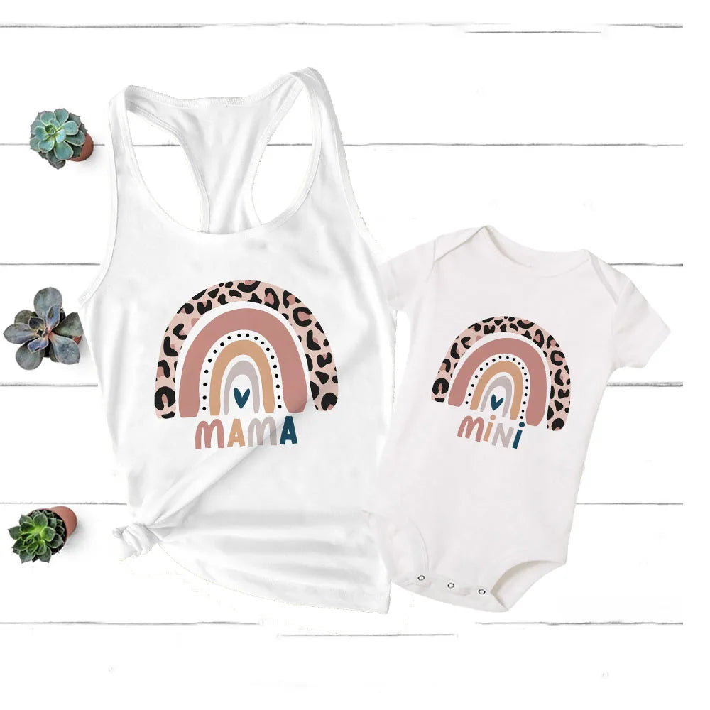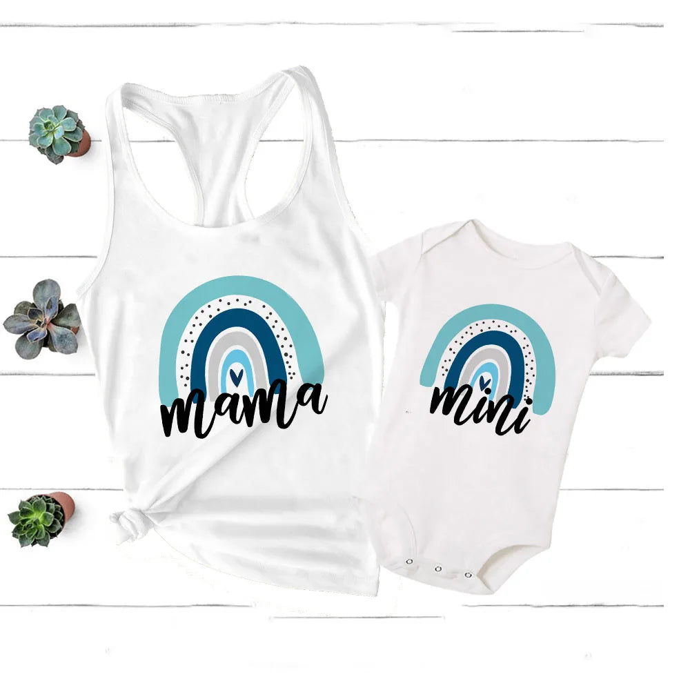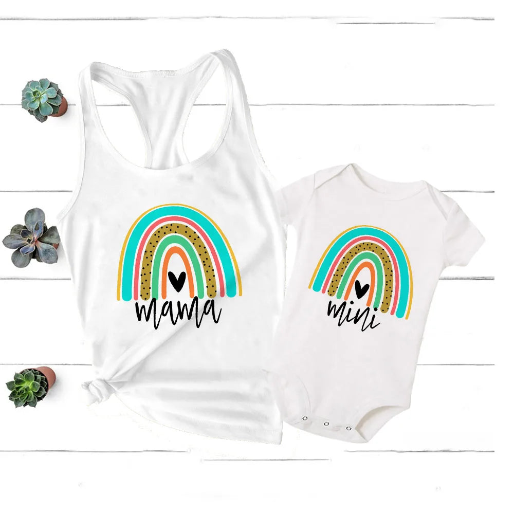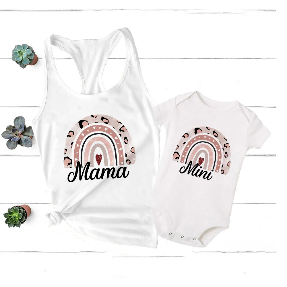 Elevate your twinning game with our Matching Outfits for Mother and Baby featuring adorable rainbow decorations! These stylish ensembles are designed to create precious matching moments between Mom and her little one. With the word "MAMA" beautifully printed on the mother's shirt and "MINI" on the baby's romper, both adorned with charming rainbow designs, you and your mini-me will surely stand out wherever you go.