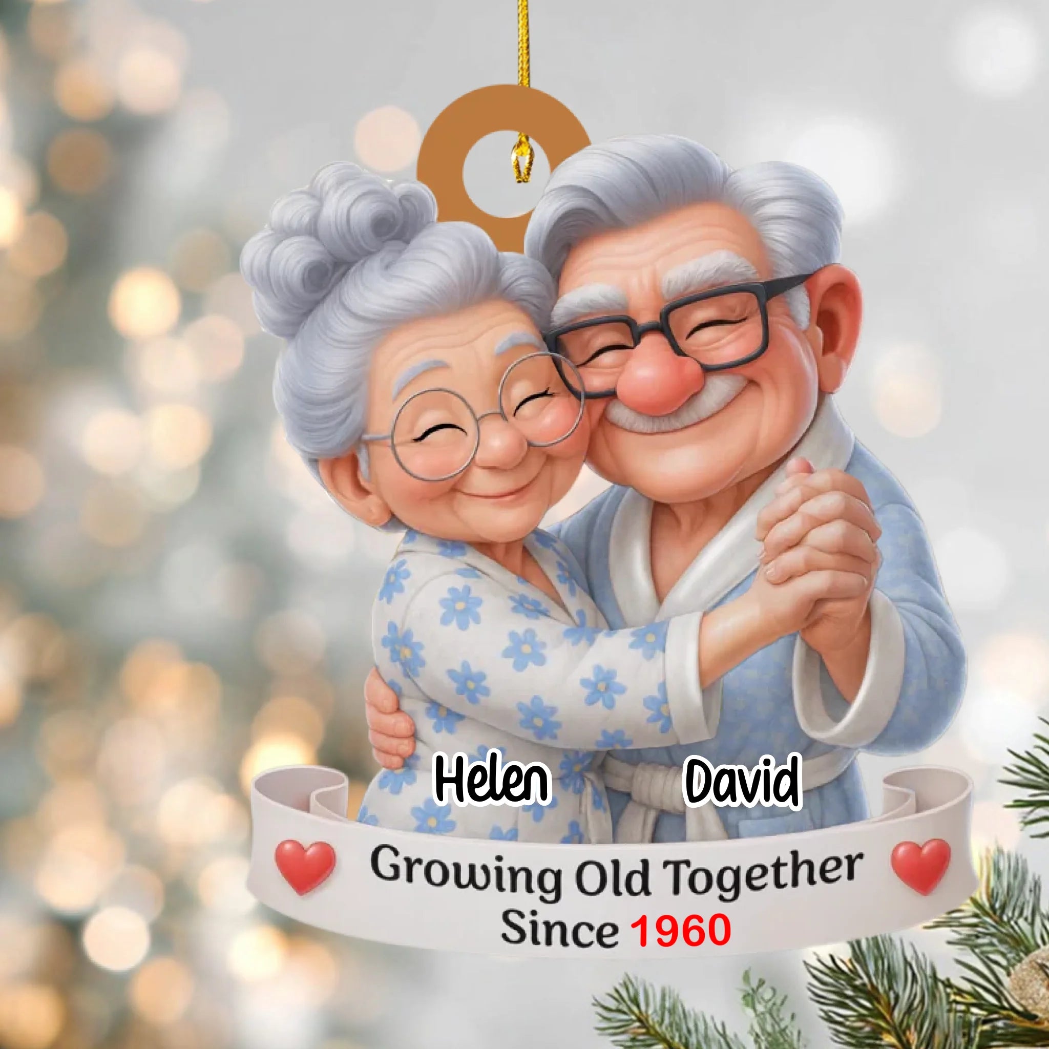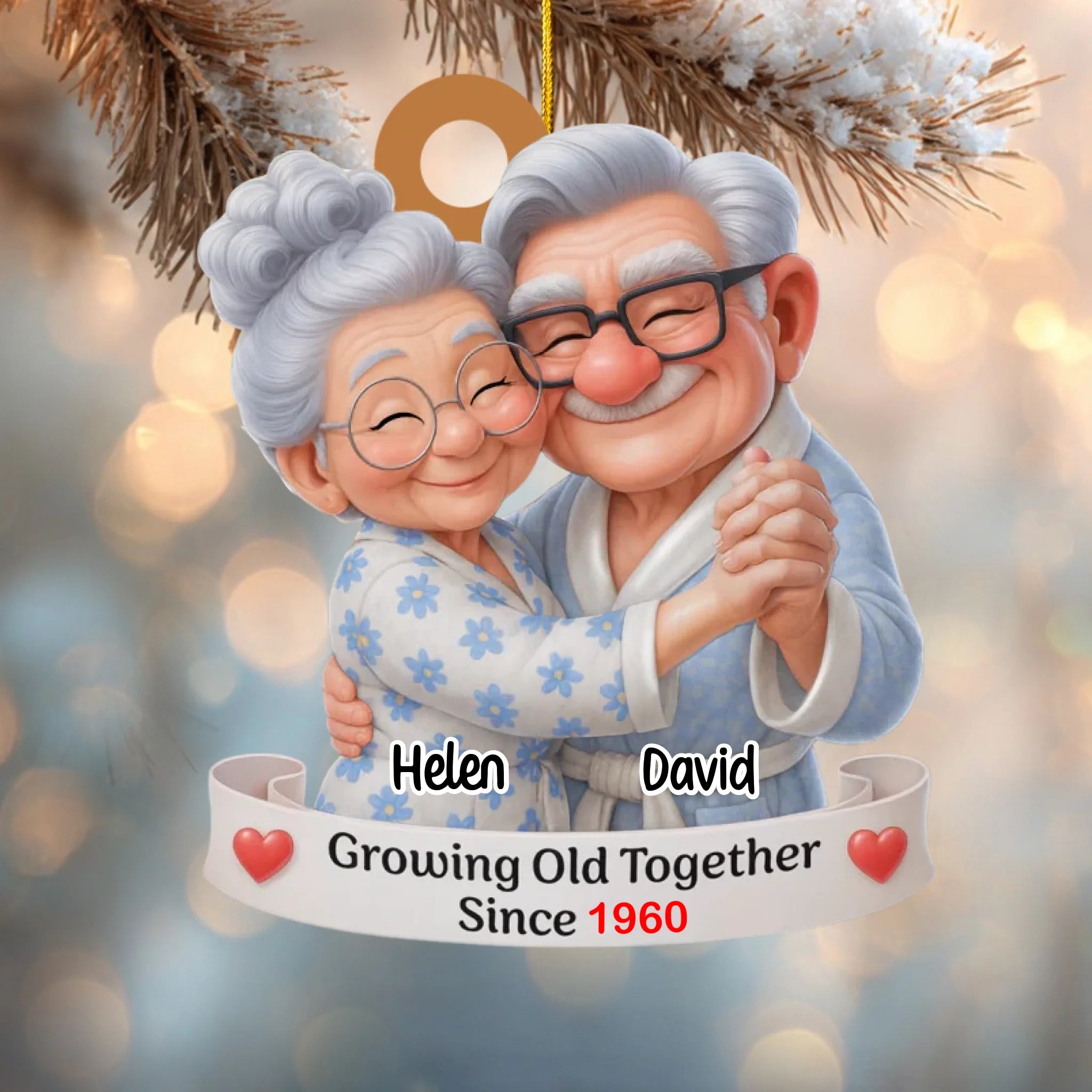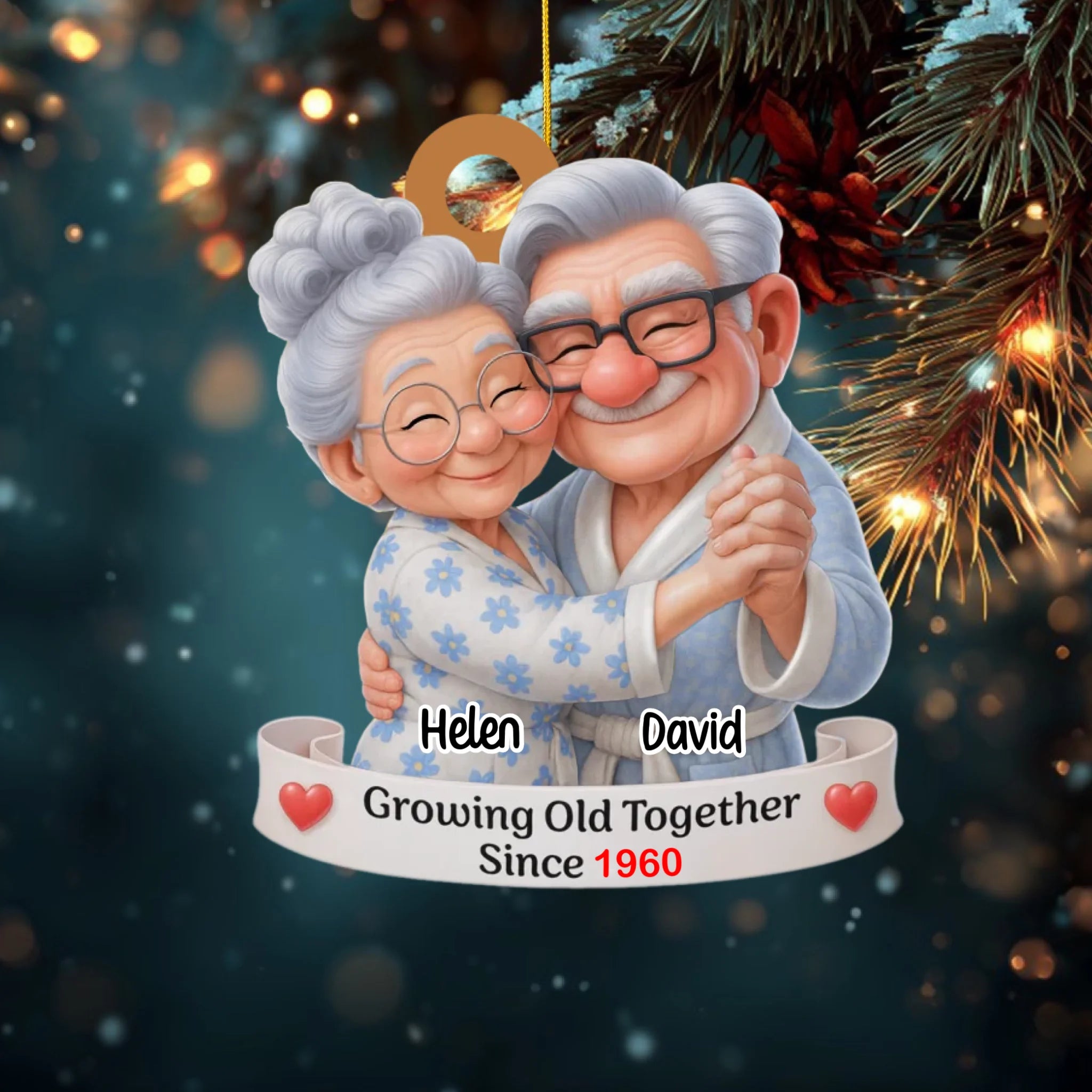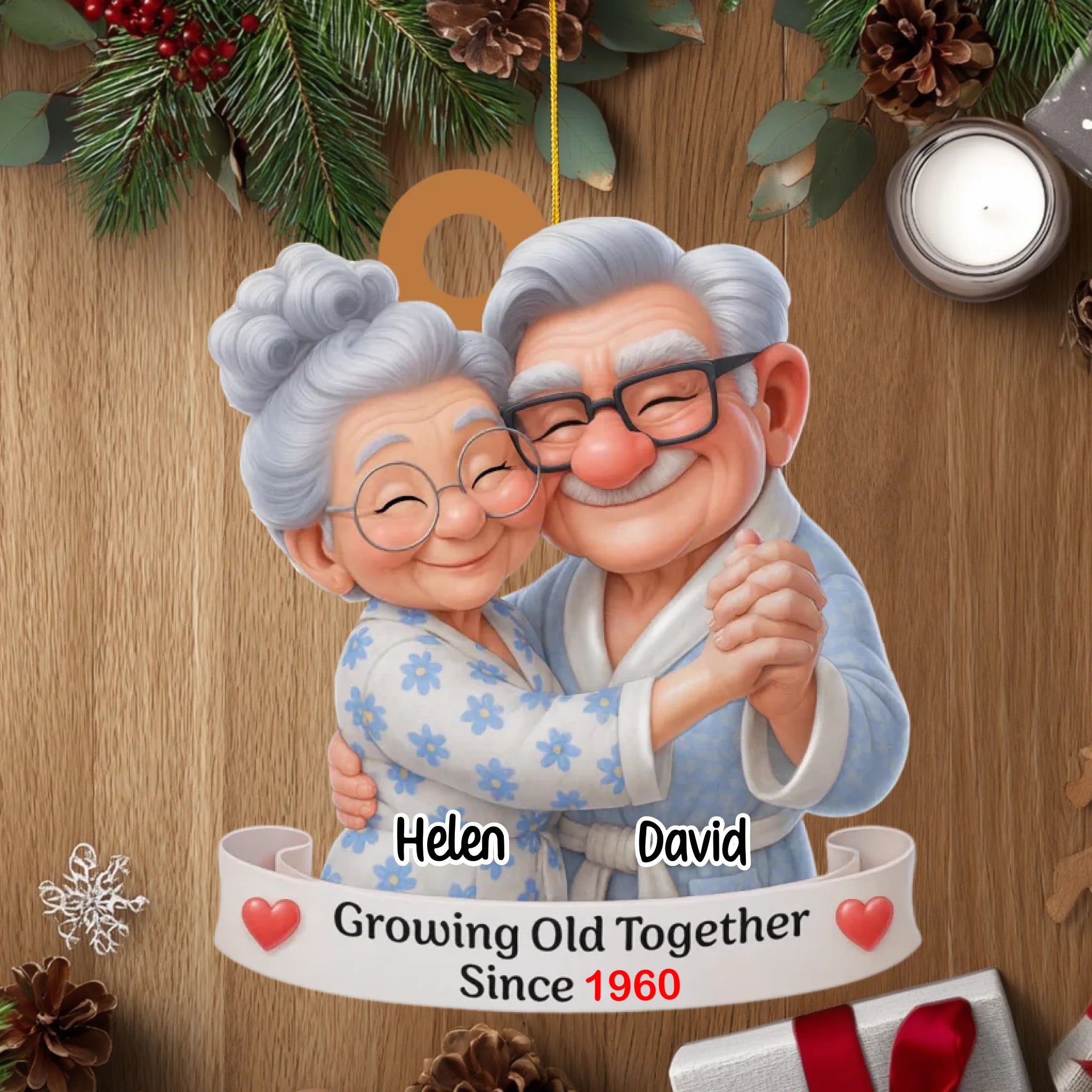 Adorno Navideño Personalizado para Parejas de Ancianos – Envejeciendo Juntos Desde [Año], Nombres y Tono de Piel Personalizables, Regalo de Aniversario y Navidad para Parejas