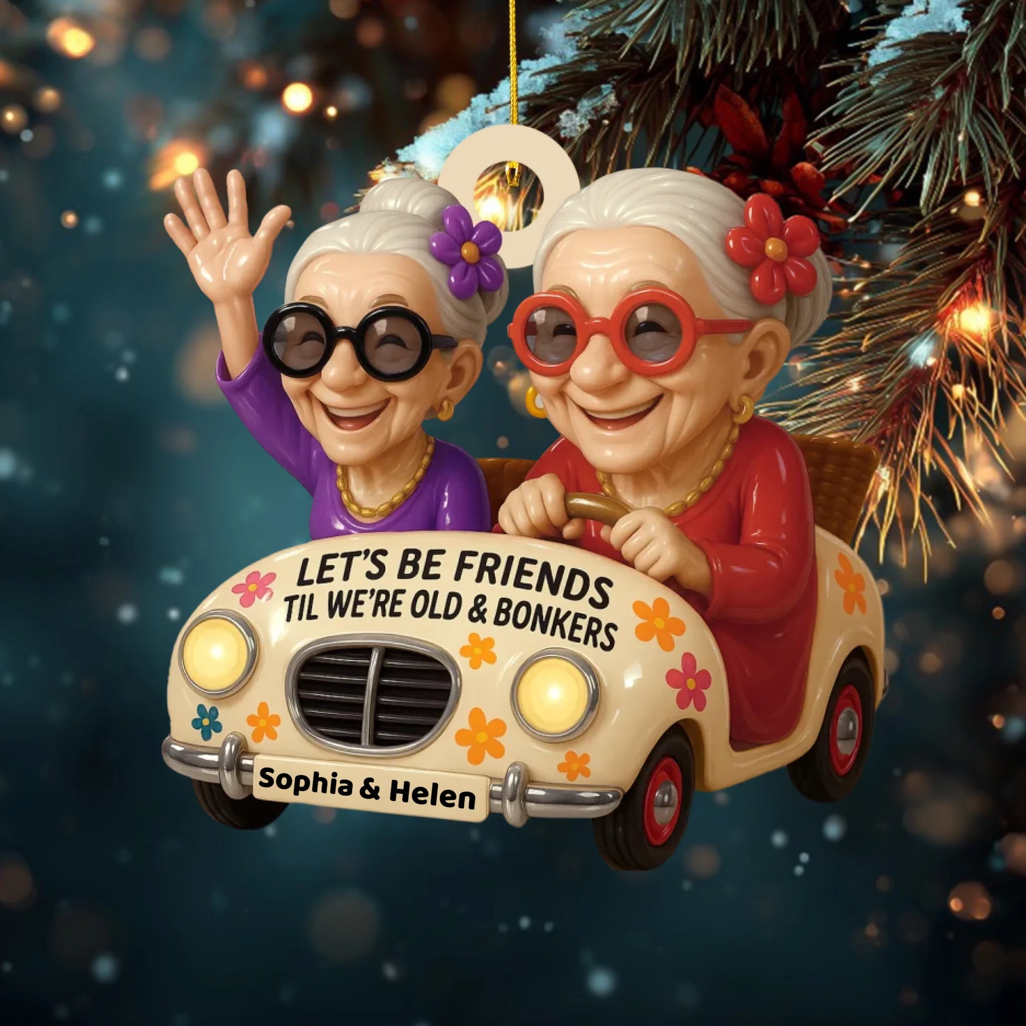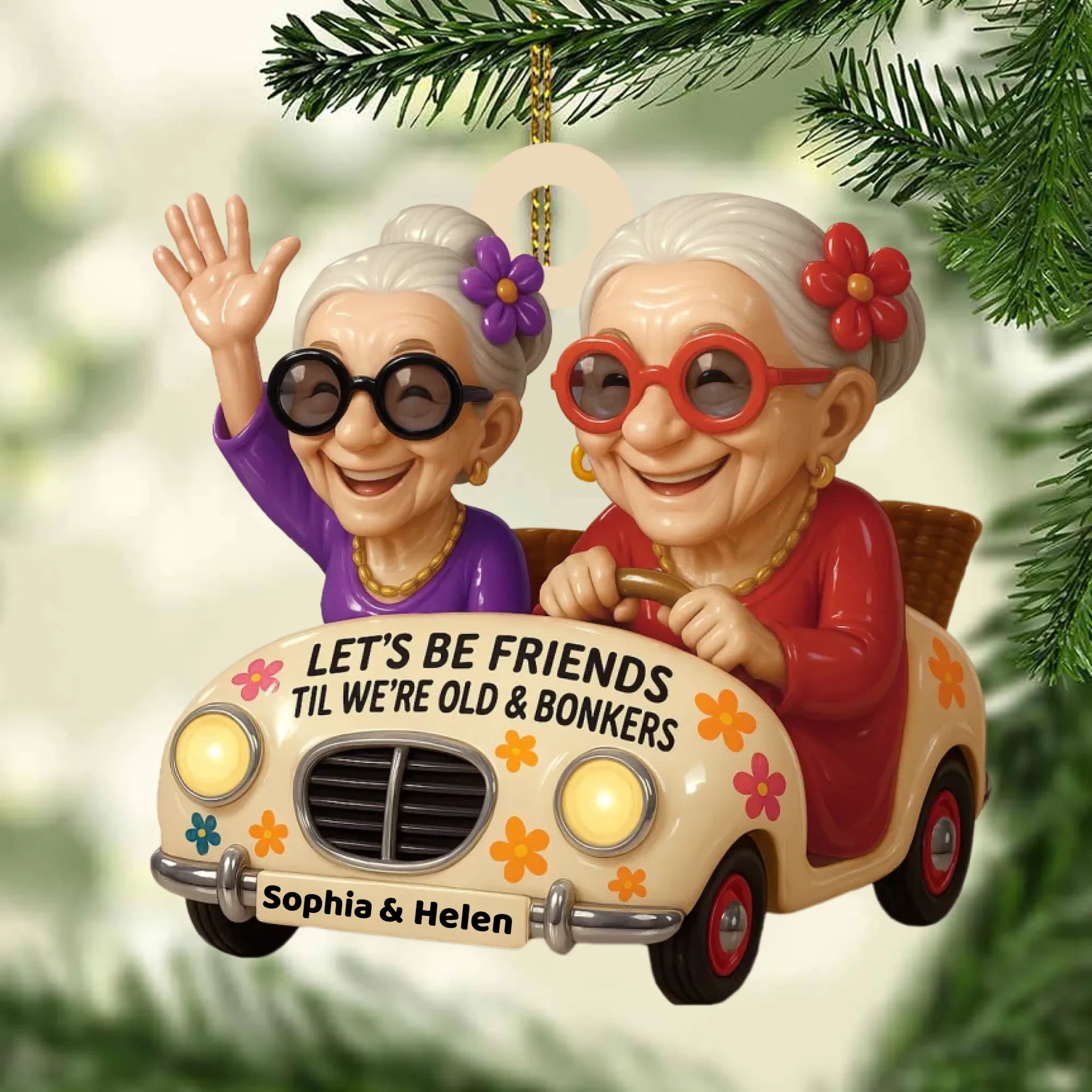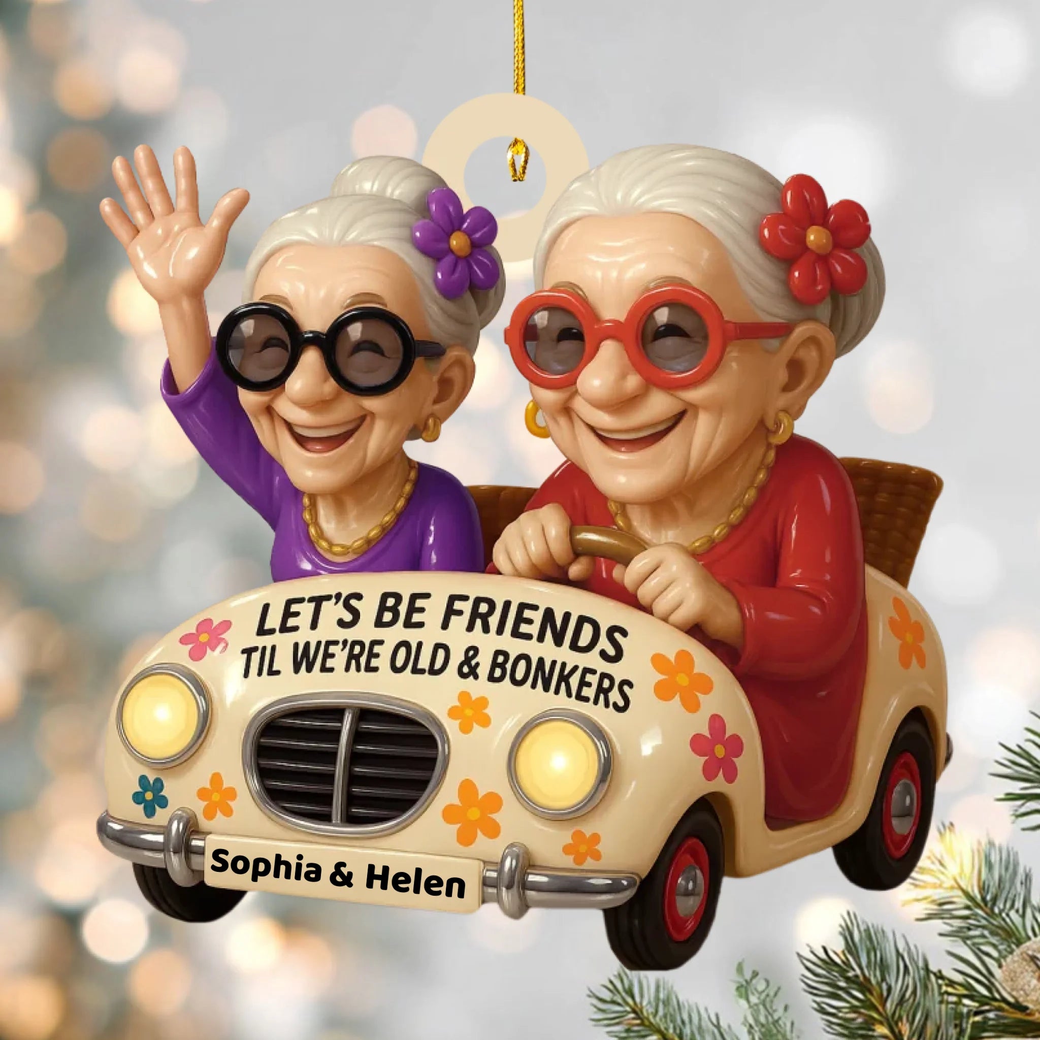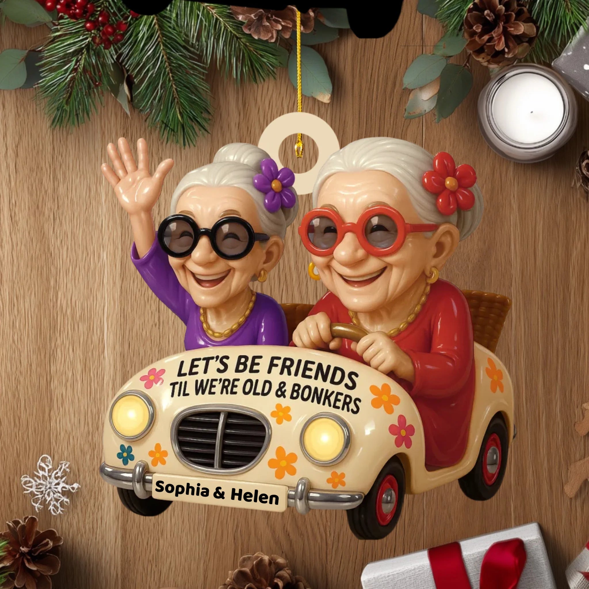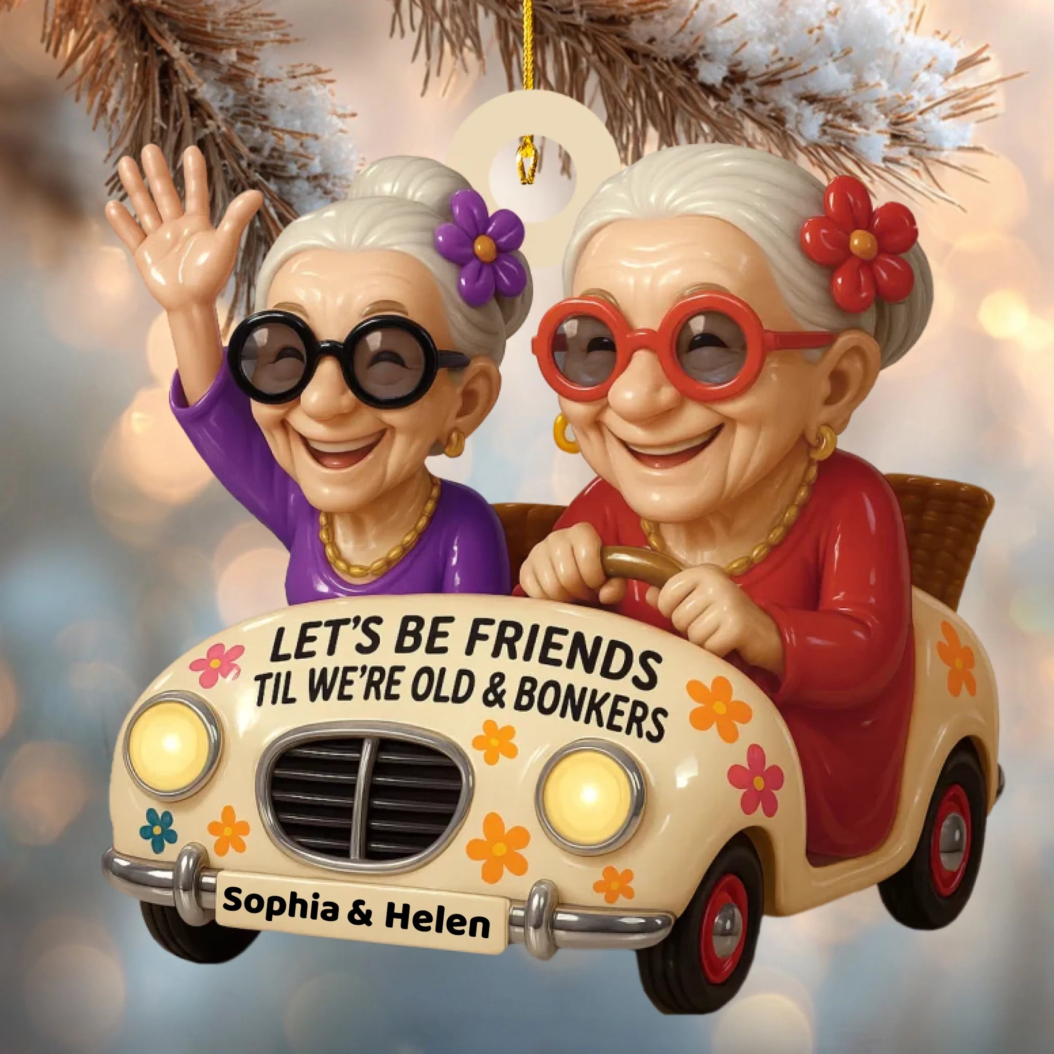 Celebrate lifelong friendship and laughter with this Personalized “Sisters Forever” Wooden Ornament! Featuring two adorable old ladies joyfully riding in a car with the quote “Let’s Be Friends Til We’re Old & Bonkers”, this ornament perfectly captures the fun, love, and loyalty that define true friendship.