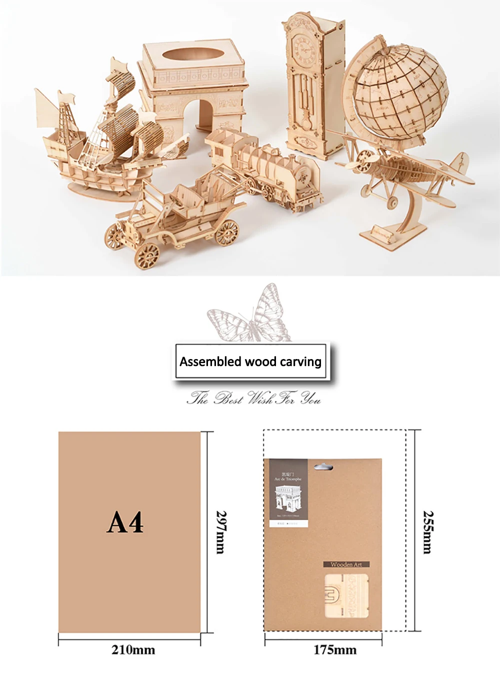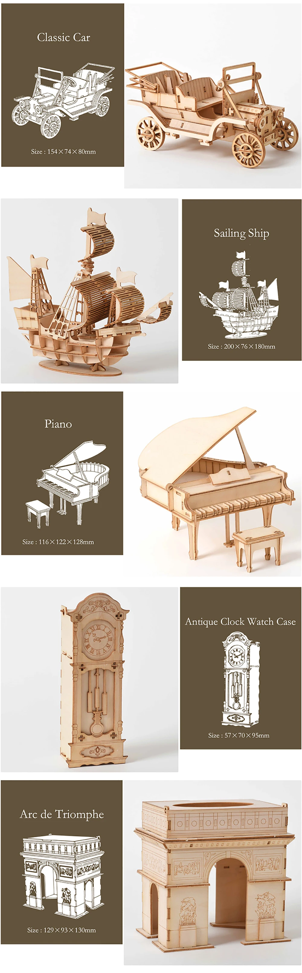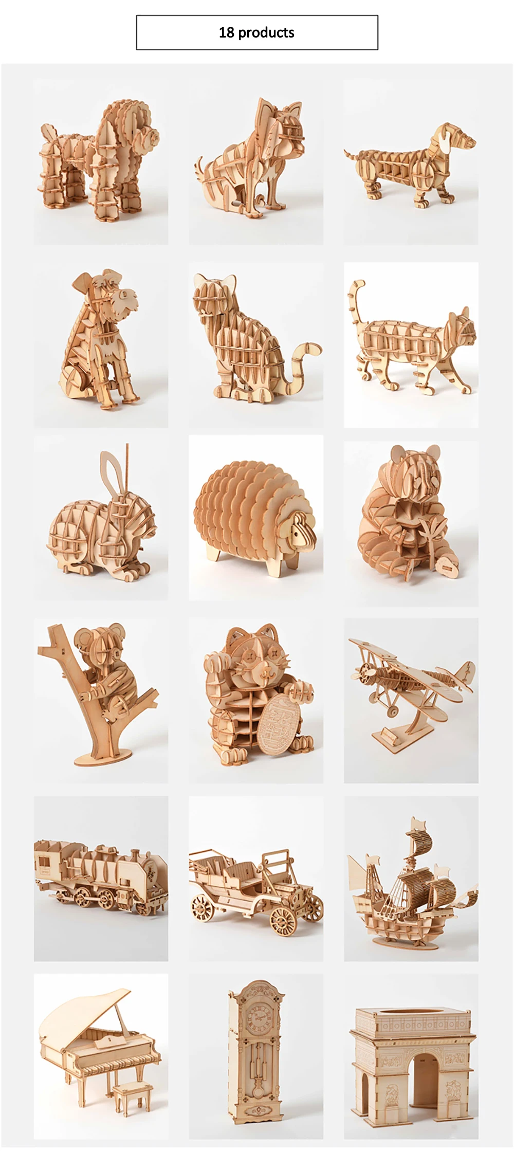 Bauen Sie Holzmodelle mit Ihren eigenen Händen! Es gibt 18 verschiedene Baumodelle wie Autos, Schiffe, berühmte Gebäude, Herden, Flugzeuge und Tiere.