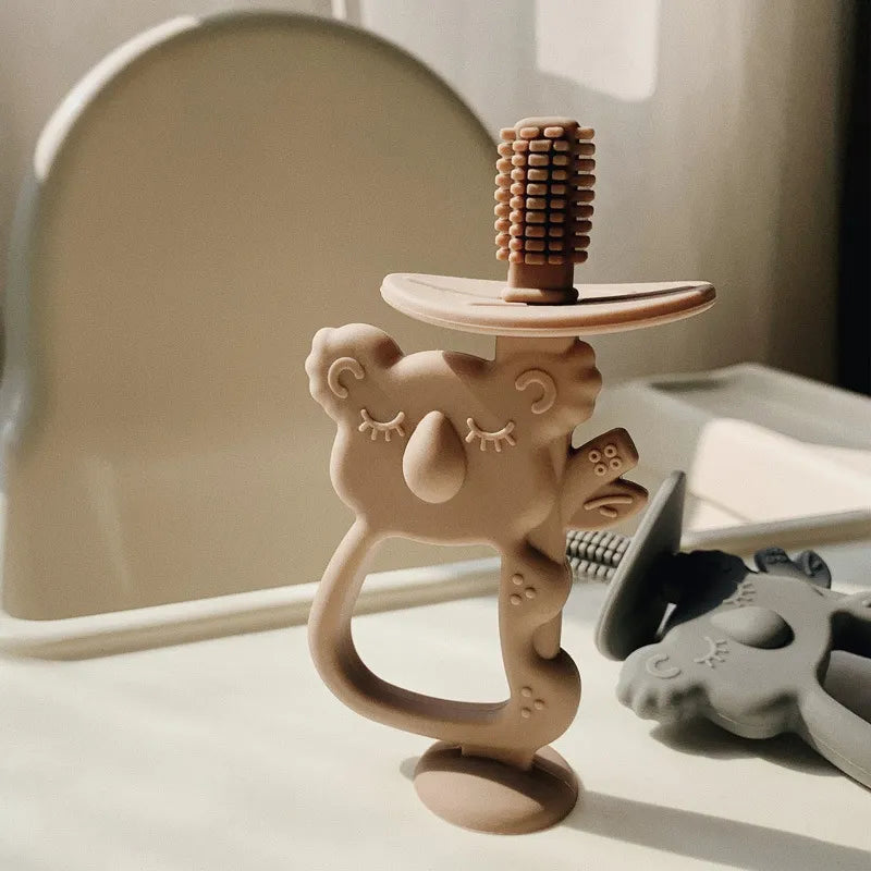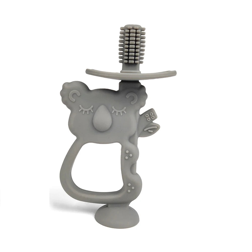 Unsere Lernzahnbürste aus sicherem und langlebigem Silikon dient gleichzeitig als Beißring und Kauspielzeug. Das charmante Koala-Design verleiht der Zahnpflege Ihres Kindes eine spielerische Note und macht sie zu einem spannenden Erlebnis, auf das es sich freuen wird.