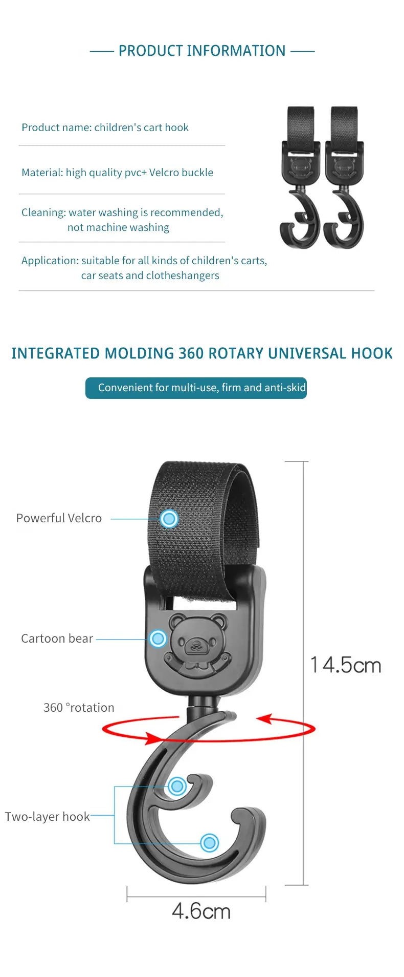 These accessories are perfect for accommodating multiple bags with wide handles on any stroller. The easy-to-attach hook and loop strap stays securely in place, preventing sliding and ensuring stability. The 360-degree rotation feature allows for flexible adjustment of the hook's direction.