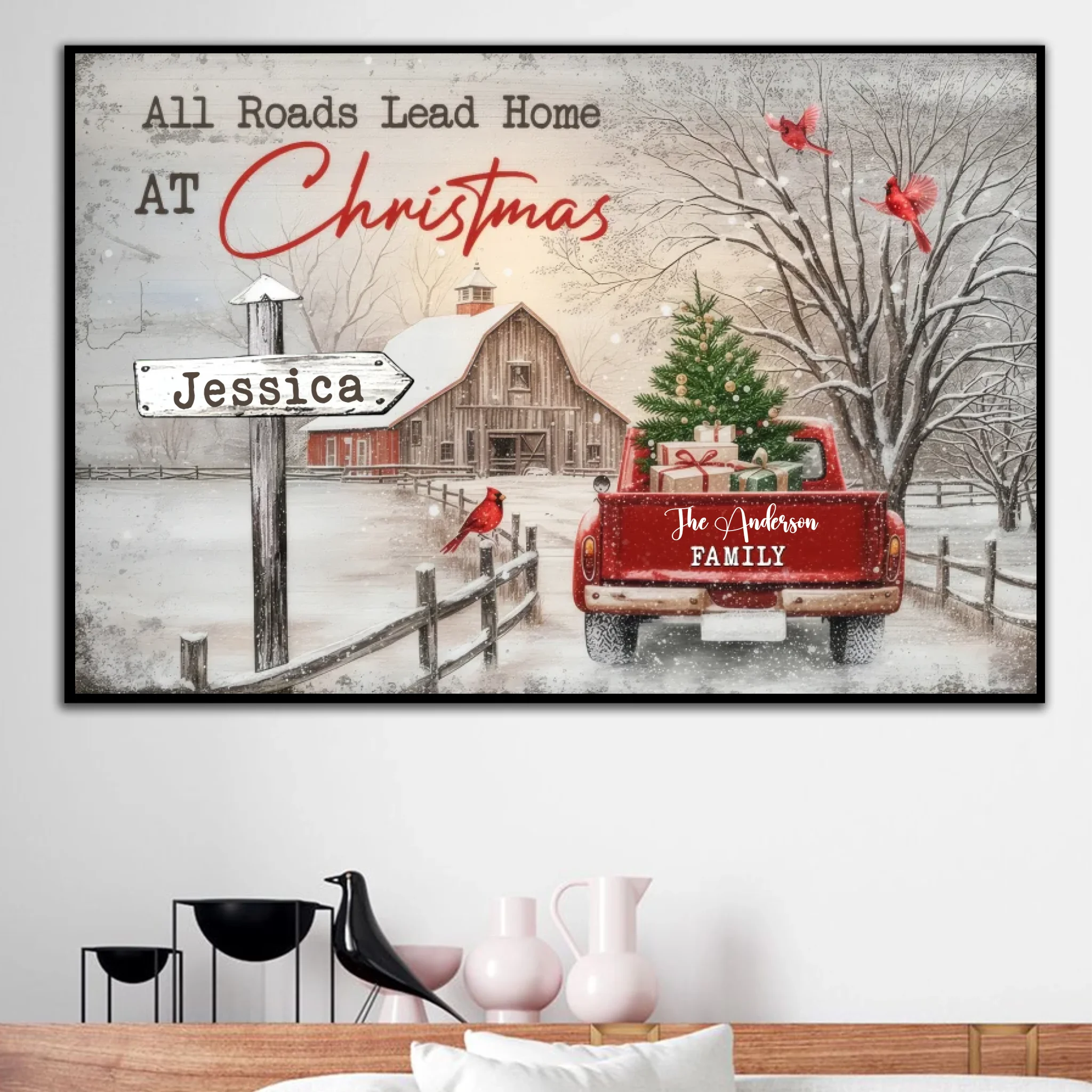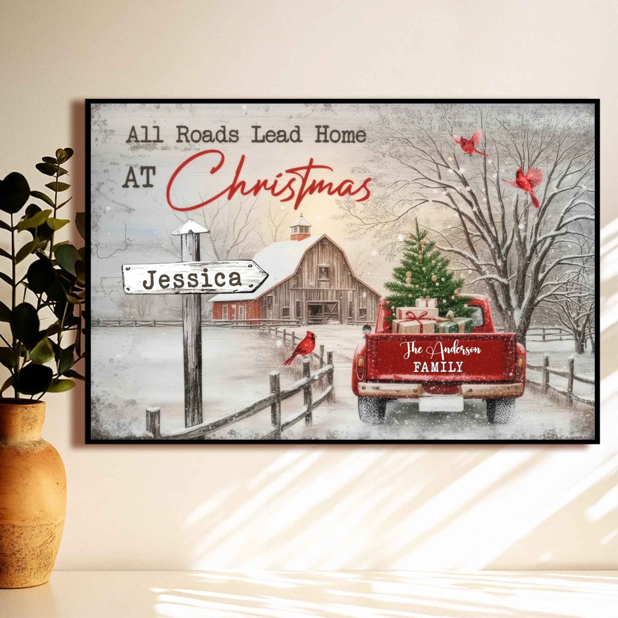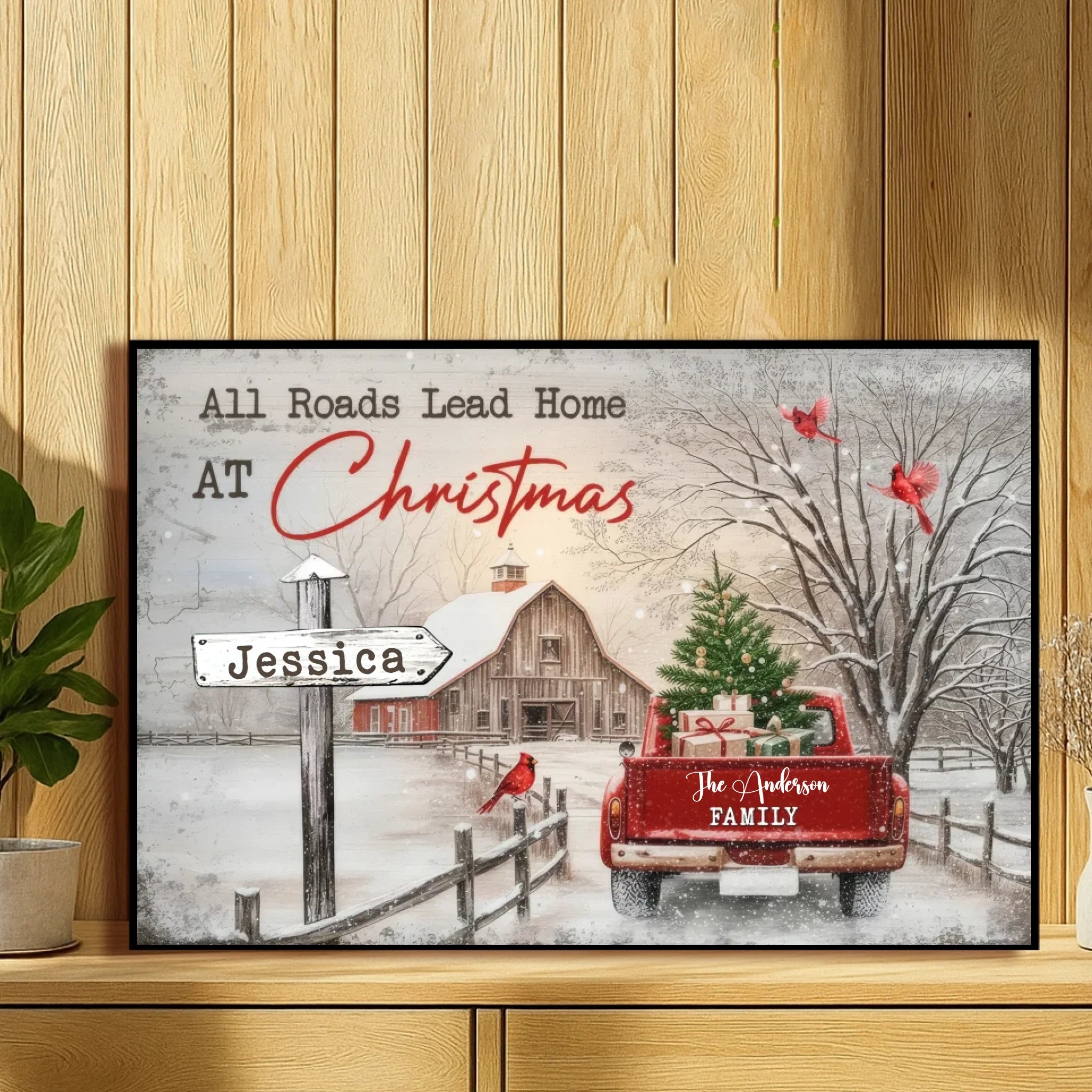 Bring the warmth of the holiday season into your home with this “All Roads Lead Home at Christmas” Personalized Poster. Featuring a cozy winter farmhouse scene, a classic red truck, and customizable family name signage, this artwork adds a heartfelt touch to your festive décor. Perfect for living rooms, entryways, or as a meaningful Christmas gift for loved ones.