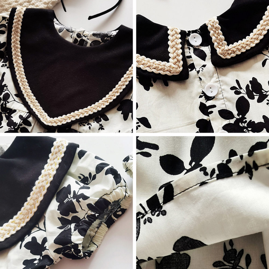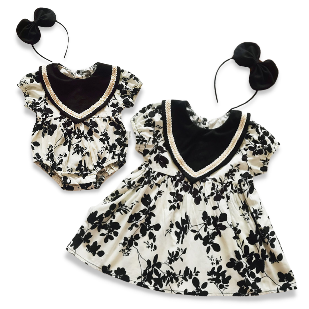Dieses Baby-Kragen-Outfit mit schwarzen, blättrigen Prints im Geschwister-Partnerlook ist ein unbestreitbar attraktives und edles Partner-Outfit für Ihre bezaubernden Mädchen! Lassen Sie Ihre Prinzessinnen ihre schwesterliche Liebe vertiefen, während sie gemeinsam die Niedlichkeit dieser modischen Outfits bewundern!