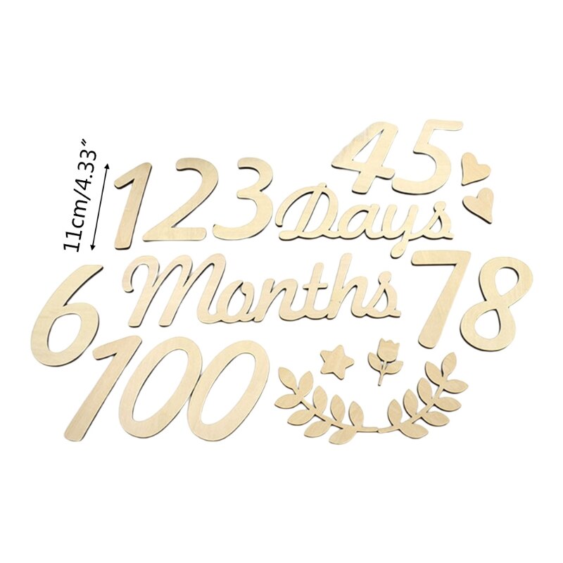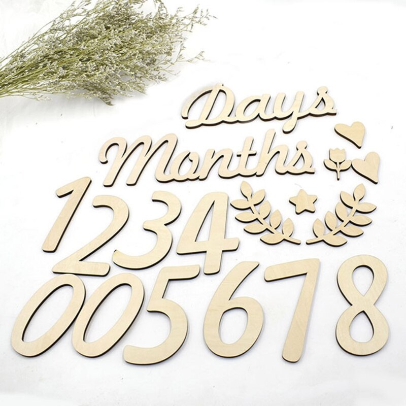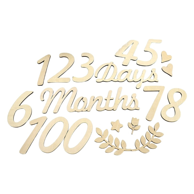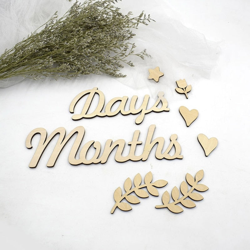 Die Ausschnitte umfassen das Wort „Tage“, „Monate“, Zahlen 0, 0, 1, 1, 2, 3, 4, 5, 6, 7, 8, 9, sowie 10 Symbole, darunter „Liebe“, „Stern“, „Blätter“ auf Holztafeln. Insgesamt enthält dieses Set 18 Ausschnittkarten. Diese wunderschön gestalteten Baby-Meilenstein-Marker sind ein einzigartiges Geschenk zur Babyparty für werdende Mütter und eine tolle Ergänzung für jede Geschenkeliste.