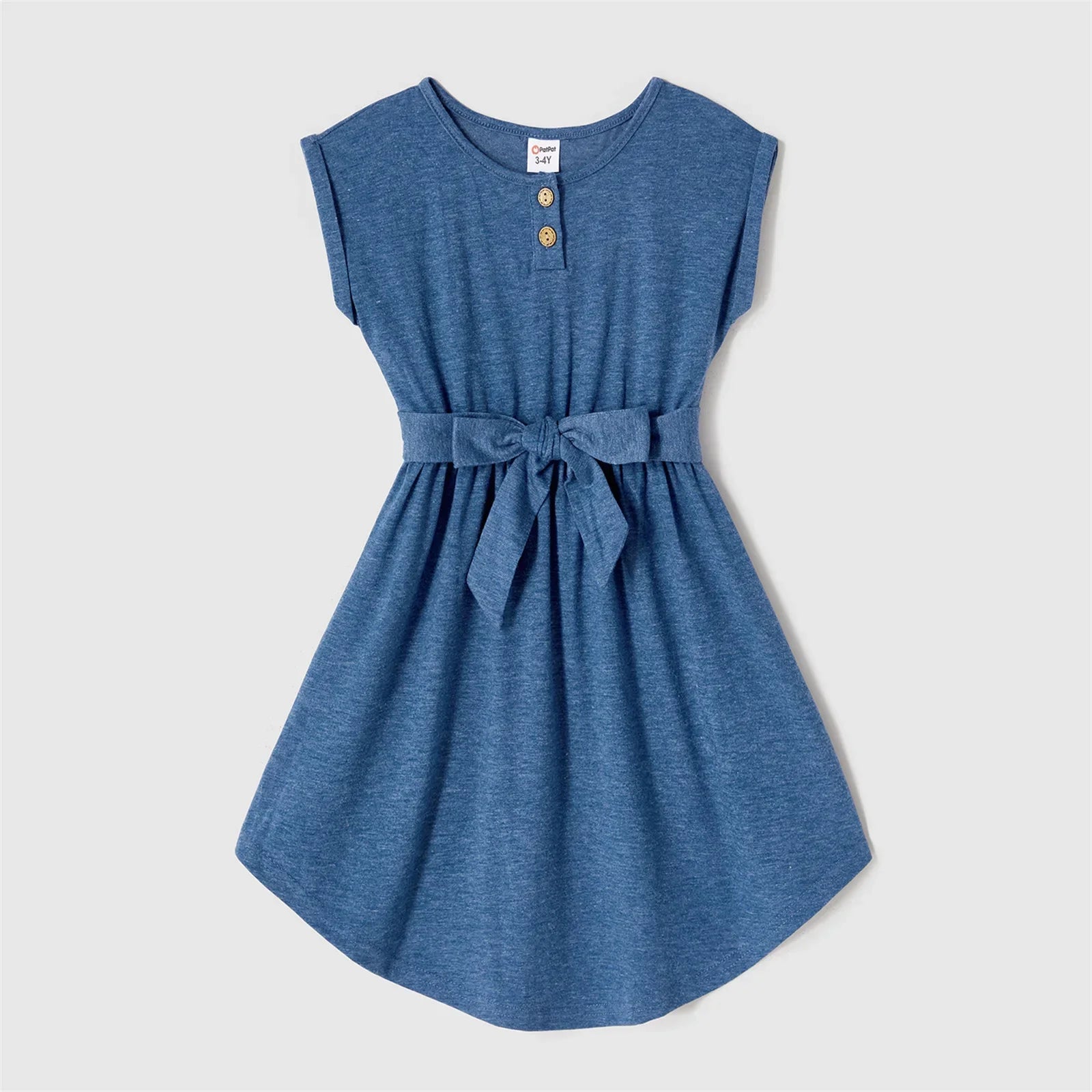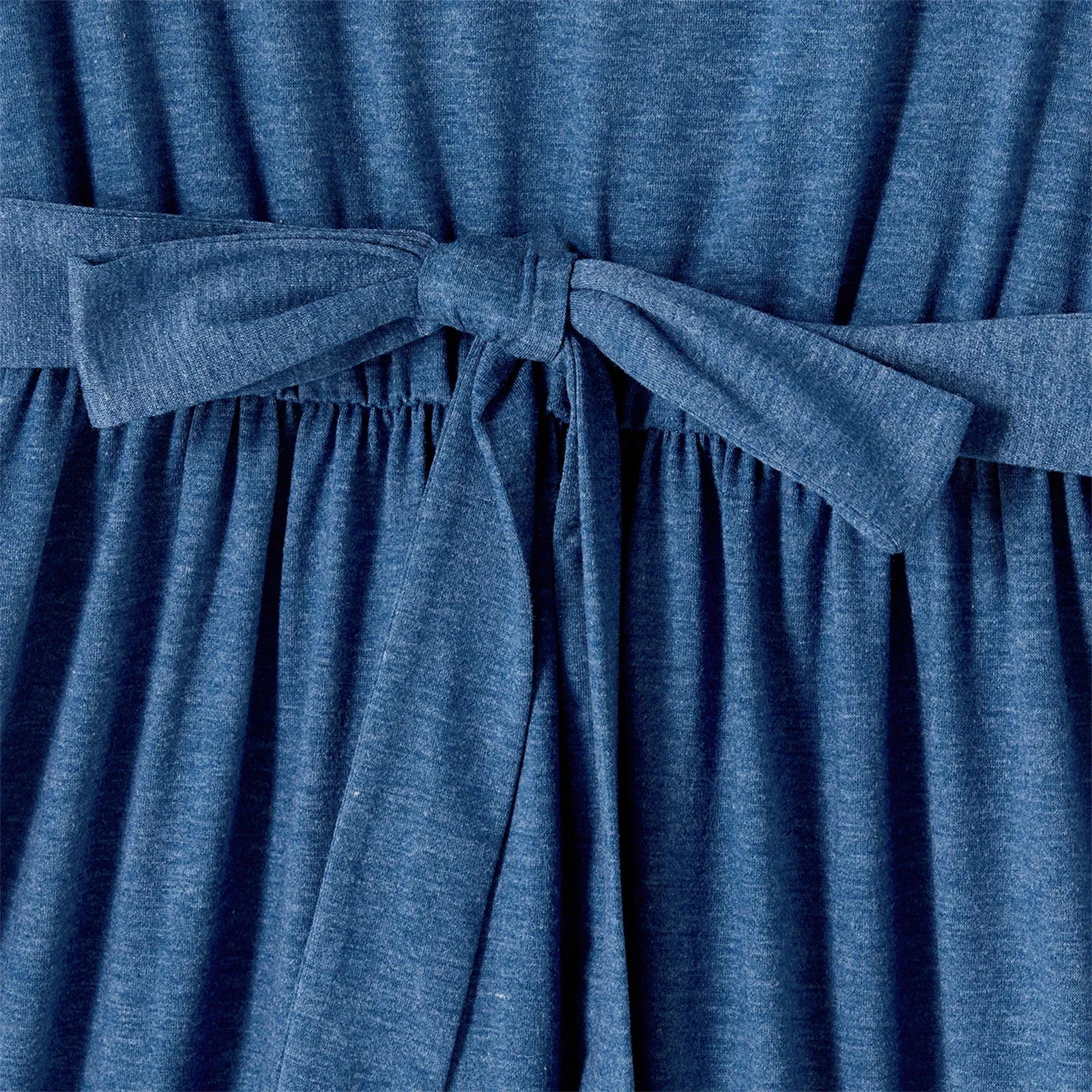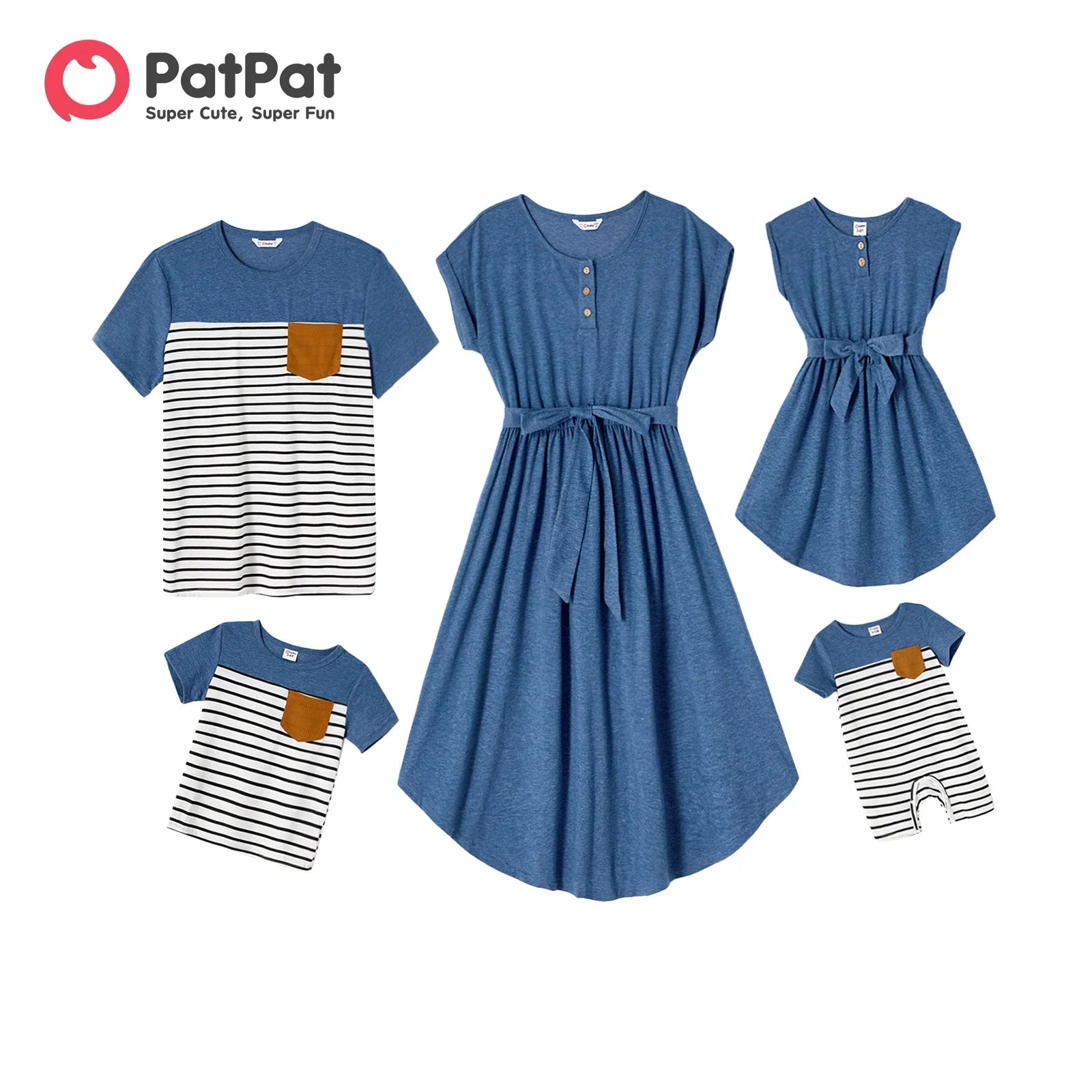 Blaue Kleider mit Gürtel und gestreifte T-Shirts-Sets für die Familie