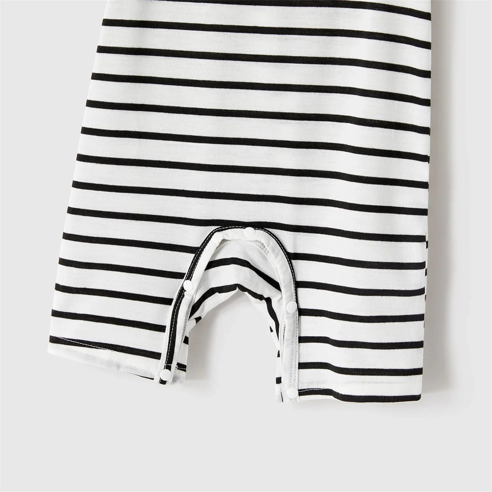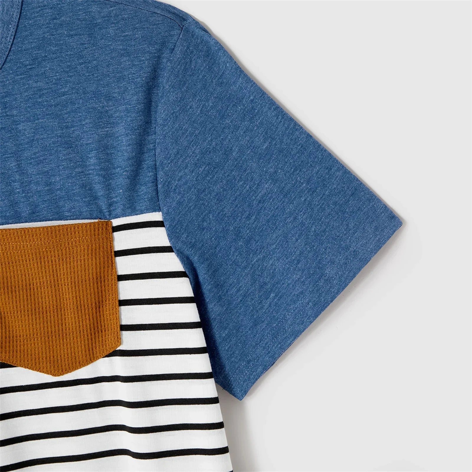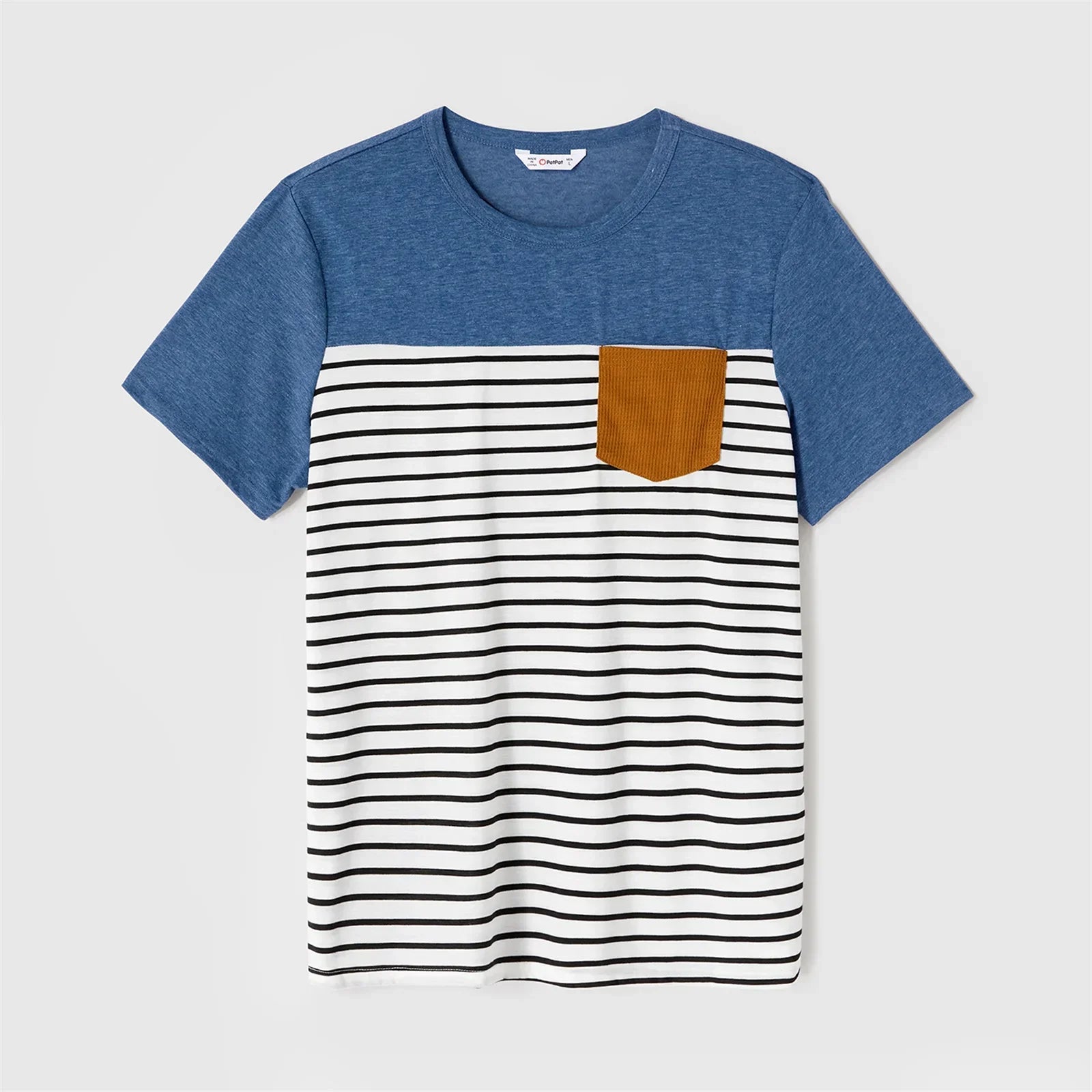Blaue Kleider mit Gürtel und gestreifte T-Shirts-Sets für die Familie