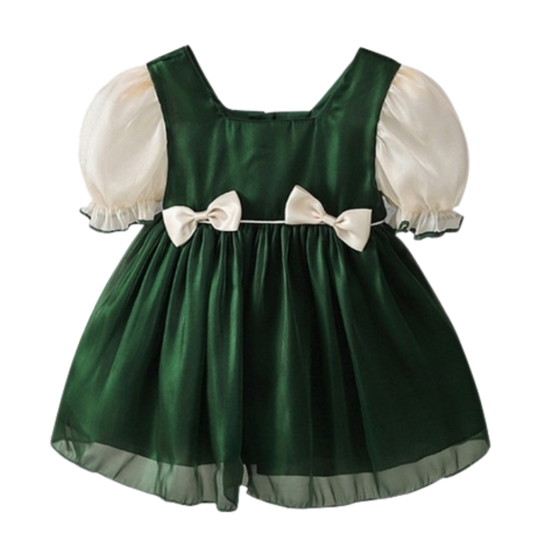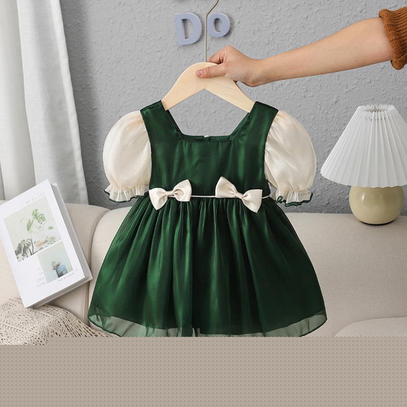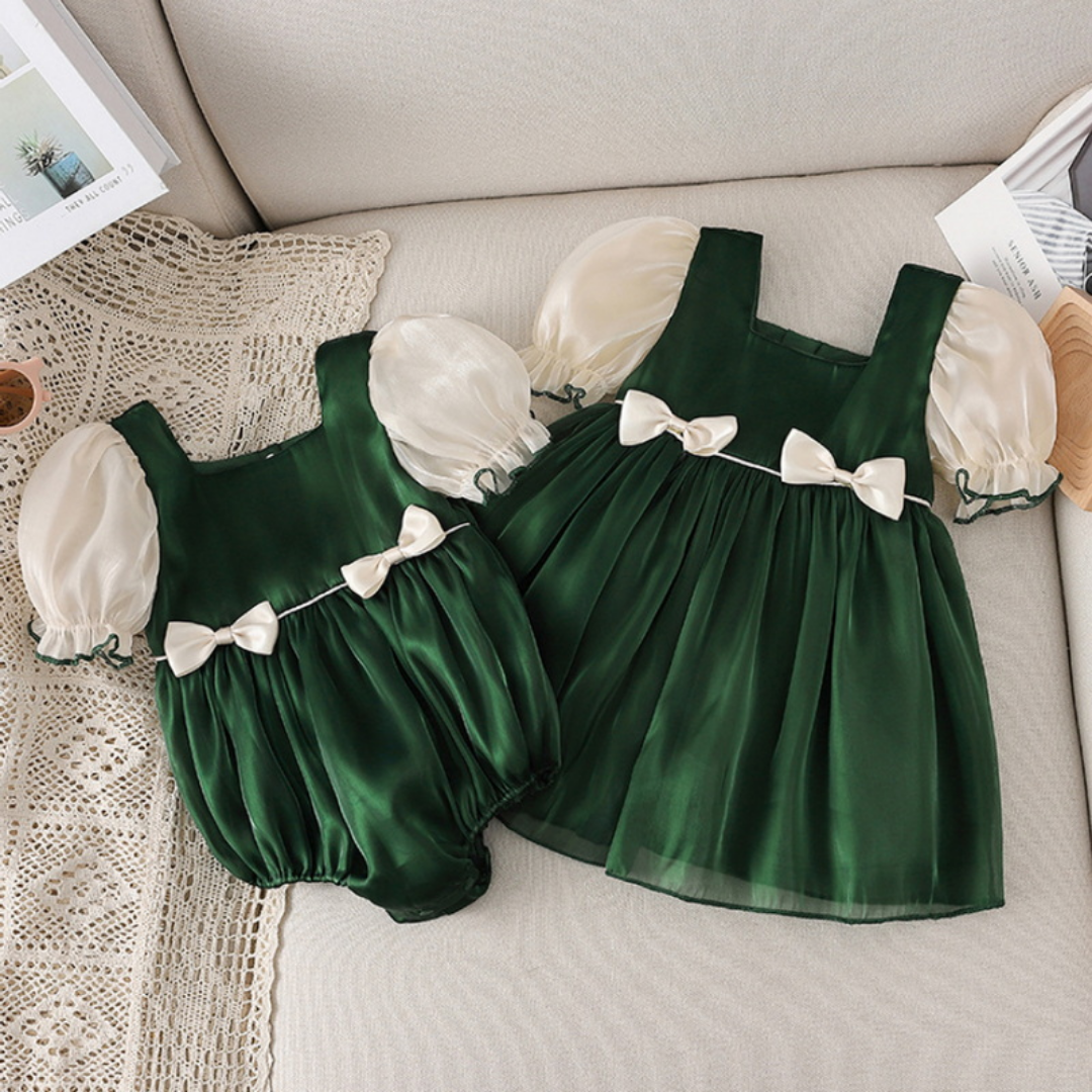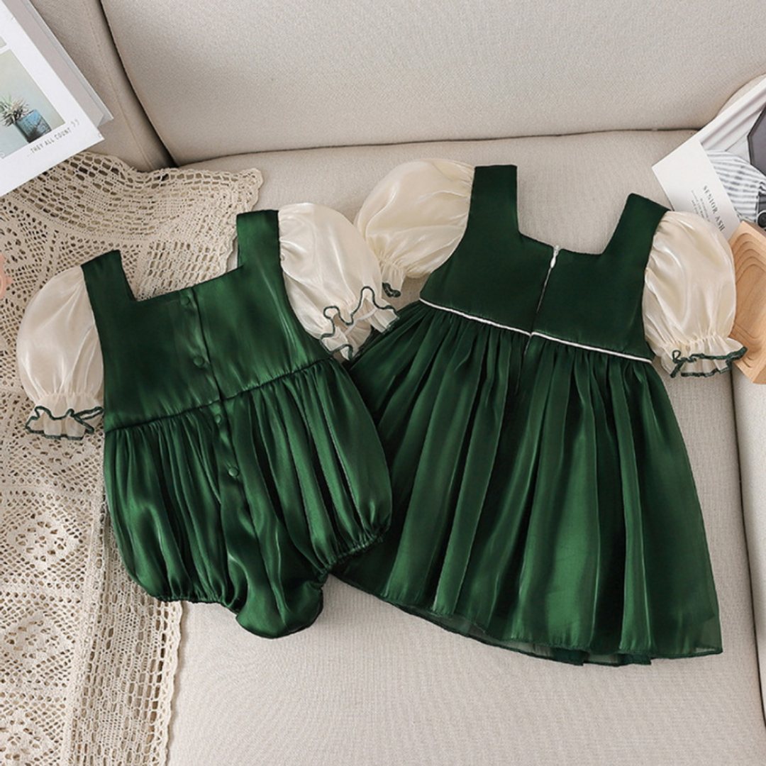 Dieses Geschwister-Matching-Outfit mit Schleifendesign und Puffärmeln bietet einen europäischen Mode-Look mit einer weißen Schleife als Akzent und Puffärmel-Stil, der den seidigen grünen Stoff ergänzt. Ein perfektes Mode-Outfit für kleine und große Schwestern bei ihrem ersten Fotoshooting oder Geburtstag zusammen.