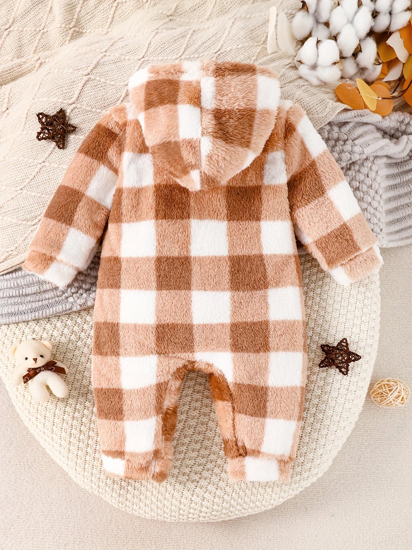 Braun karierter Baby-Strampler aus Samt mit Kapuze – Wärme für Herbst/Winter