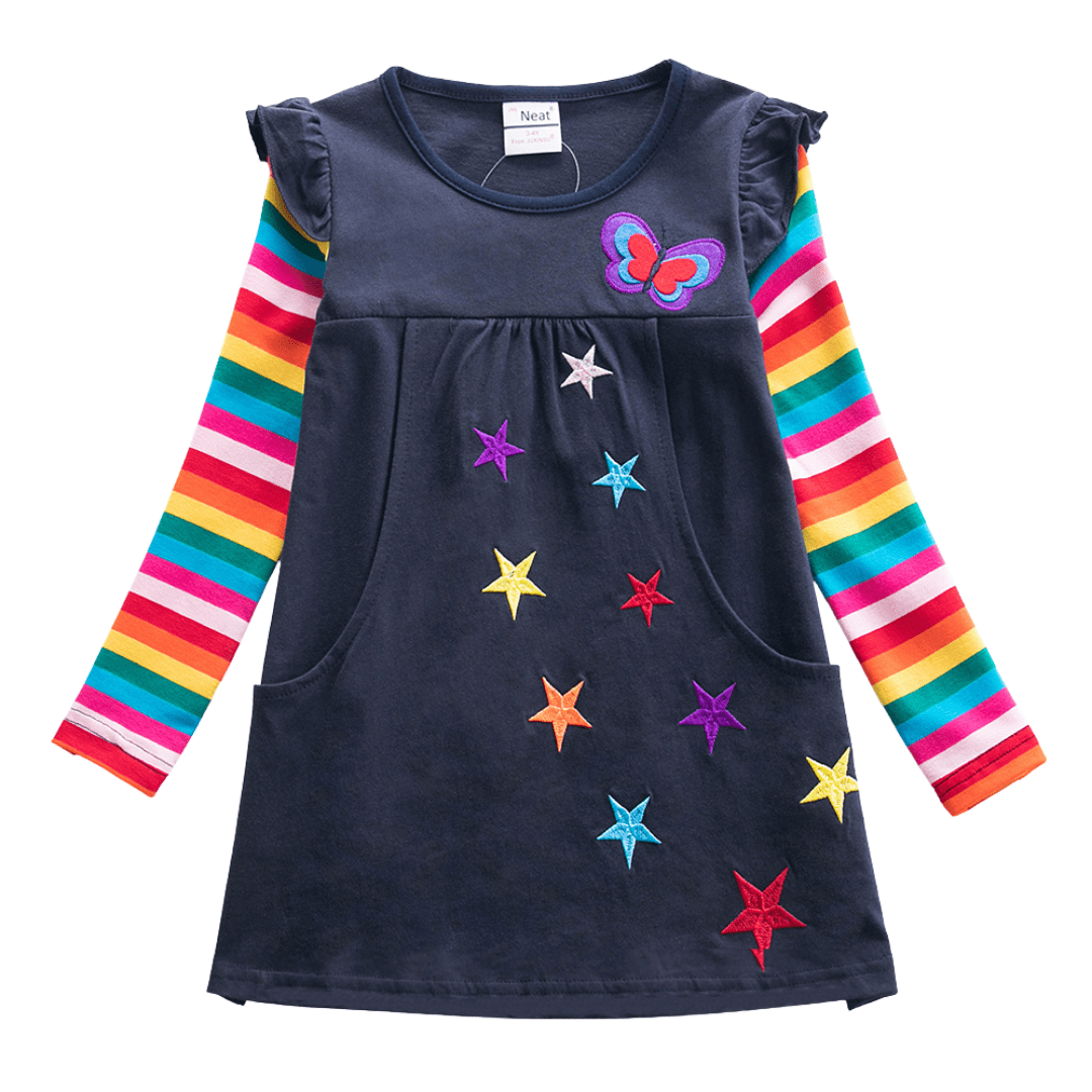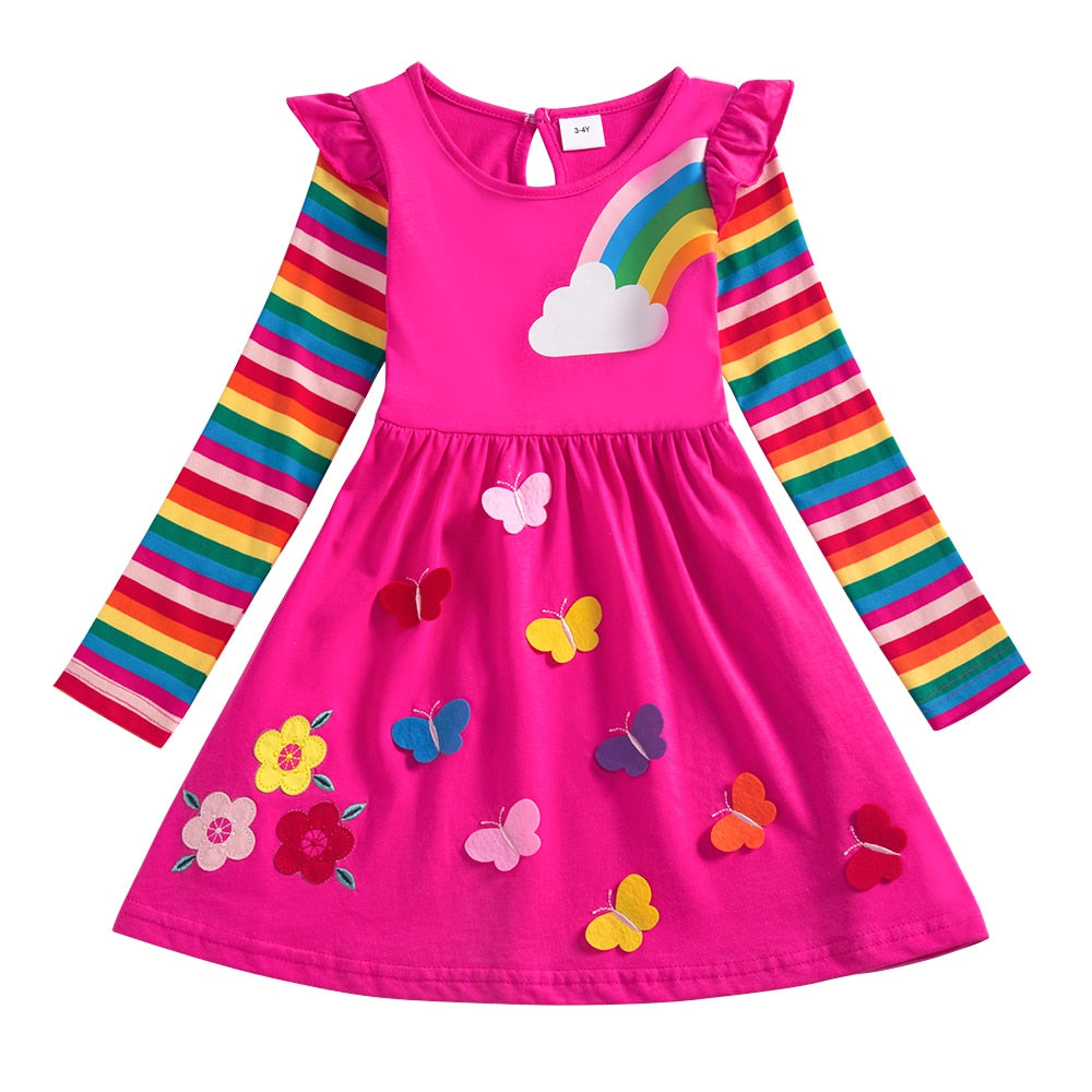 Dieses Regenbogen- und Schmetterlings-Streifenkleid mit langen Ärmeln bringt Freude und hebt die Stimmung mit seinem farbenfrohen Design. Egal zu welchem Anlass, dieses Kleid ist die perfekte Wahl für Ihr Mädchen! Tolles Geschenk für Ihre liebe Tochter!