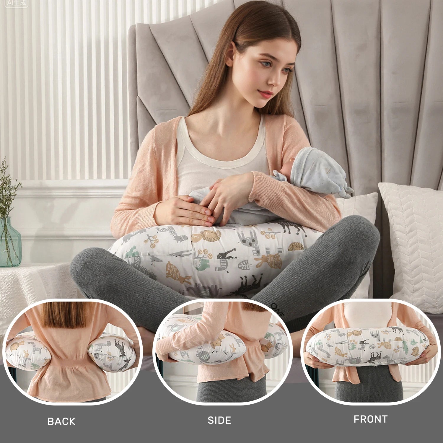 Multifunctional Use: Ideal for breastfeeding and bottle feeding. The pillow can also be used as support for tummy time for the baby (implied) or as a comfortable lumbar support for the mother (BACK use shown).