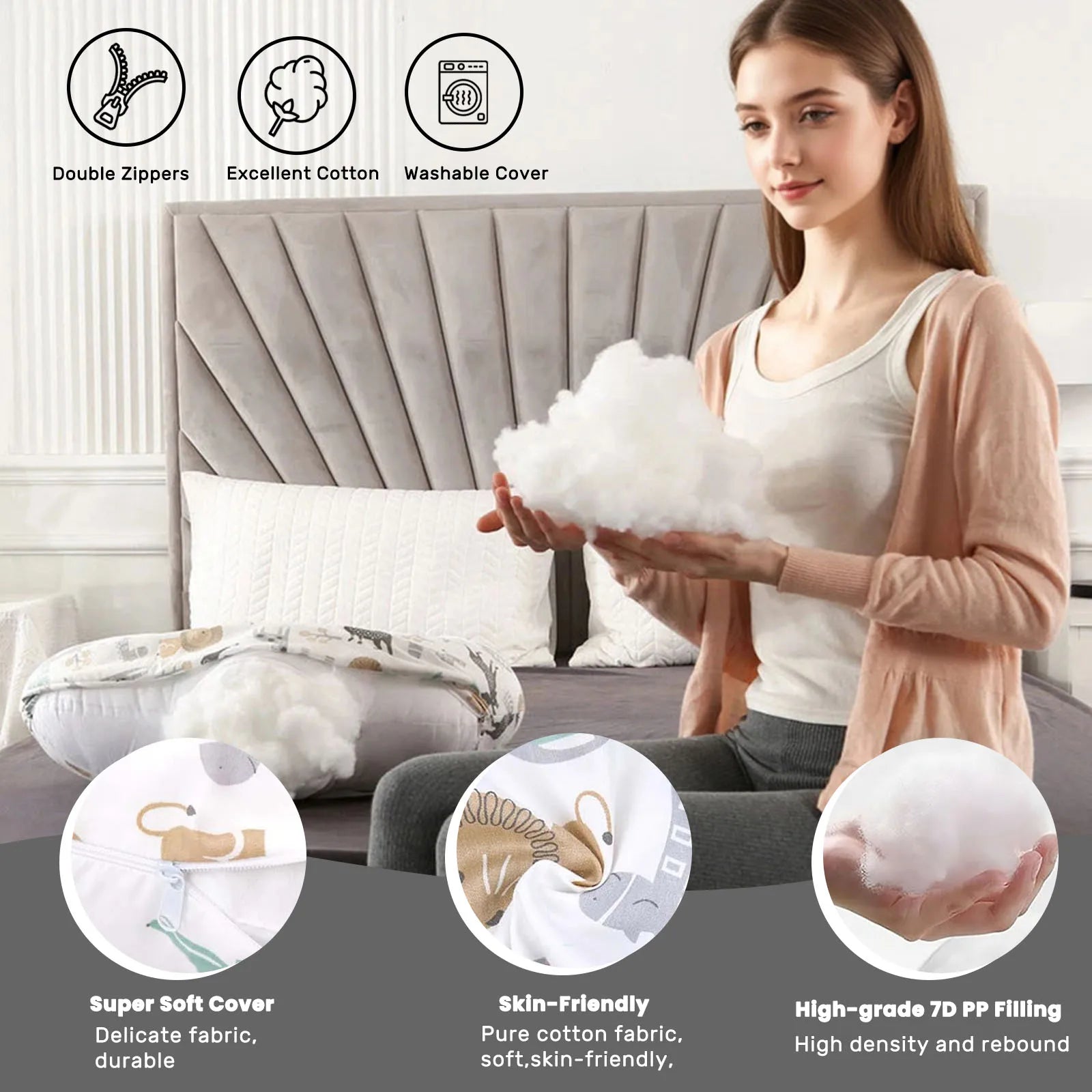 Flexible Filling: The elastic filling of the nursing pillow adapts perfectly to the desired shape, ensuring quiet and comfortable use that retains its form even after multiple washes.