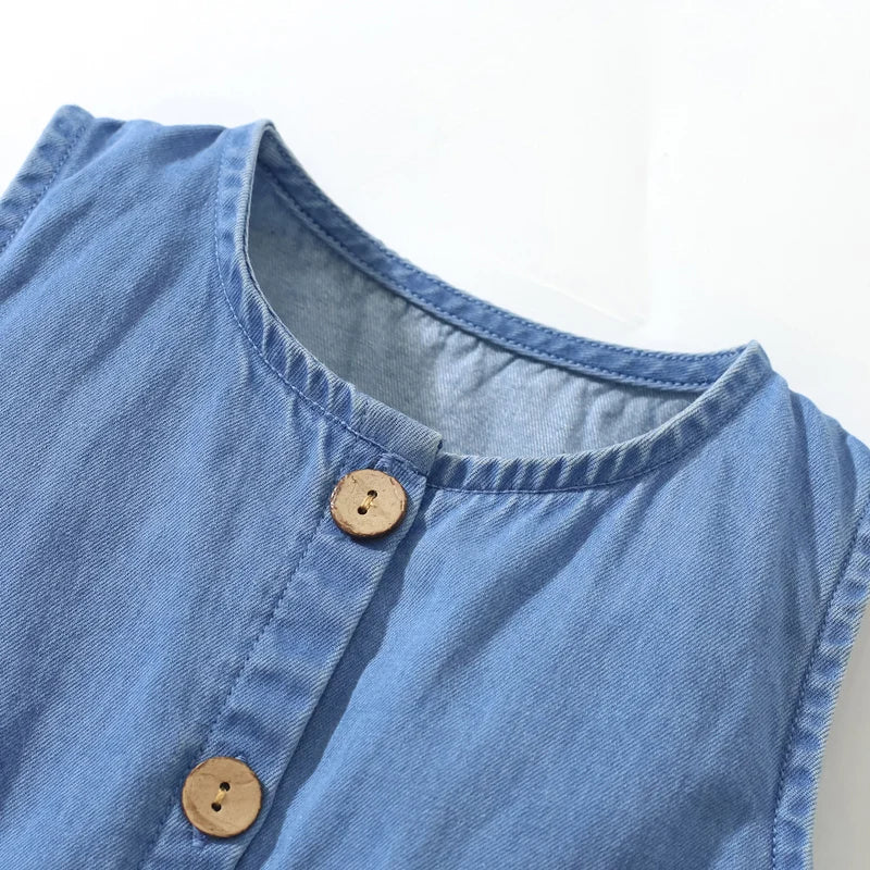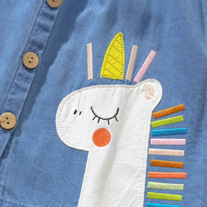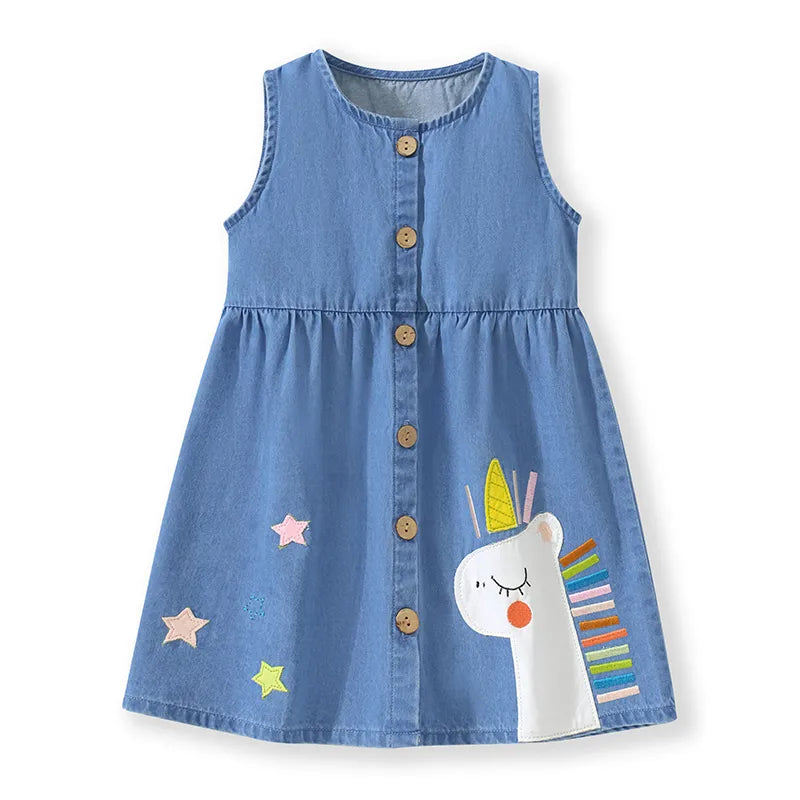 Verpassen Sie nicht die Gelegenheit, Ihrer Tochter das bezauberndste Sommeroutfit zu verpassen. Kaufen Sie noch heute unser ärmelloses Denim-Einhorn-Kleid und lassen Sie sie die ganze Saison über funkeln und strahlen.