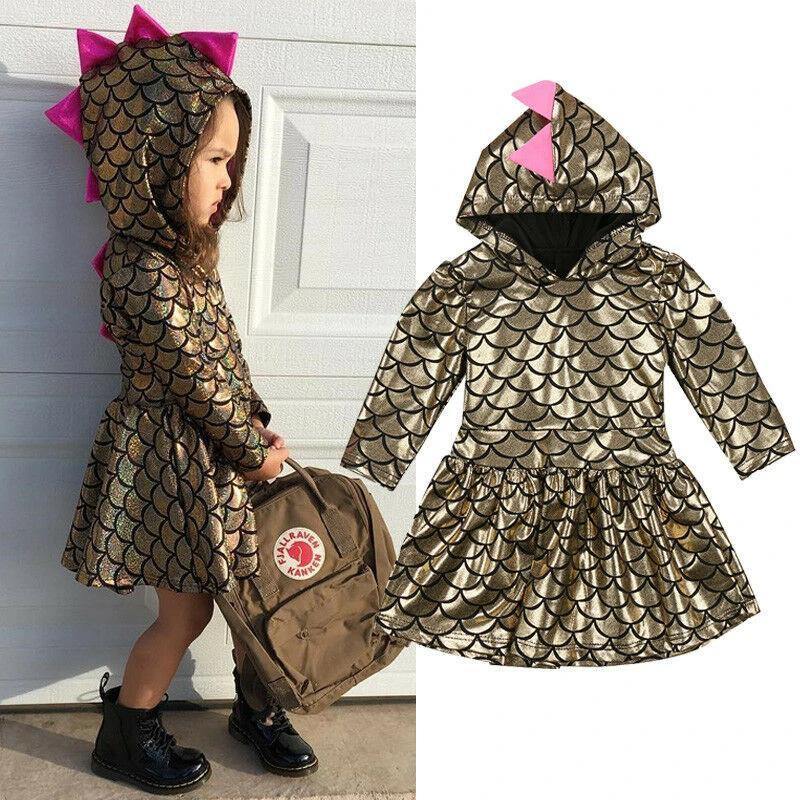 Dinosaurier-Kapuzenkleid ist ein stilvolles Outfit für Mädchen. Der schimmernde goldene Stoff fällt auf eine einzigartige Weise auf und zieht die Aufmerksamkeit aller um sich herum auf sich!