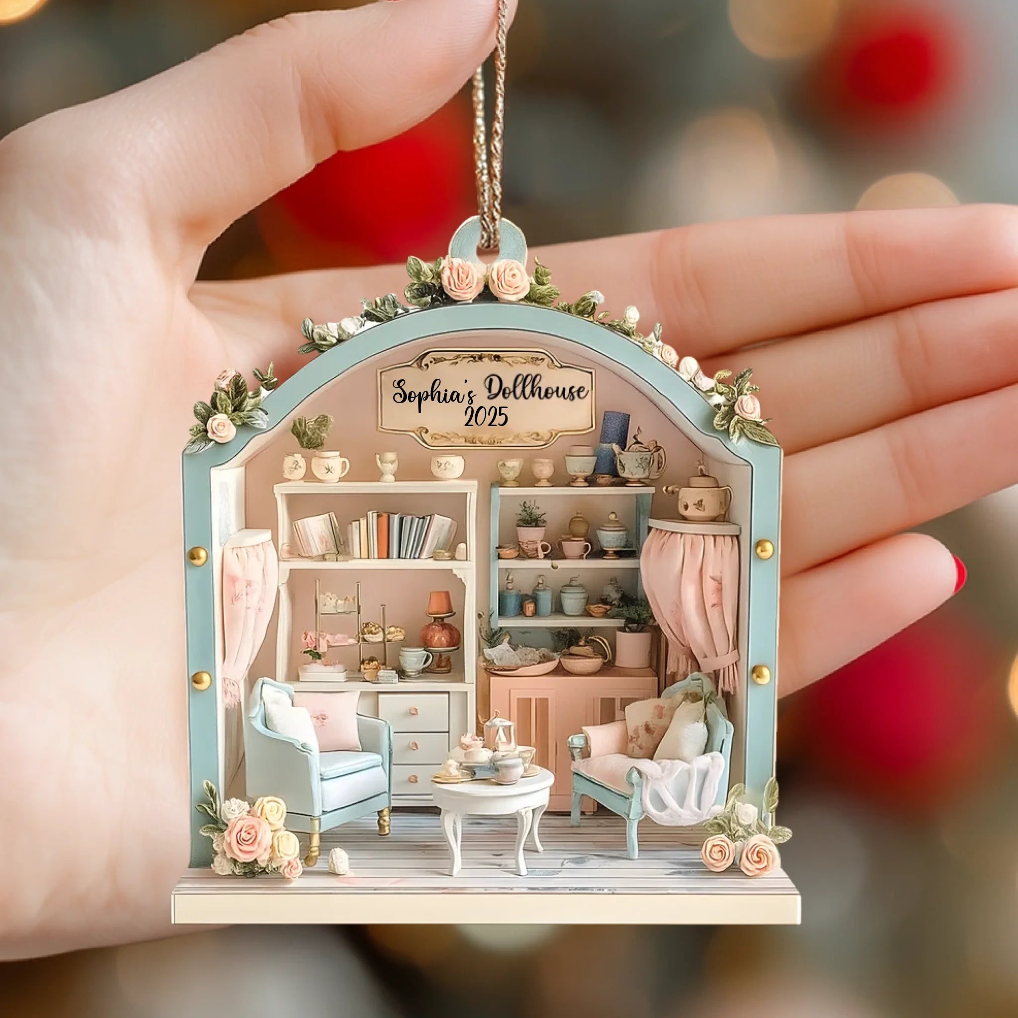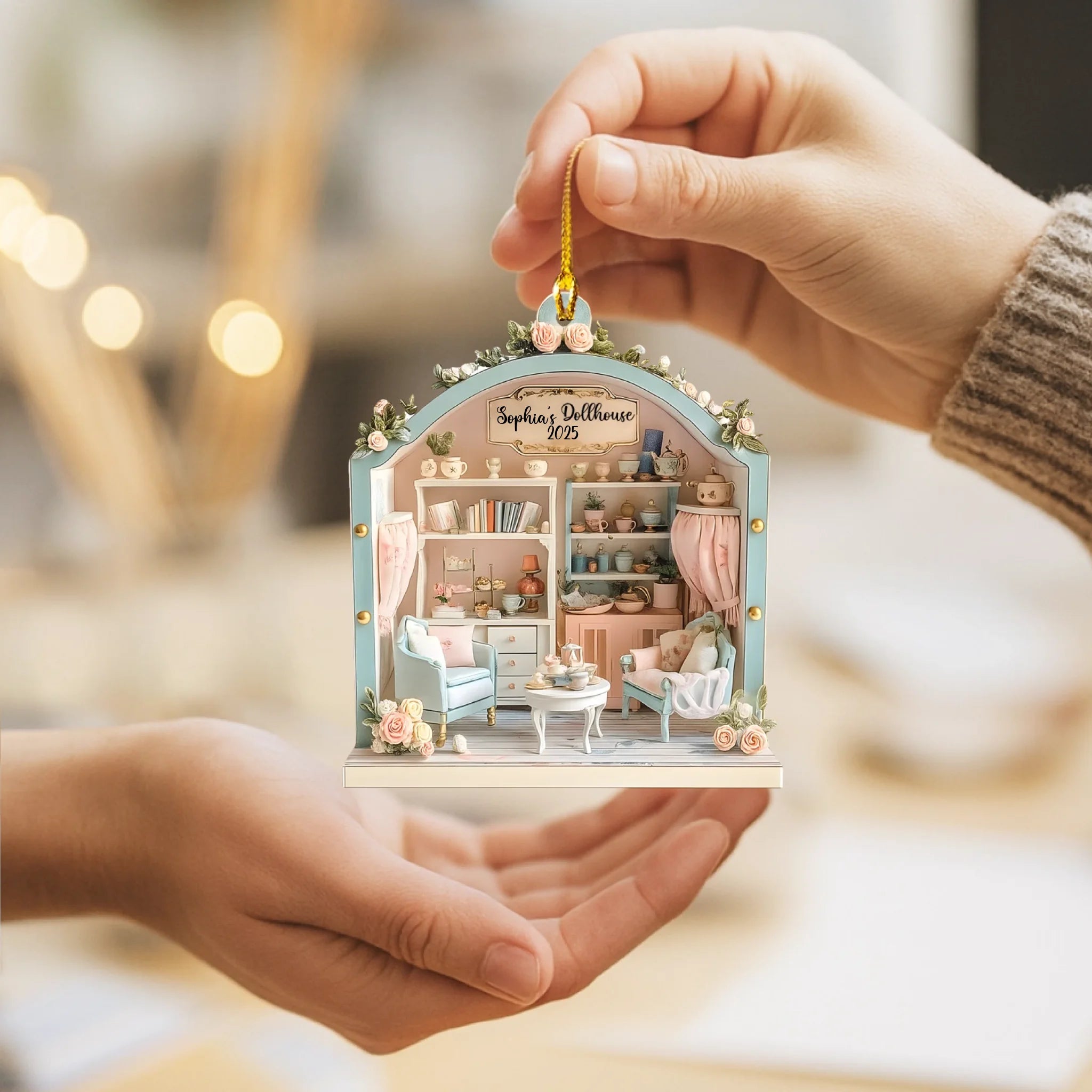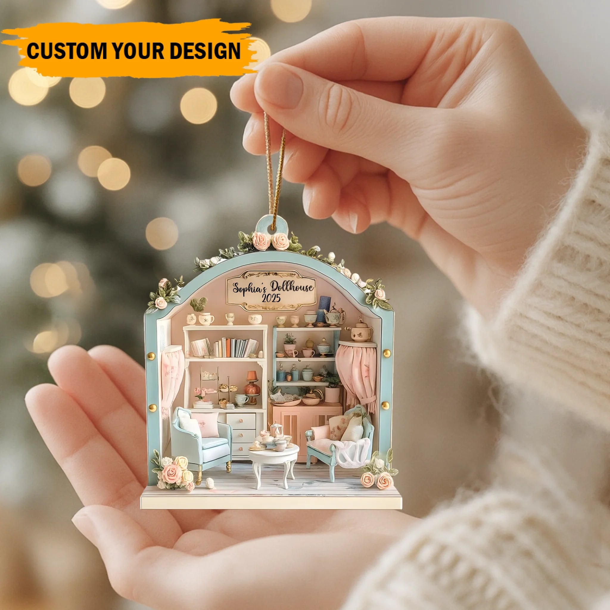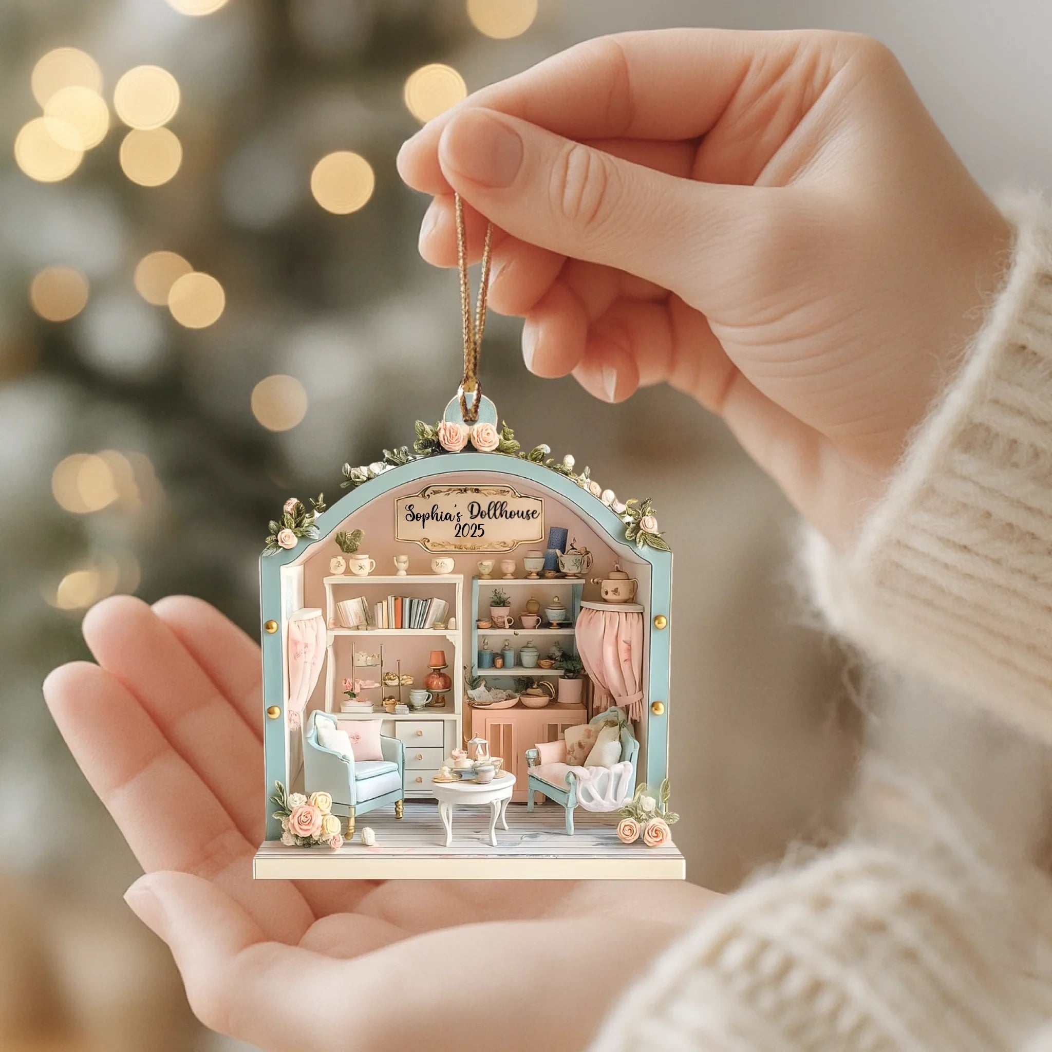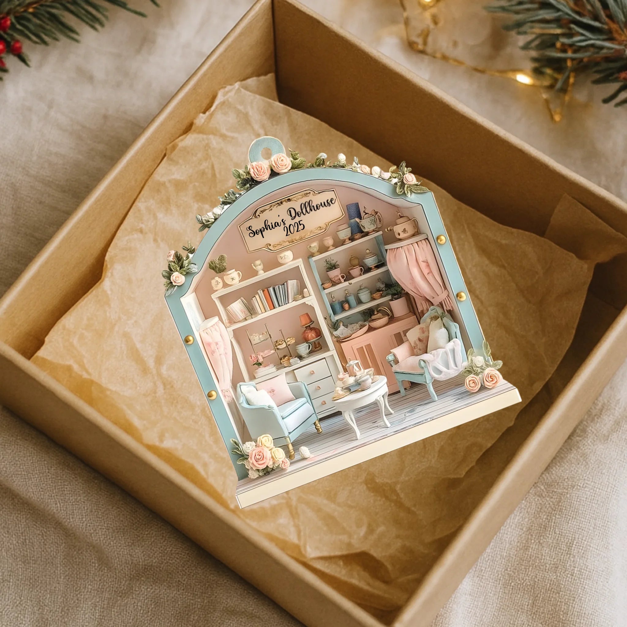 Inspired by the cozy beauty of a miniature home, this custom ornament captures the warmth of family moments and childhood nostalgia.