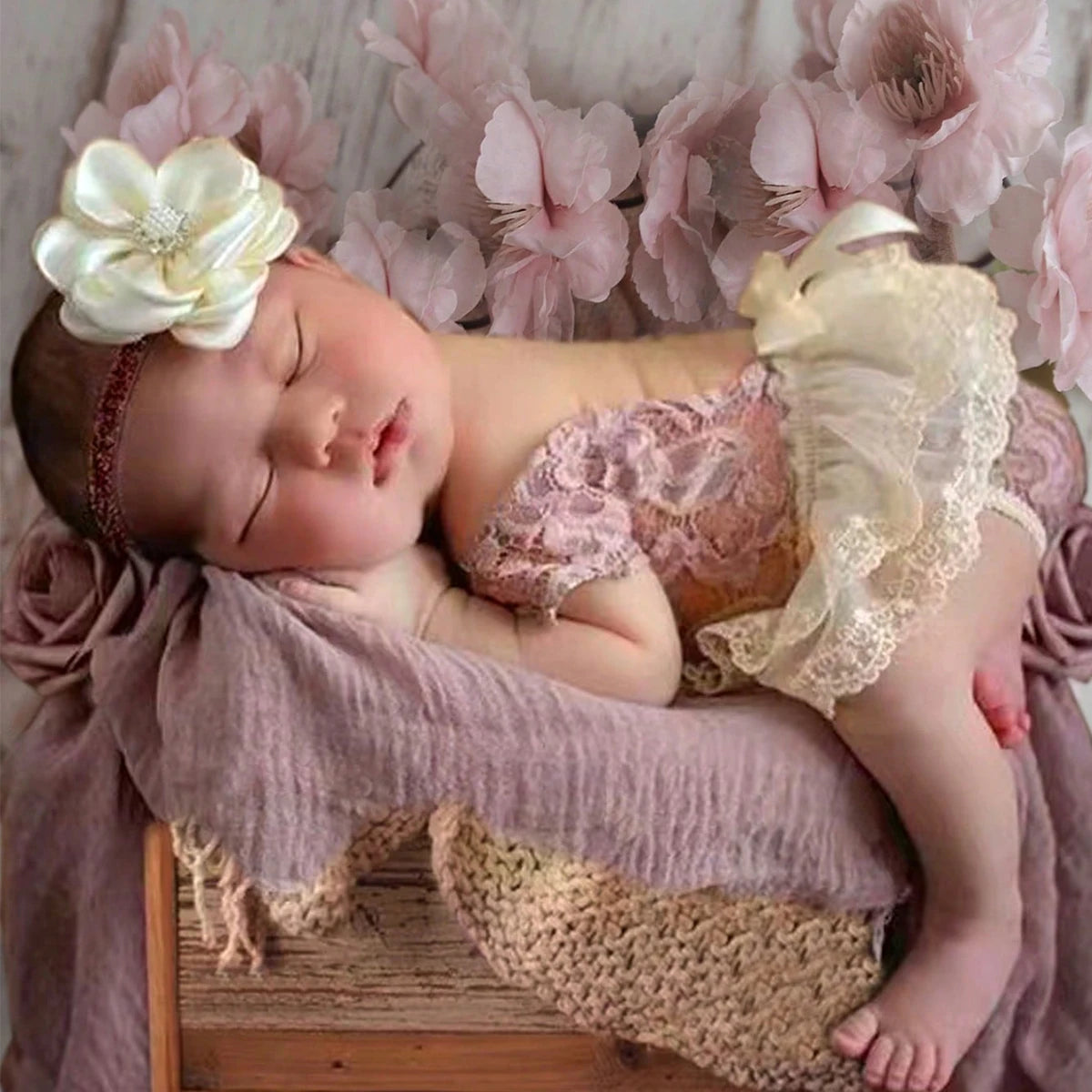 Halten Sie die schönsten Momente Ihrer kleinen Prinzessin mit unserem bezaubernden staubrosa Outfit-Set für Neugeborene Mädchen für Fotoshootings fest. Dieses Set ist perfekt für Neugeborenen-Fotoshootings und enthält einen zarten Spitzen-Strampler und bezaubernde Blumen-Haaraccessoires. Hier sind die Details:
