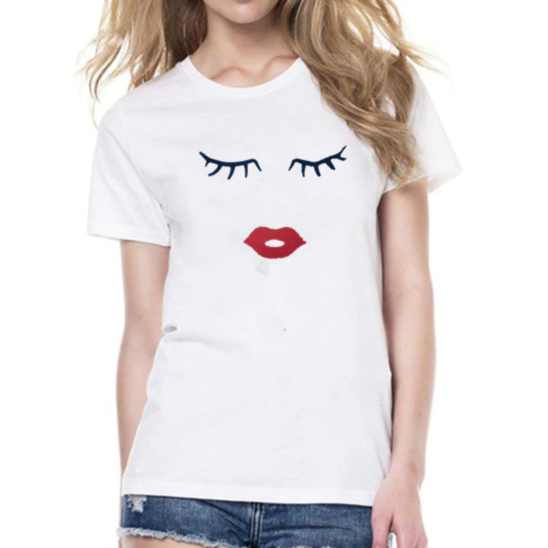 Camiseta Combinada Mamãe e Filha Estampa Olhos com Cílios e Lábios Vermelhos