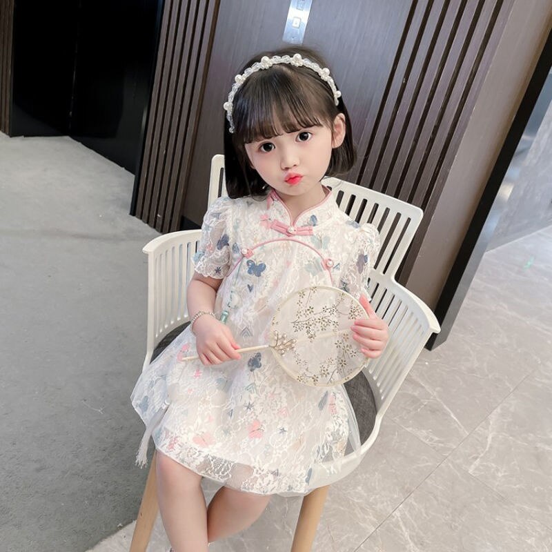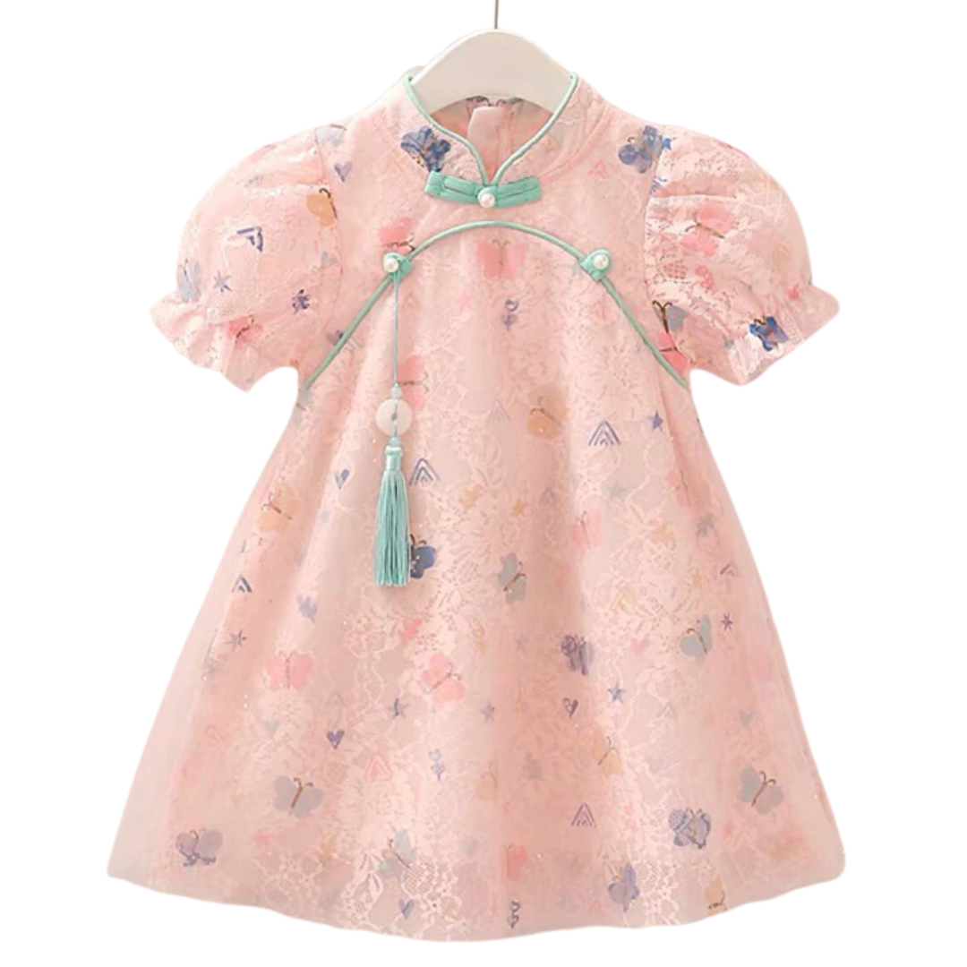 Dieses Cheongsam-Kleid für Babys mit Blumenmuster aus Spitze und Schmetterlings-Design ist sehr weich, angenehm zu tragen, langlebig, atmungsaktiv und leicht zu waschen. Die Qualität dieses Kleides ist sehr attraktiv und perfekt für OOTD im Urlaub, bei Festen oder zu anderen besonderen Anlässen.