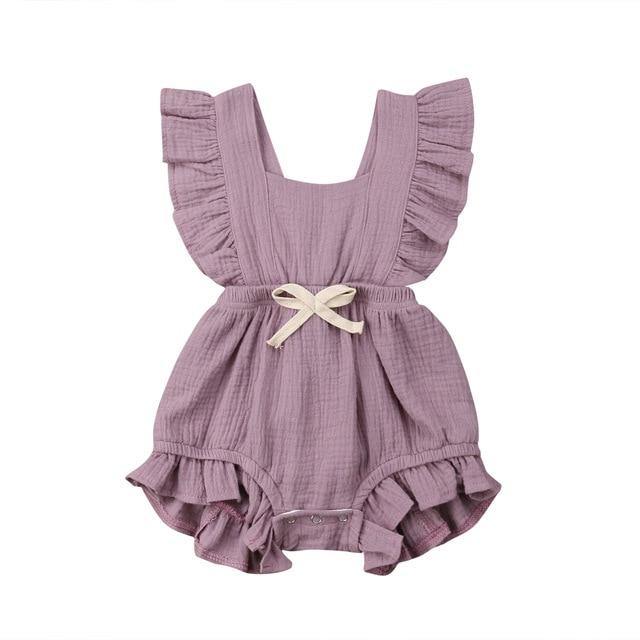 Die Taille ist elastisch, um perfekten Sitz zu gewährleisten, und wird durch eine Schleife weiter hervorgehoben. Die Rückseite des Einteilers verleiht einen Vintage-Kleid -Look mit tiefem V-Ausschnitt und Rückenriemen , das zu einer Schleifenknoten. The snap buttons at the end are convenient for fast diaper changes.
