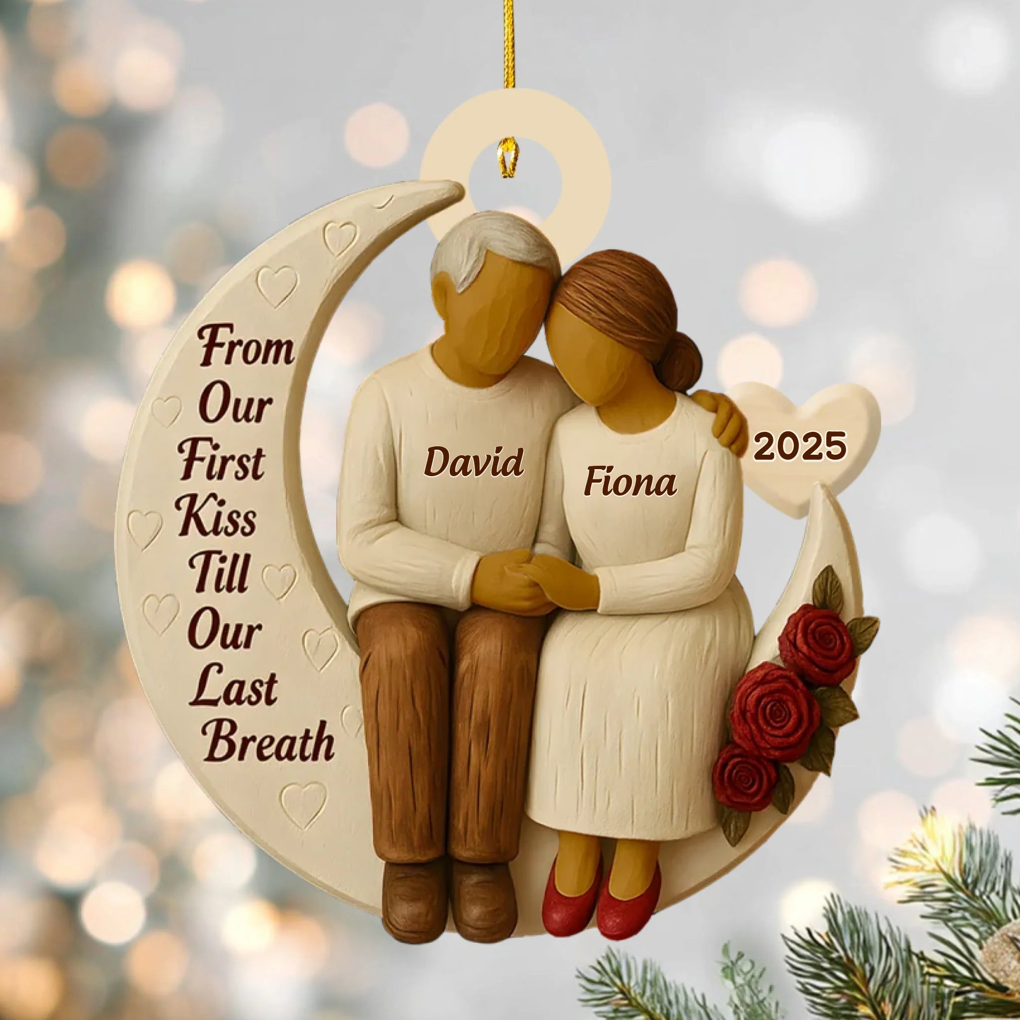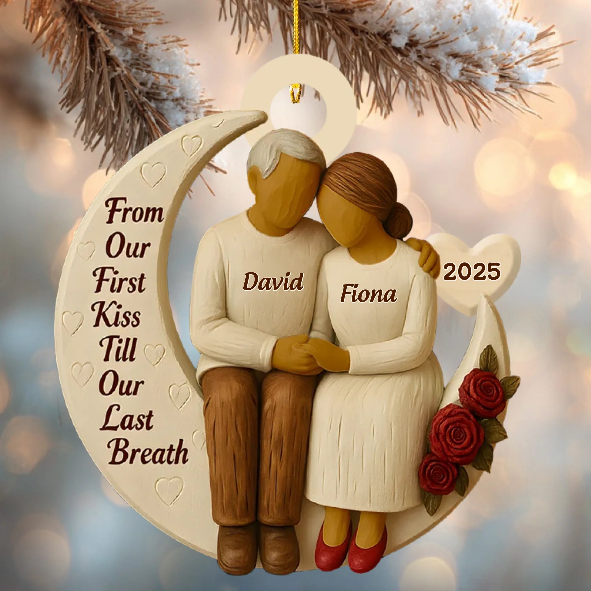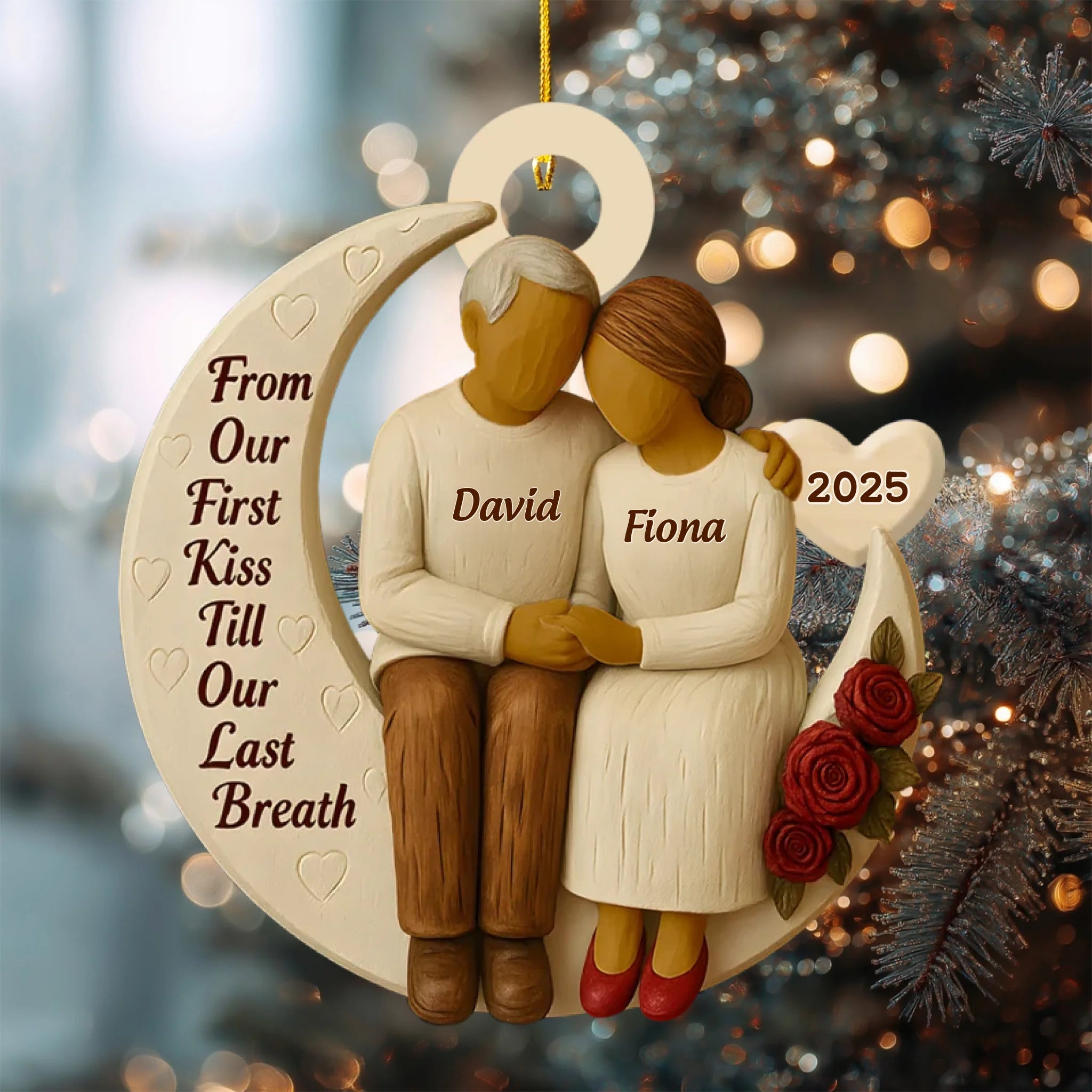 Add your names and year to create a one-of-a-kind keepsake that symbolizes your journey together — from your very first kiss to forever. It’s not just an ornament; it’s a timeless reminder of love that never fades.