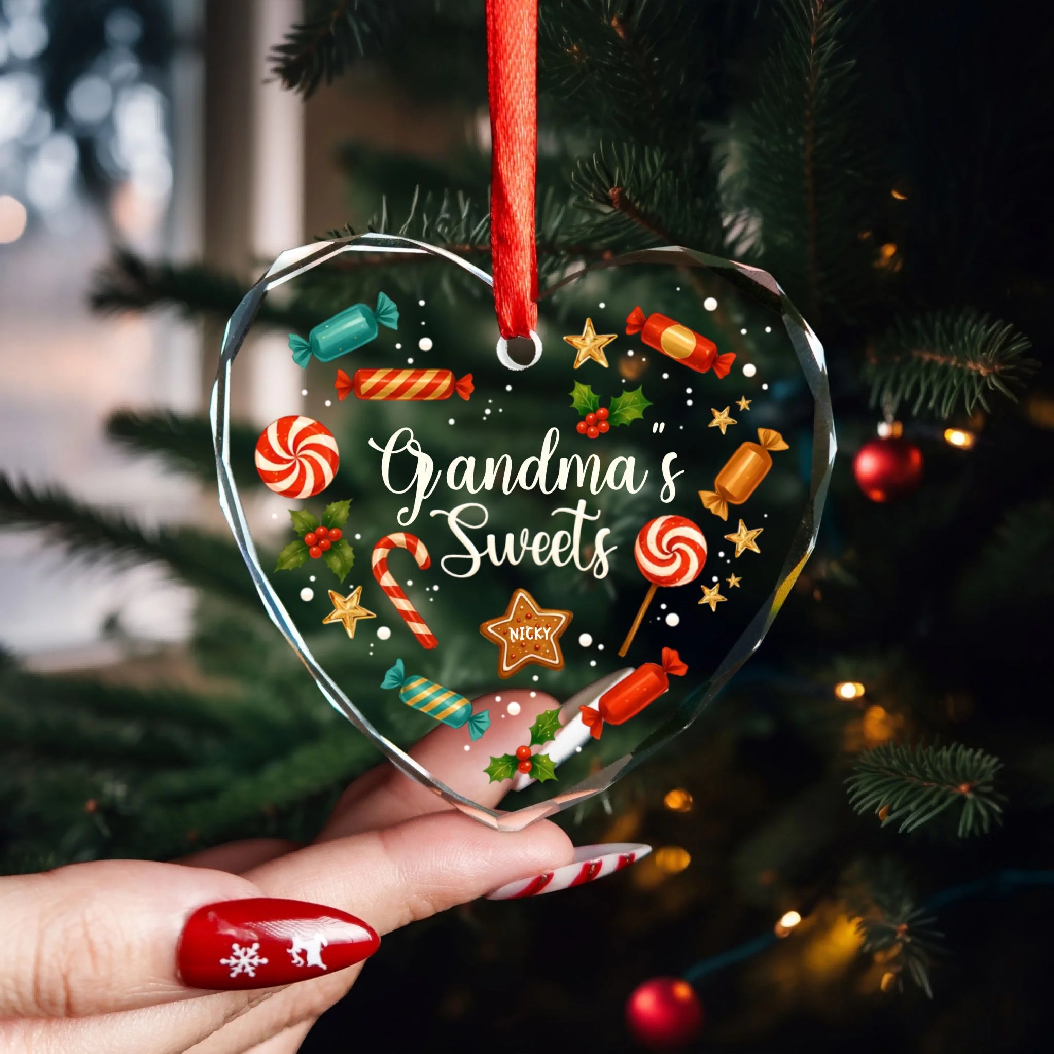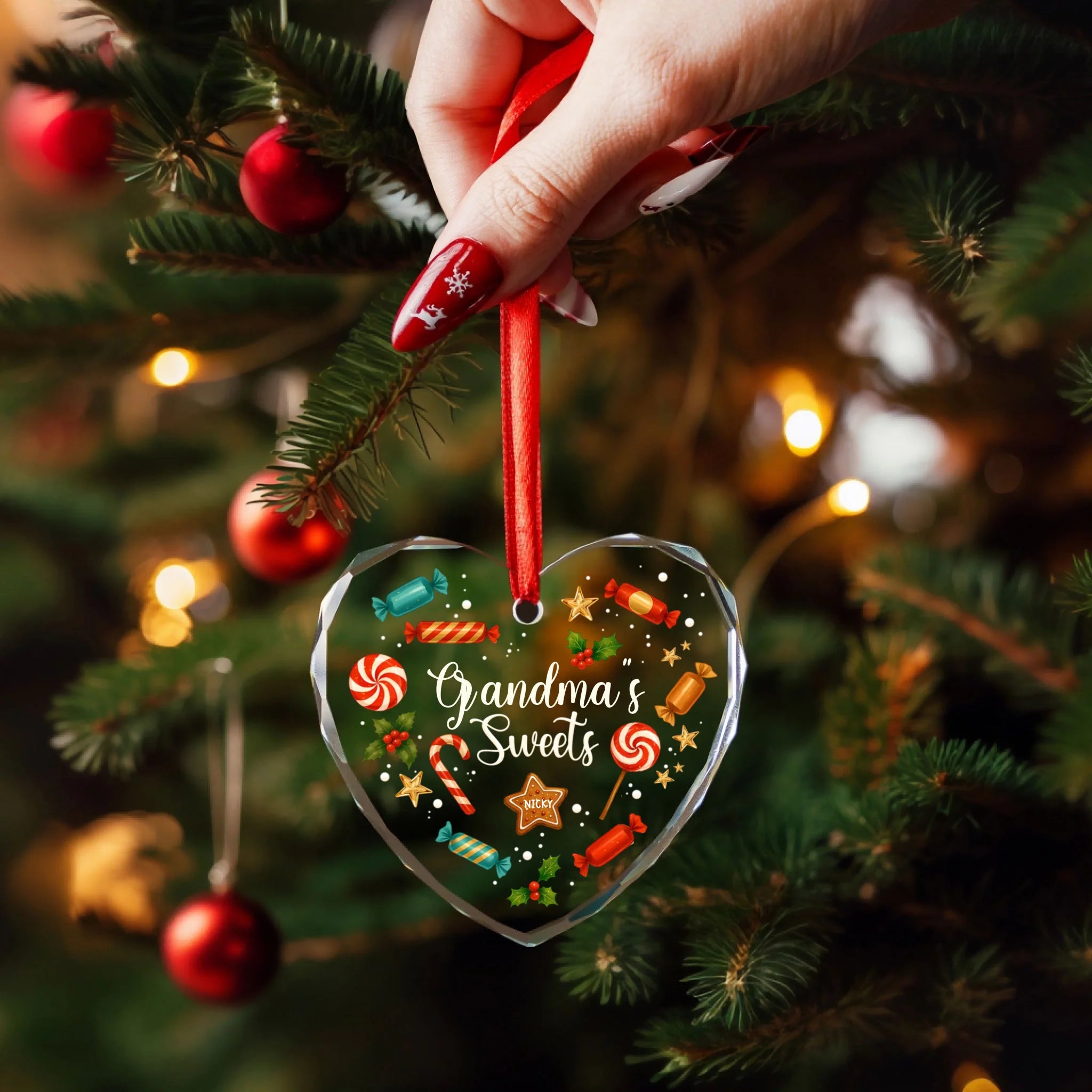 Personalisiertes „Omas Süßigkeiten“ Weihnachts-Herzglasornament – Individuelle Namen von Oma und Enkeln
